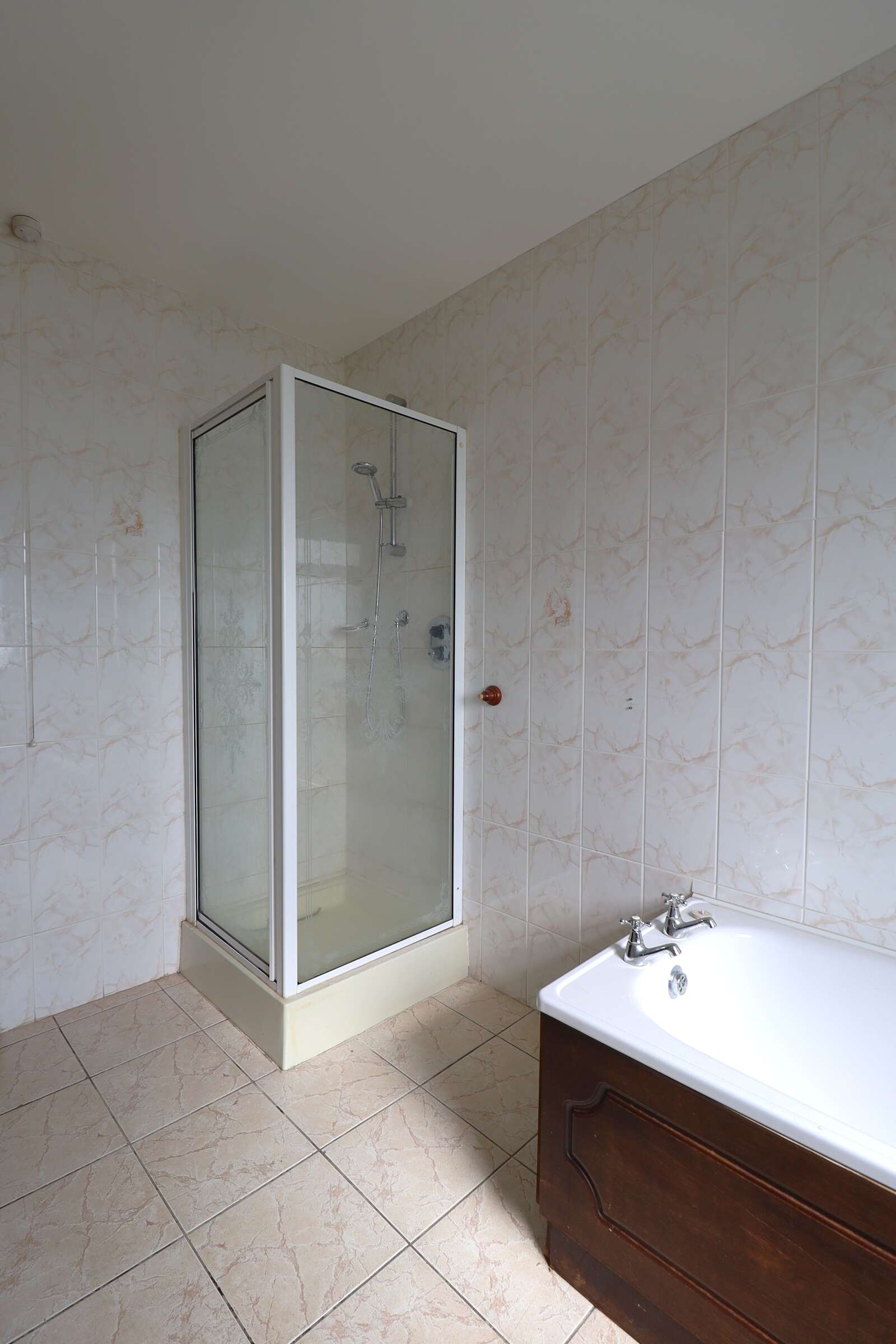 Rear aspect privacy window. Tiled flooring. Bath. Corner shower enclosure. Pedestal wash hand basin and w/c. single radiator.