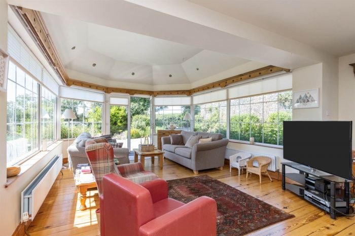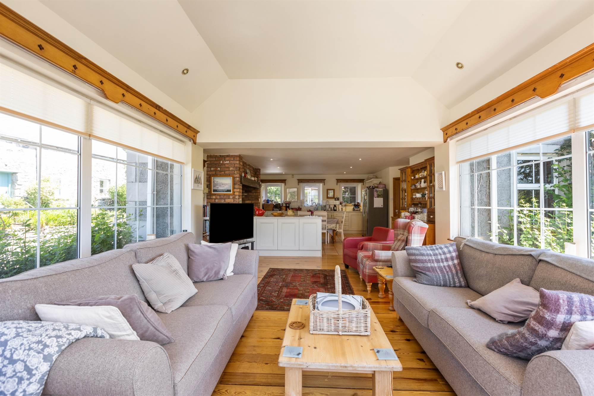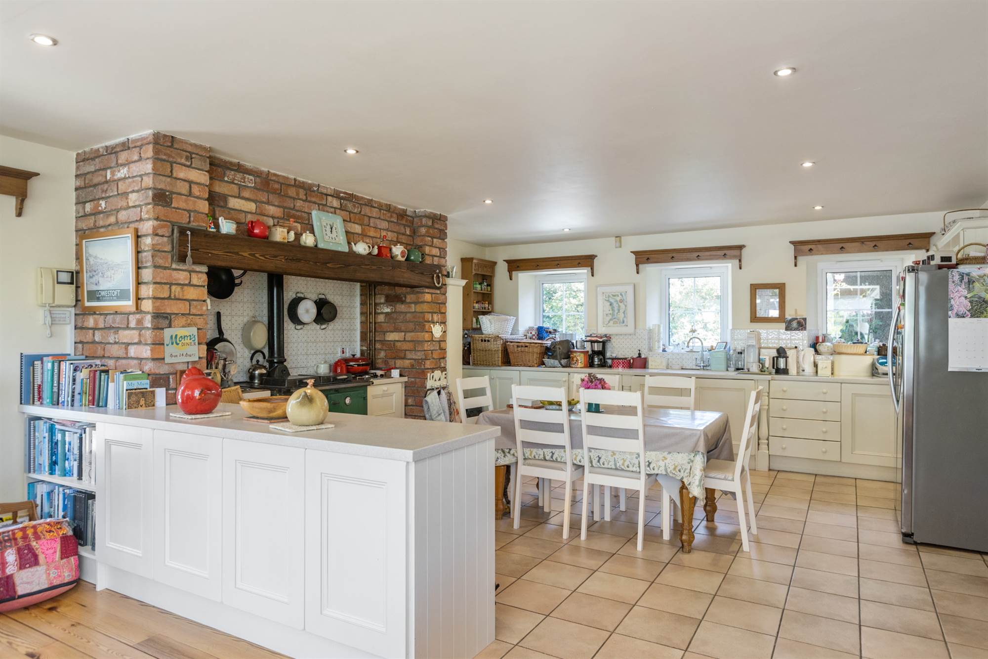 White twin tub sink unit with mixer taps, range of high and low level cream painted oak units, Corian work surfaces, Cream Aga range (installed early 2024), 2 ring gas hob, sleeper mantle with Inglenook and Belfast Brick, plumbed for dishwasher and washing machine, plumbed for American style fridge freezer, concealed lighting, wall tiling, ceramic tiled floor, LED recessed spotlighting, Canadian pitch pine floor to Sun Room area, beautiful views over gardens, recessed spotlighting and uPVC double glazed French doors to side.