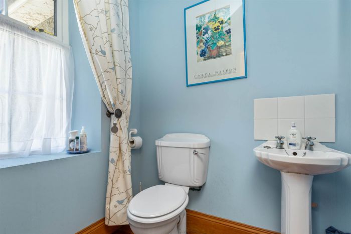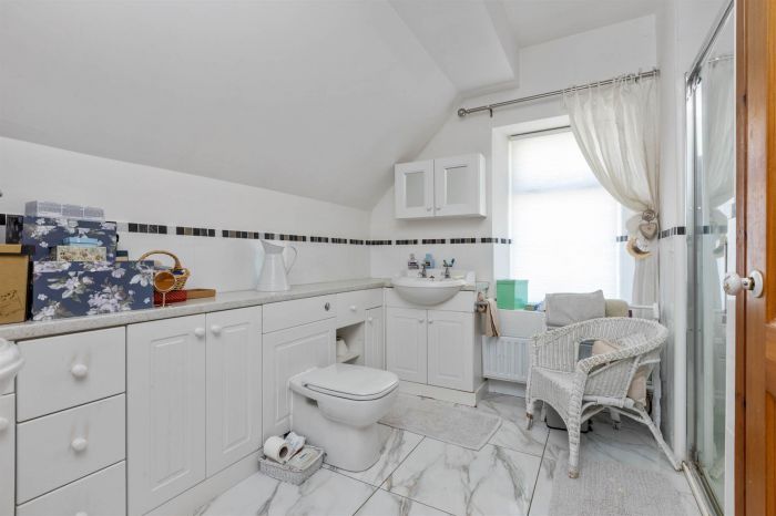 White suite comprising: Separate fully tiled shower cubicle with Aqualisa thermostatically controlled shower, built in vanity units and cupboards, twin wash hand basins, push button WC, concealed cistern, wall tiling, marble effect ceramic tiled floor, extractor fan, access to roofspace, concealed hotpress with copper cylinder and immersion heater.