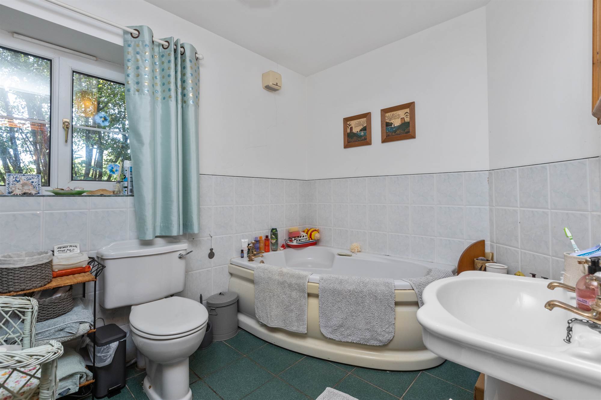 White suite comprising: Panelled corner bath, separate fully tiled shower cubicle with Mira thermostatically controlled shower unit, pedestal wash hand basin, low flush WC, wall tiling, ceramic tiled floor, extractor fan.