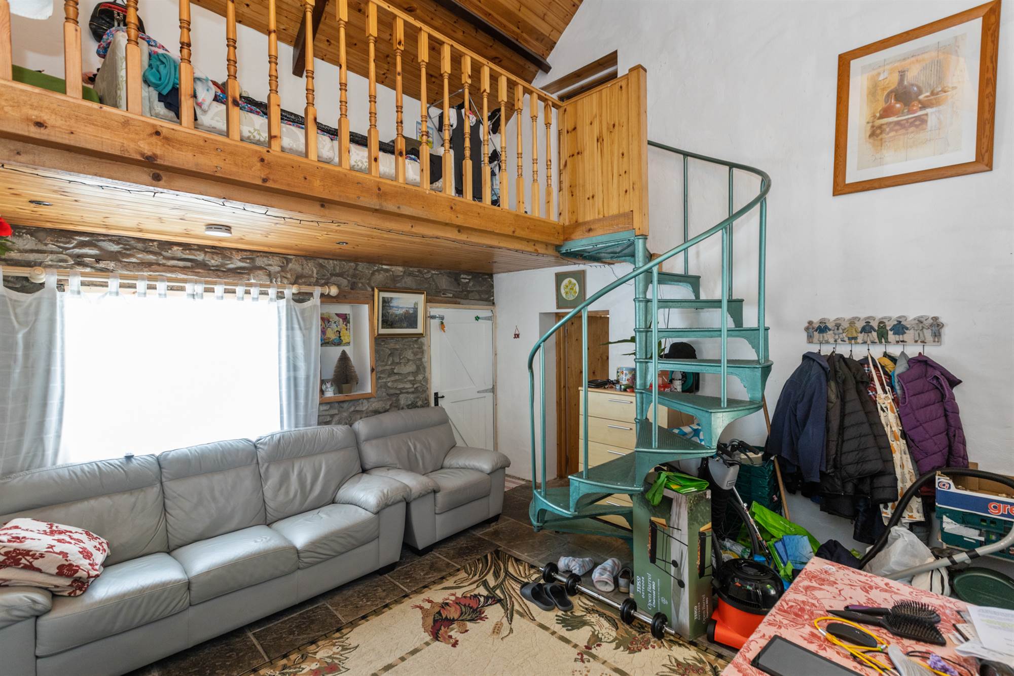 Cottage style fireplace, sleeper mantle, wood burning stove, double height ceiling, flagstone floor, spiral staircase to First Floor, timber door to rear, exposed beams.