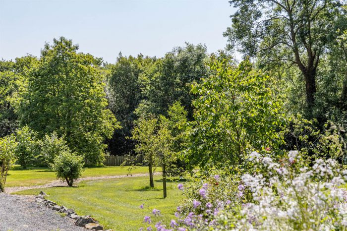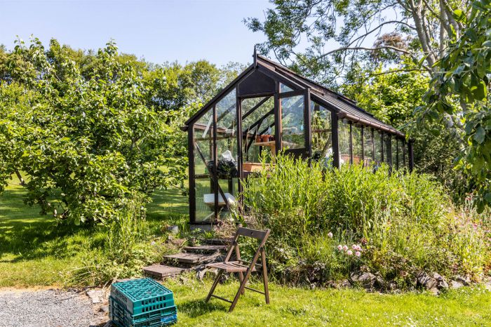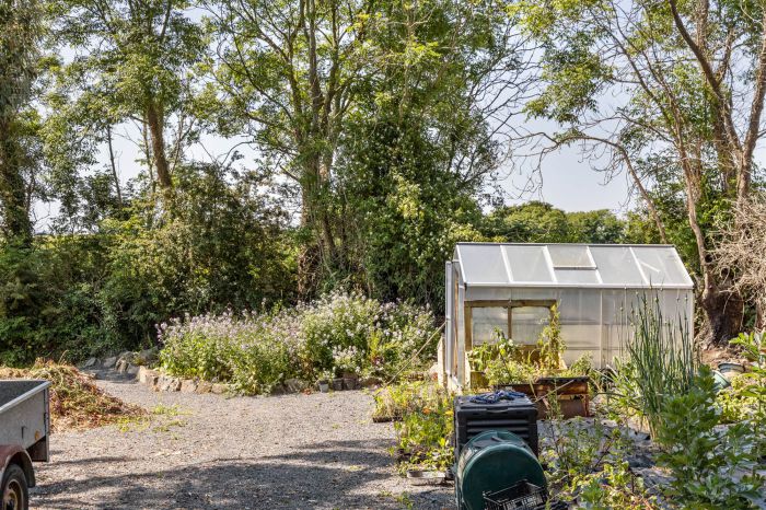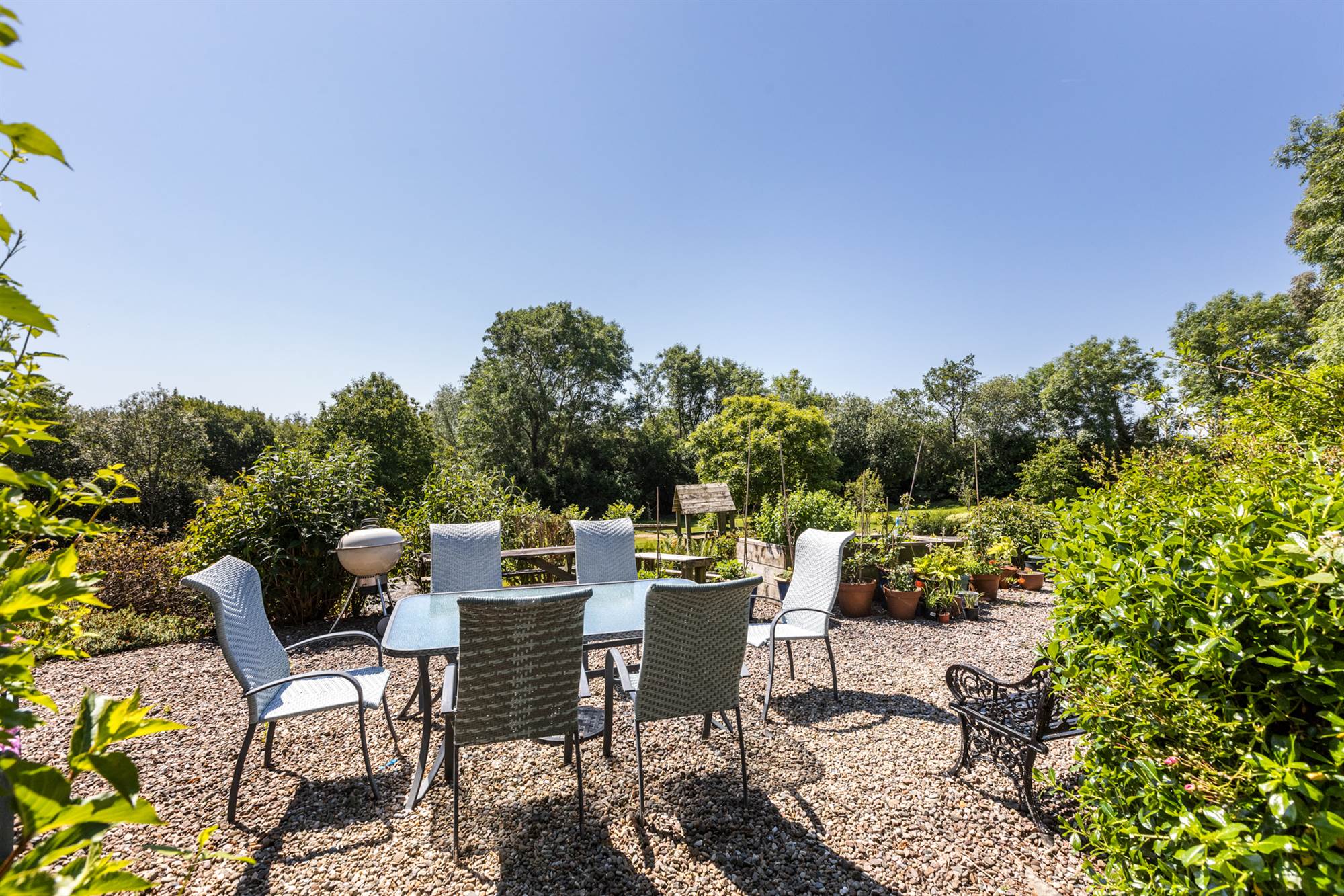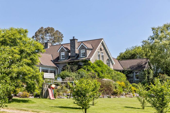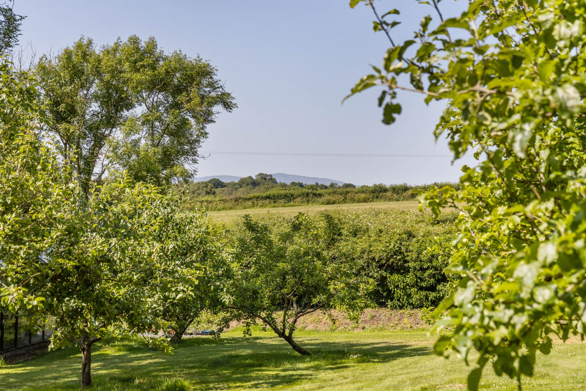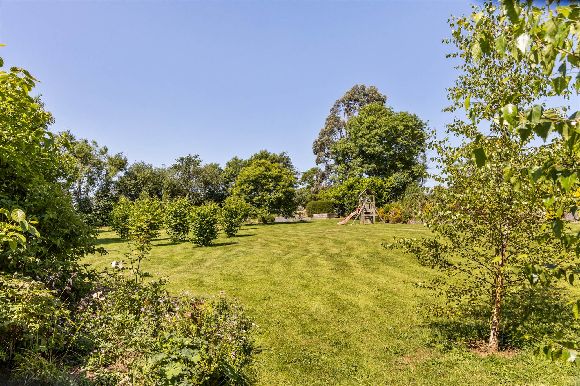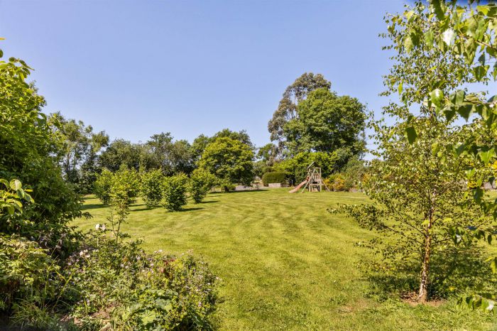 There are large lawn areas, substantial range of mature trees, fruit trees, gravel patio areas and paths, thick boundaries in native hedging and trees, well stocked rockery and further features a large mature orchard.