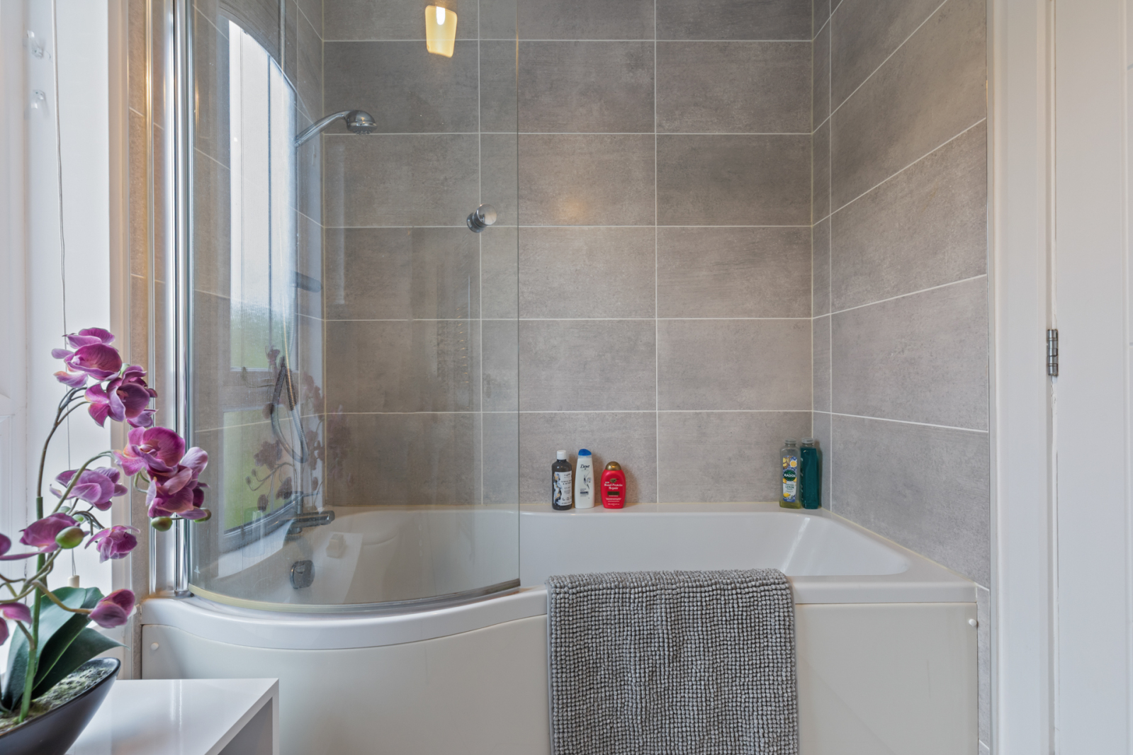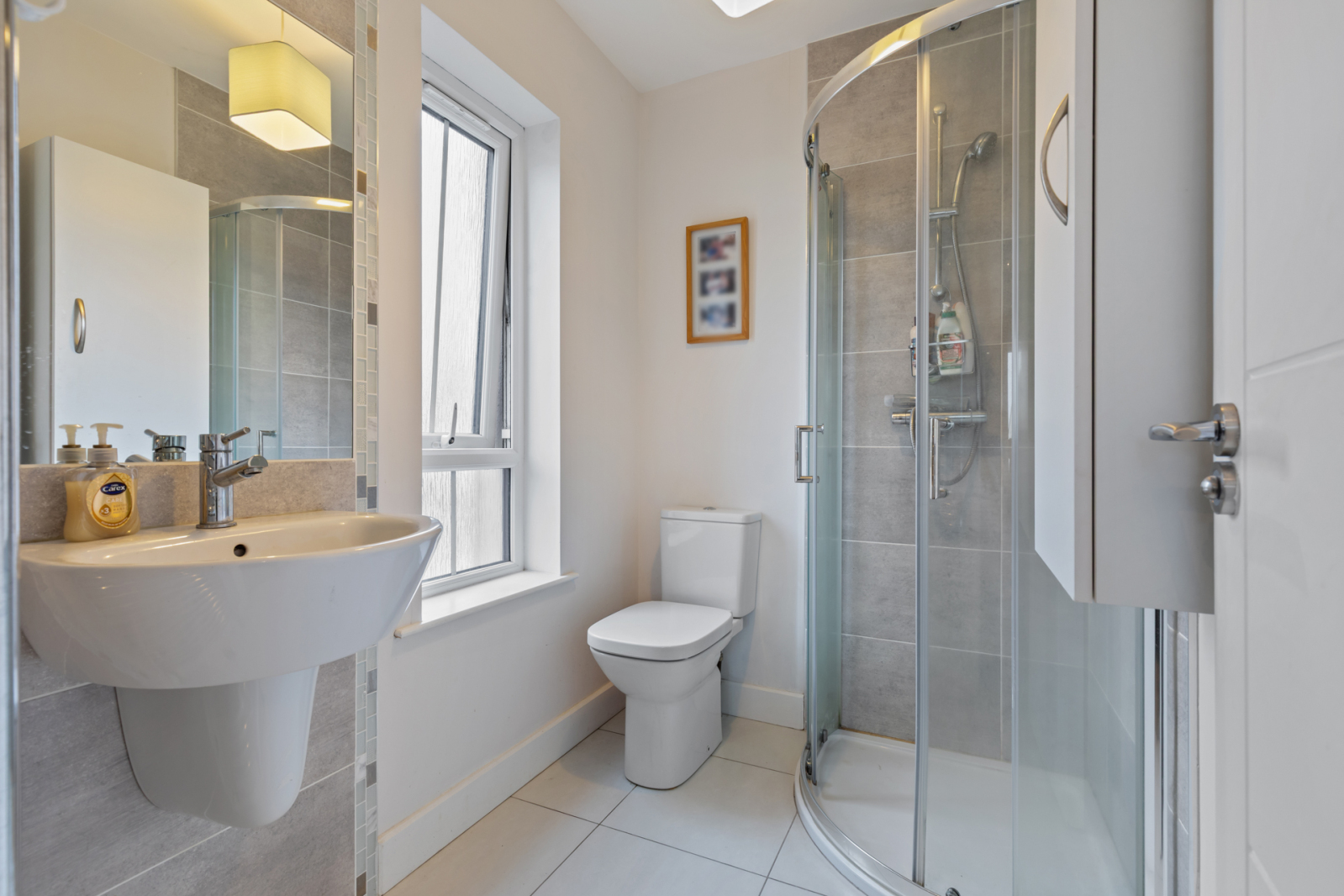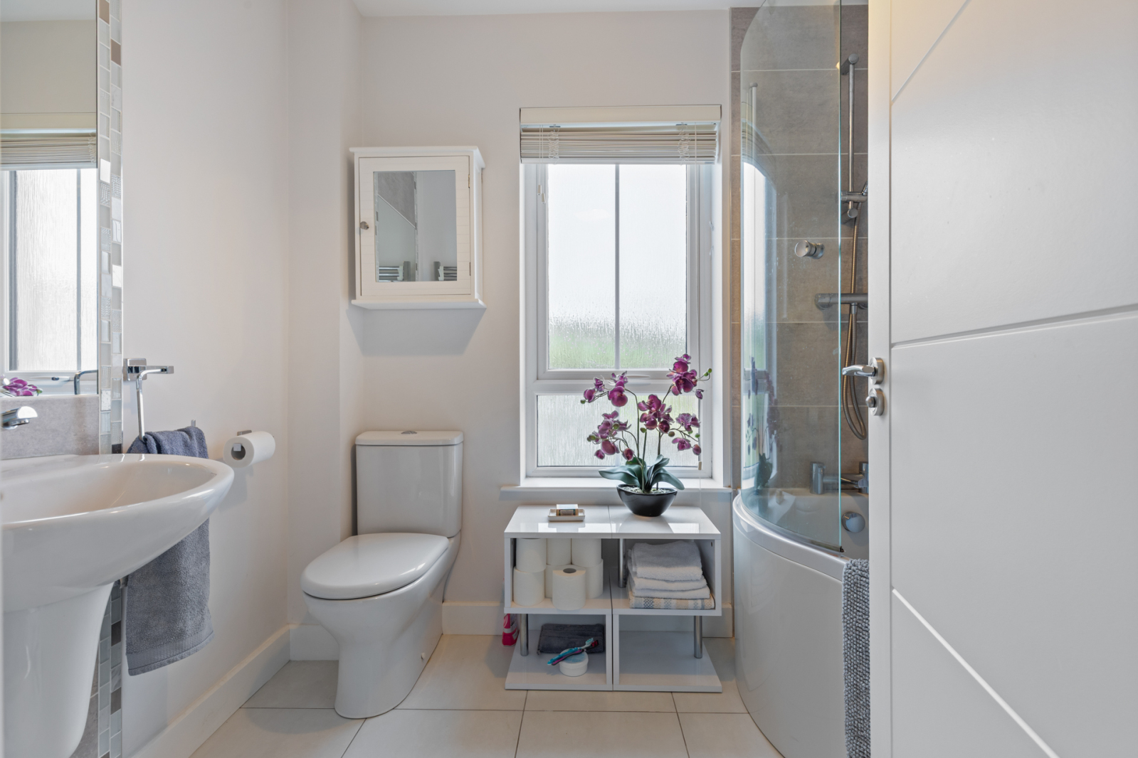 Modern white suite comprising: Separate fully tiled shower cubicle, thermostatically controlled shower, wall mounted wash hand basin with mixer taps, push button WC, chrome towel radiator, feature wall tiling, ceramic tiled floor, extractor fan.