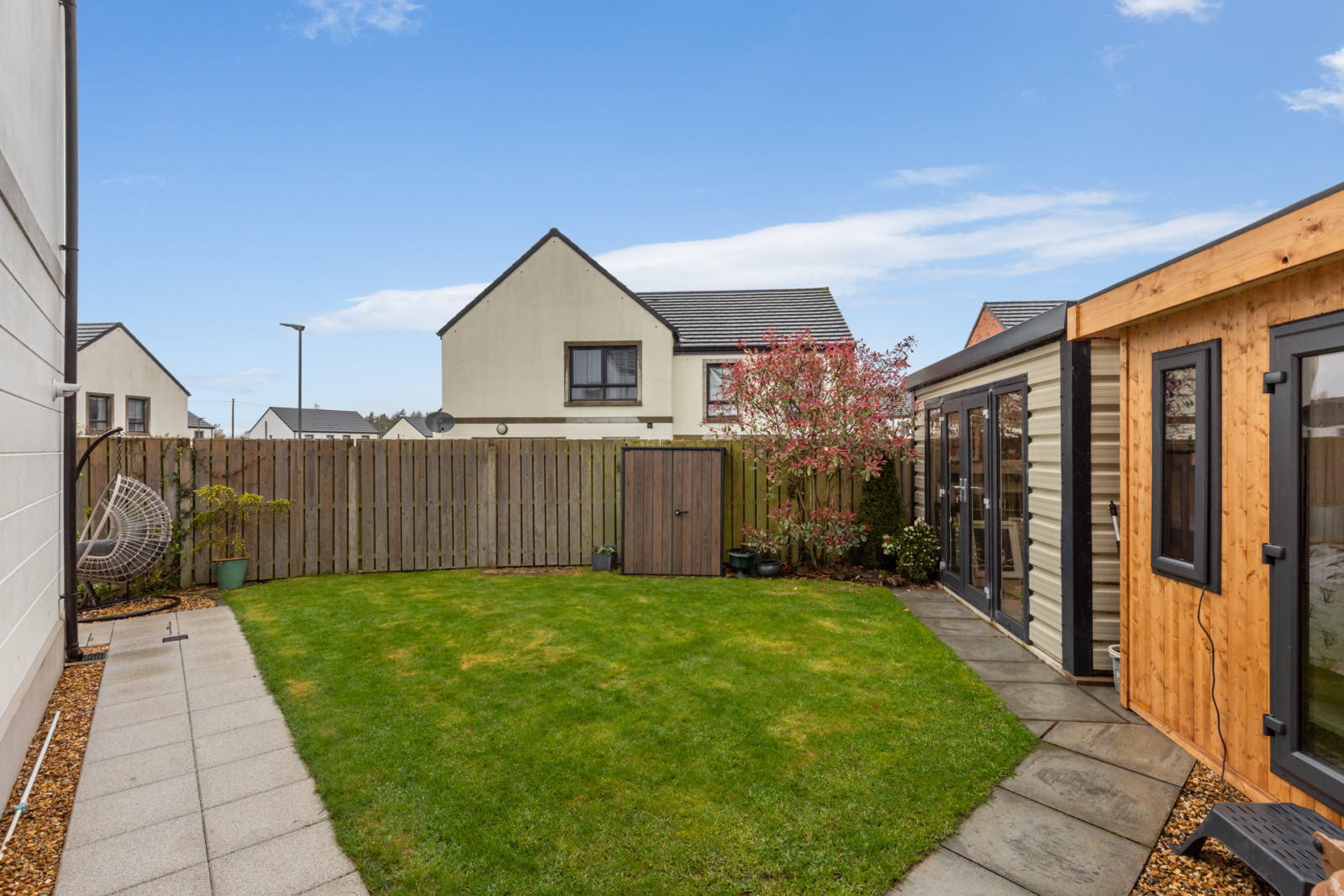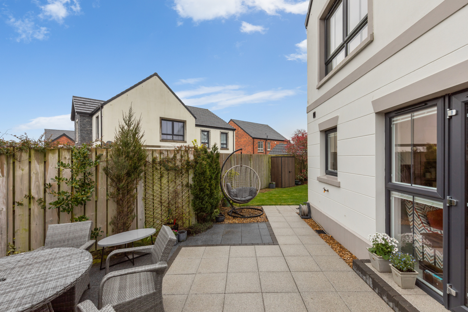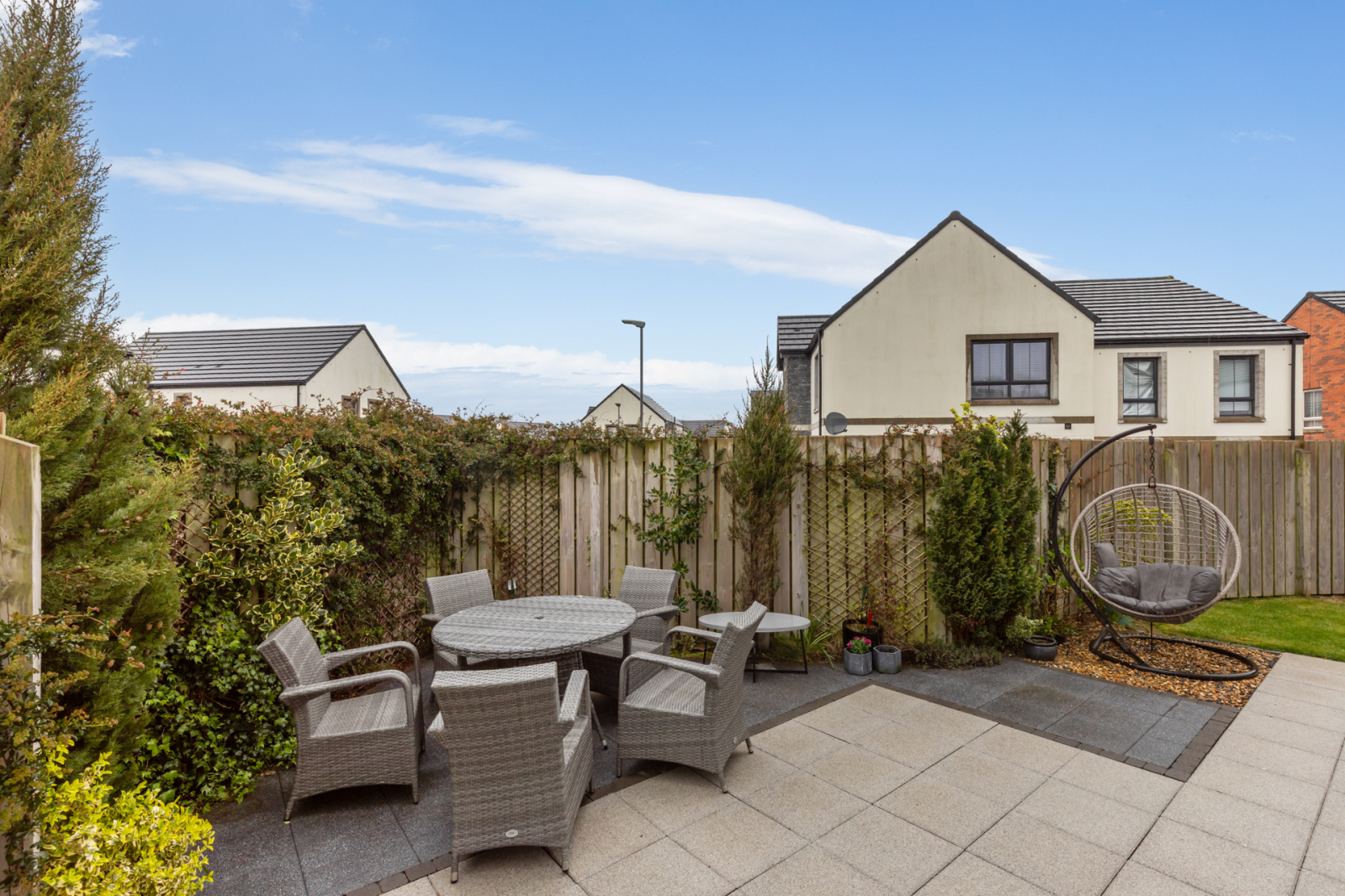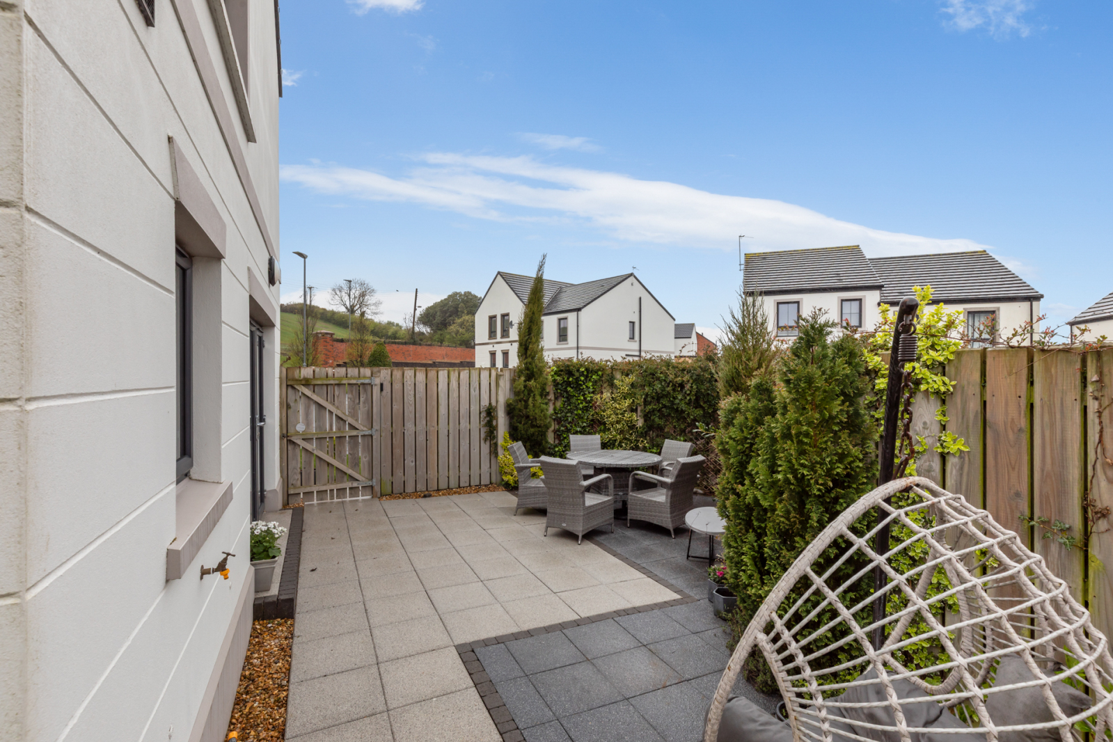 Gardens to front, side and rear laid out in manicured lawn, large modern patio, flowerbeds, shrubs, fencing, outside water tap, outside light.