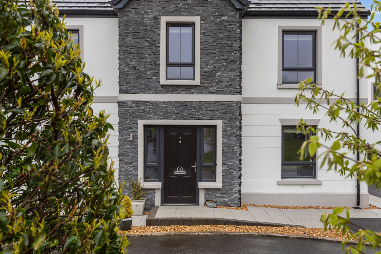 Black composite front door, outside light.