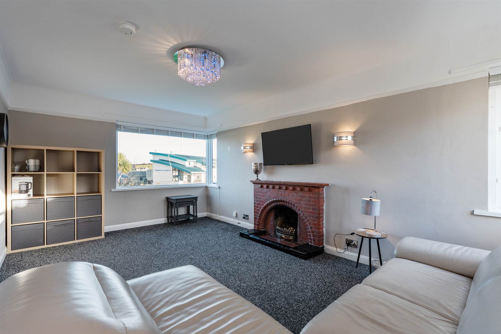 Corner window with views to Strangford Lough, brick fireplace and hearth, open fire.