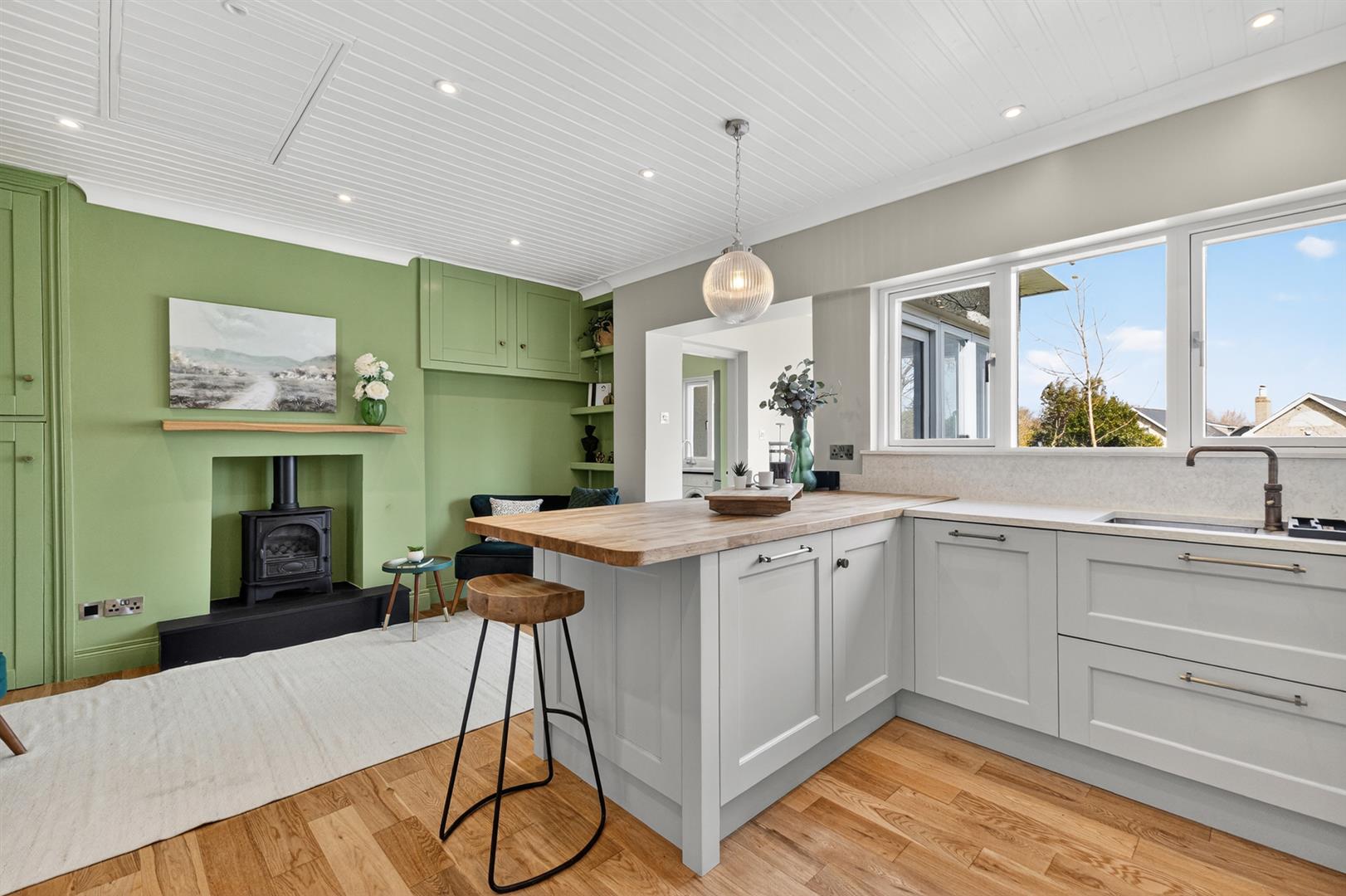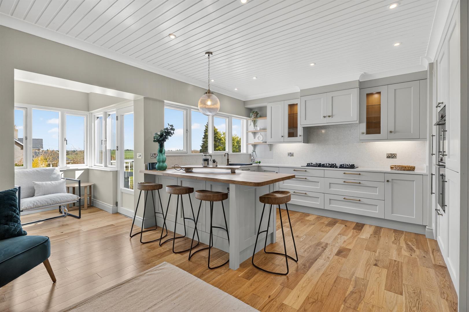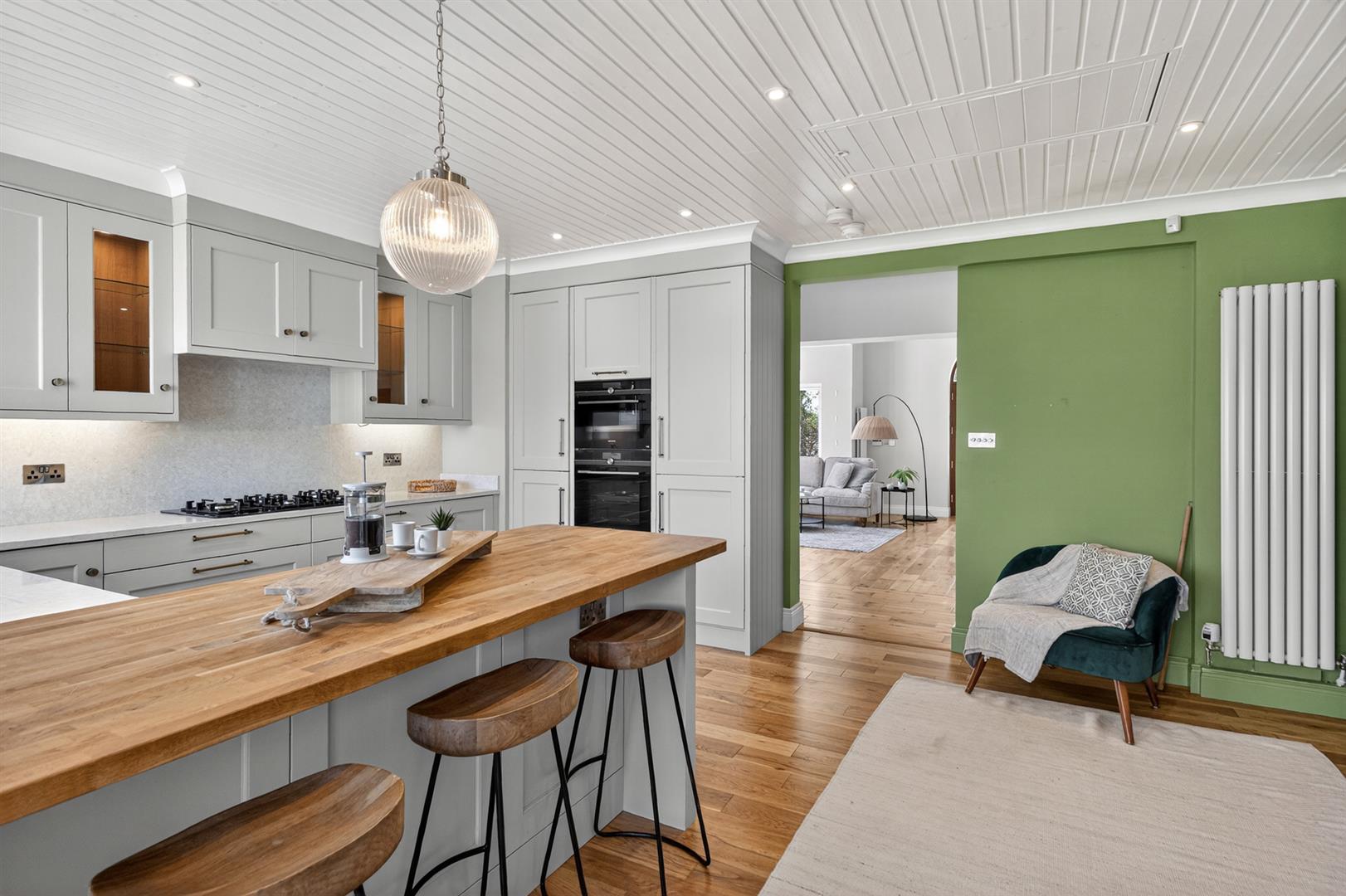 Excellent range of painted finish high and low level cupboards and drawers with feature glazed display cupboards; matching breakfast bar with solid wood work top; granite worktops with matching upstands incorporating 1½ tub stainless steel sink unit with Quooker hot water tap; Siemens double electric ovens; integrated Liebhrr fridge / freezer; Bosch 6 ring gas hob with Airforce stainless steel extractor unit and light over; integrated AEG dishwasher; painted tongue and groove ceiling with cornice; LED spotlights; polished oak floor; electric cast iron coal effect stove on raised state hearth with wooden mantle over; access to floored roofspace via folding ladder; cupboard with Vaillant pressurised hot water cylinder; open through to:-