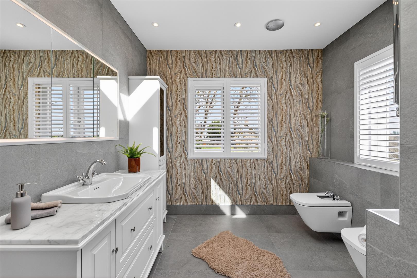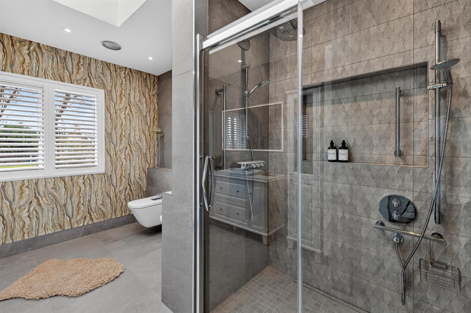 White suite comprising walk in tiled shower with two Grohe thermostatically controlled showers with adjustable and rain shower heads; glass sliding shower door and side panel; wc with concealed cistern; bidet; vanity unit with marble top incorporating wash hand basin with mixer tap; cupboards and drawers under; illuminated mirror fronted bathroom cabinet over; twin bathroom cabinets; cupboard, drawers and open shelving; stone tiled floor; part tiled walls; atrium; LED spotlights; chrome heated towel radiator.