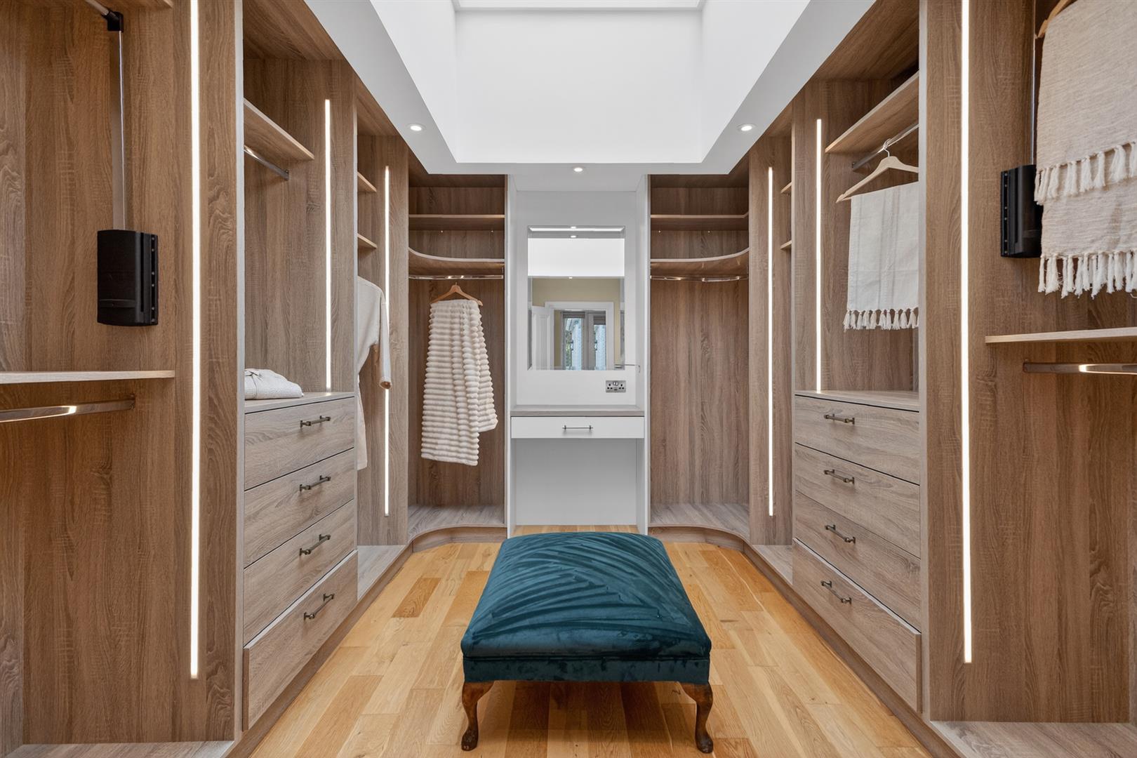 Extensive range of illuminated built in furniture including wardrobes, pull out shelves, two nests of four drawers, clothes rails and dressing table with mirror over; atrium; polished oak floor; LED spotlights.