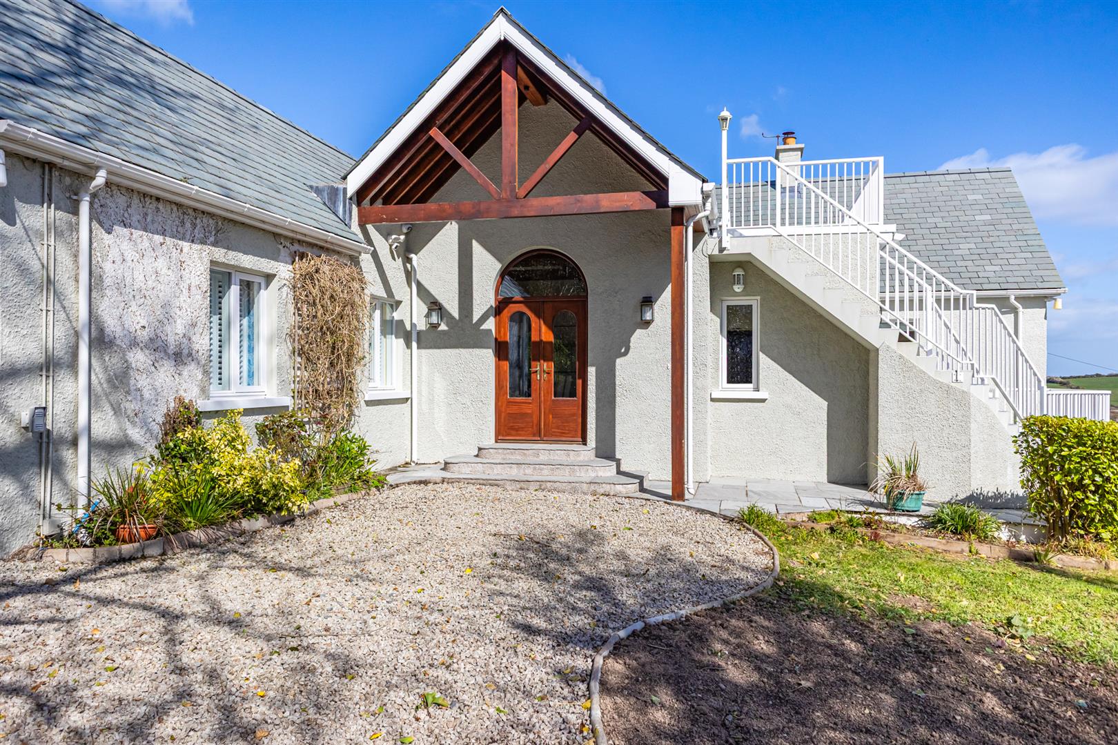 Electrically operated entrance gates lead to illuminated granite chip driveway ; ample parking to front and rear of property.