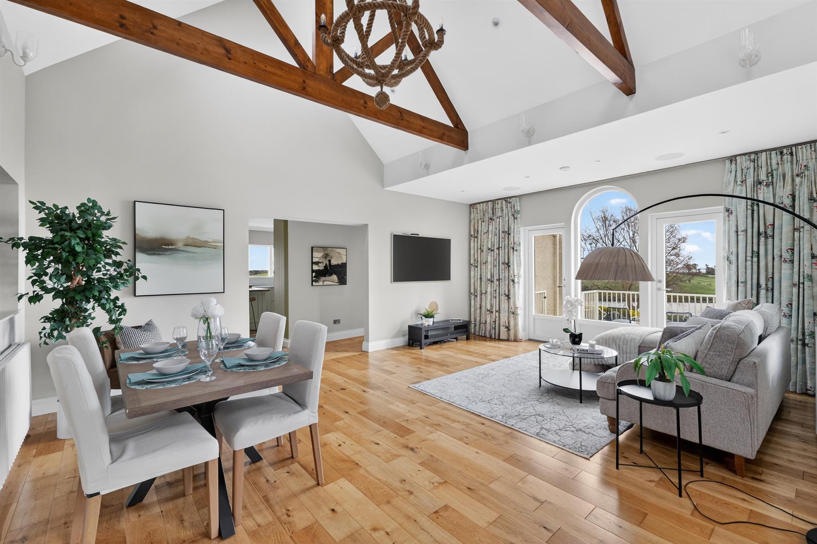 Polished oak floor; exposed A frame ceiling beams; wired for wall lights; LED spotlights; ceiling windows; IKEF surround sound speakers; glazed patio doors to terrace.