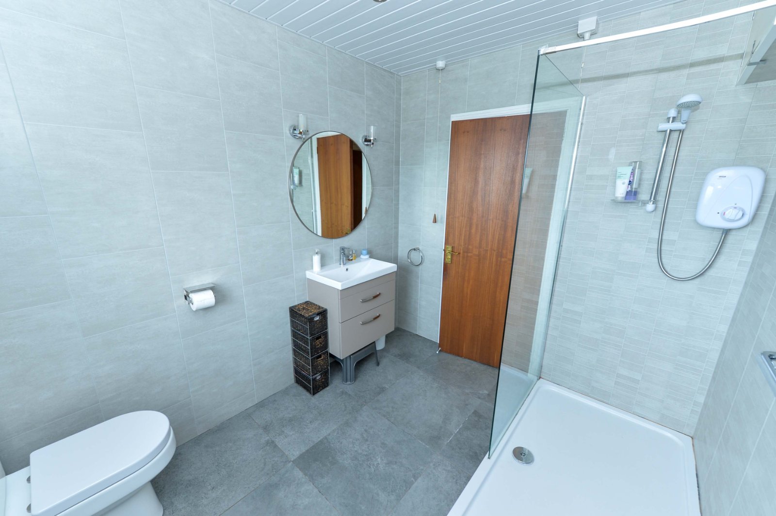 Walk in shower enclosure. Electric shower. Vanity unit with white basin and chrome mixer tap. Dual flush WC. Wall panelling. Floor tiling. Recessed lighting. Wall lights. Radiator.