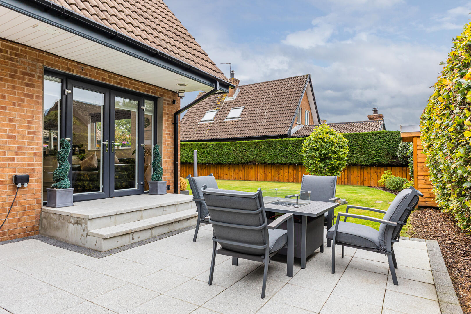 Sits on an extensive well-maintained plot. To the front a large, pebbled driveway providing ample off streetcar parking, garden laid in lawn with flowerbeds with mature planting, trees, hedges and shrubs, a feature stone wall also add character, access to double garage, gate access to rear. uPVC guttering/ Fascia and Downspouts. To the rear a fully enclosed space surrounded by hedging, decorative paving provides ample areas for entertaining, lawn with barked flowerbeds, outside water, outside lighting