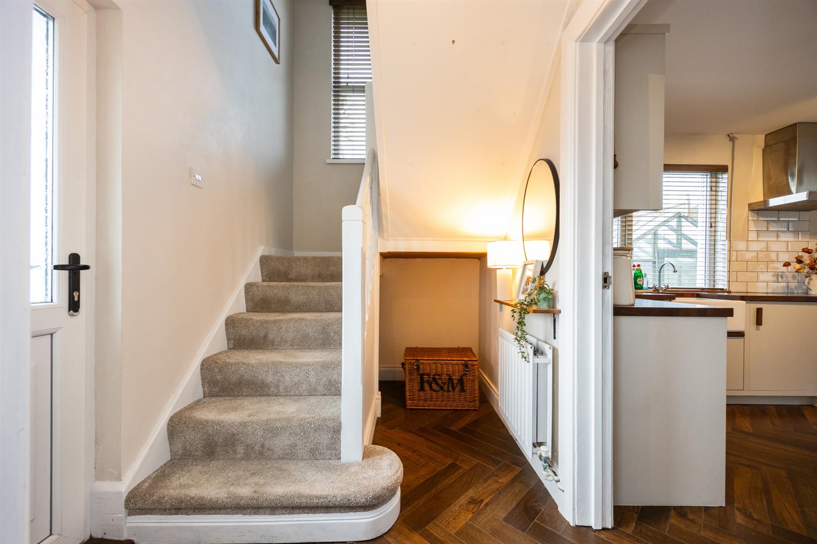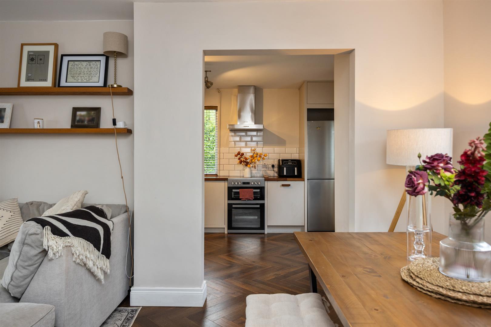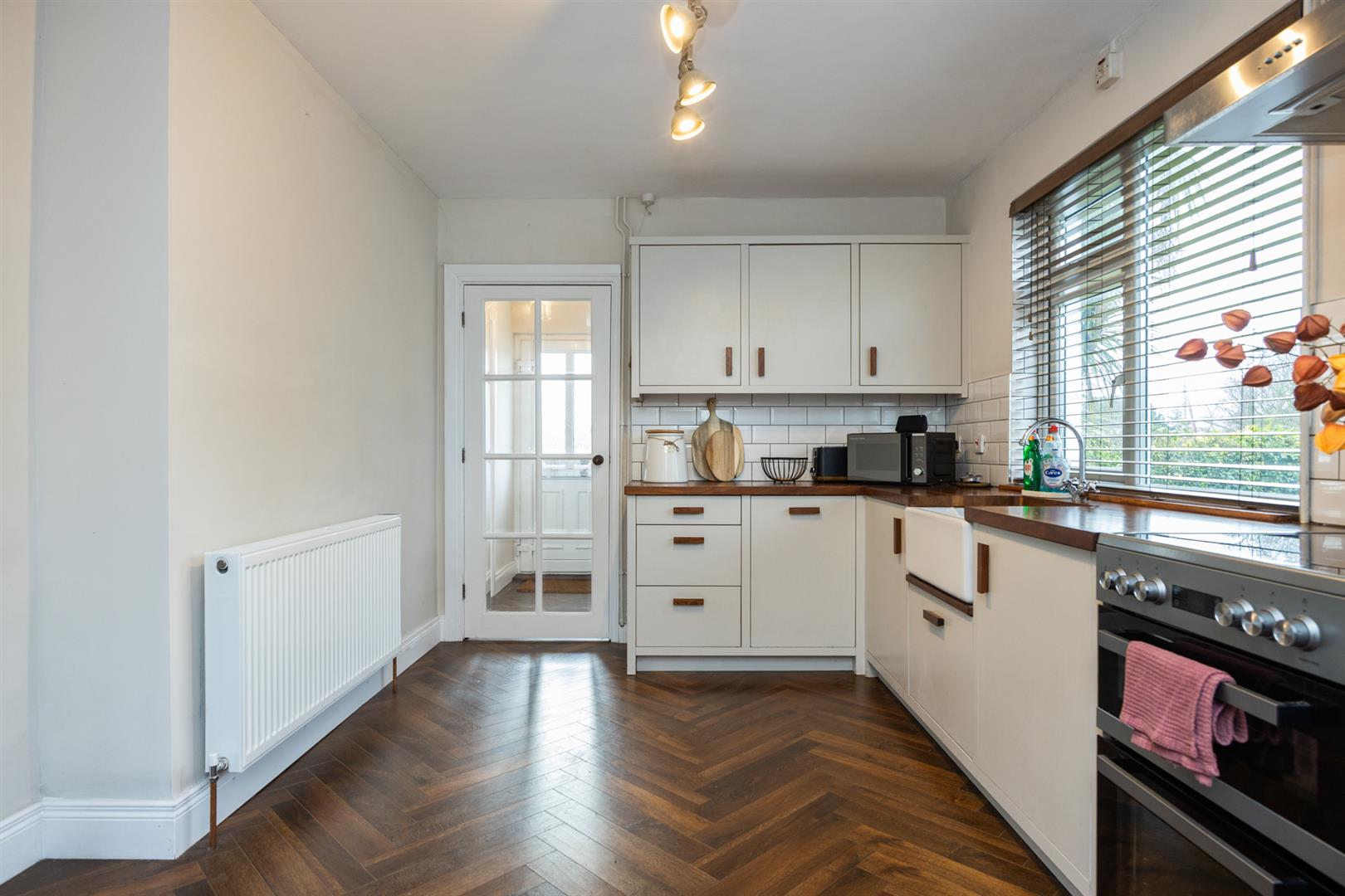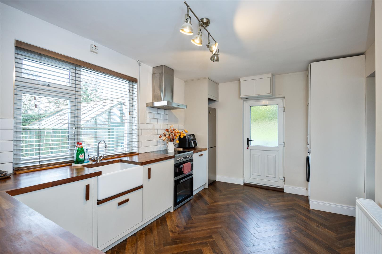 High and low level units with Belfast sink and recess for cooker. Stainless steel extractor fan. Window to side, open plan, door.