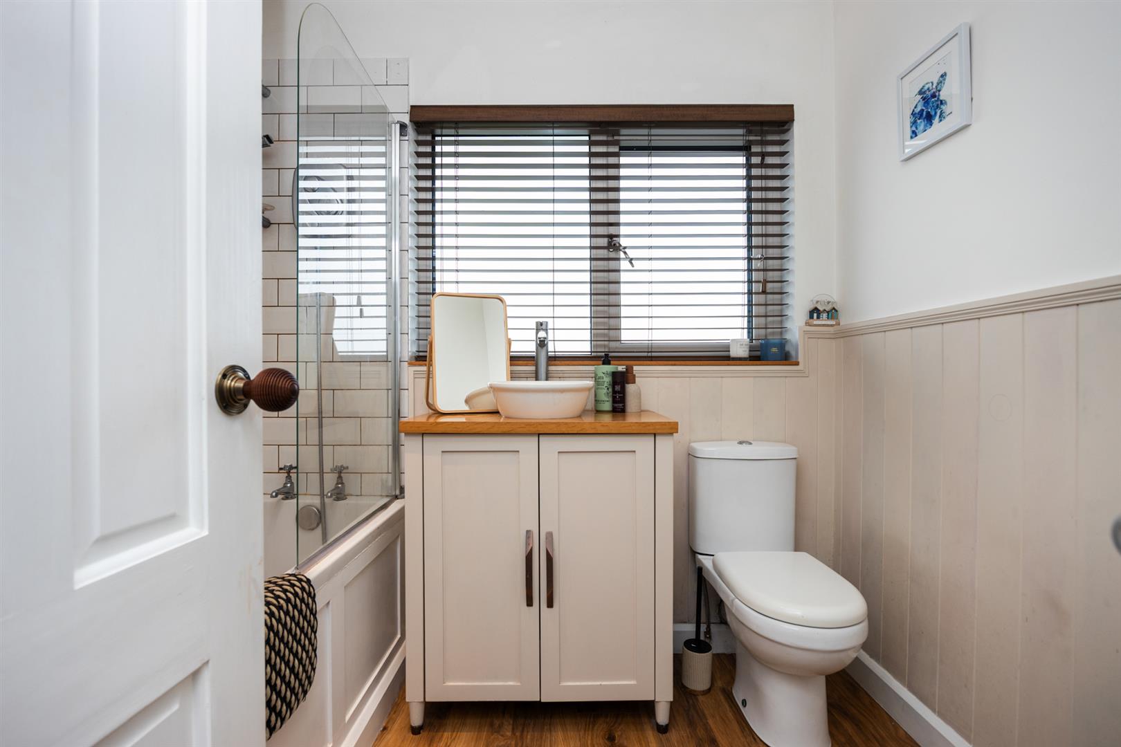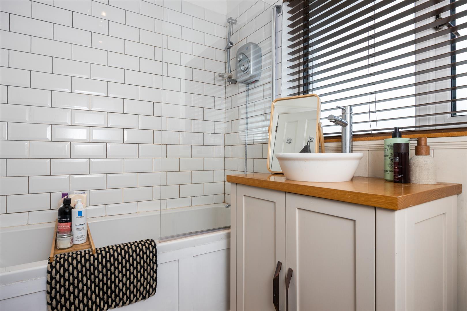 Panelled bath with electric shower over, freestanding vanity unit and low flush w.c, part panelled part tiled walls. Window to side, door to: