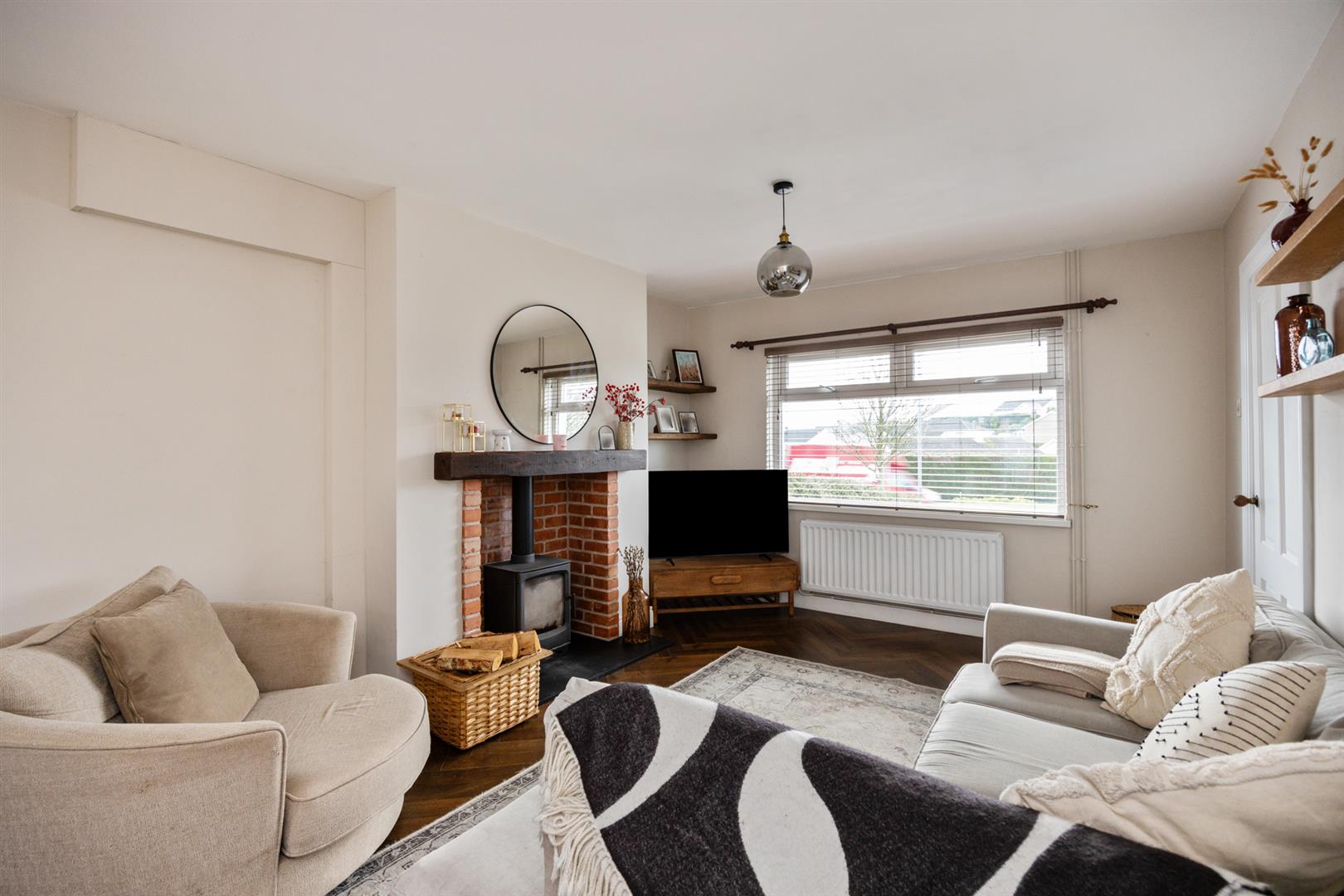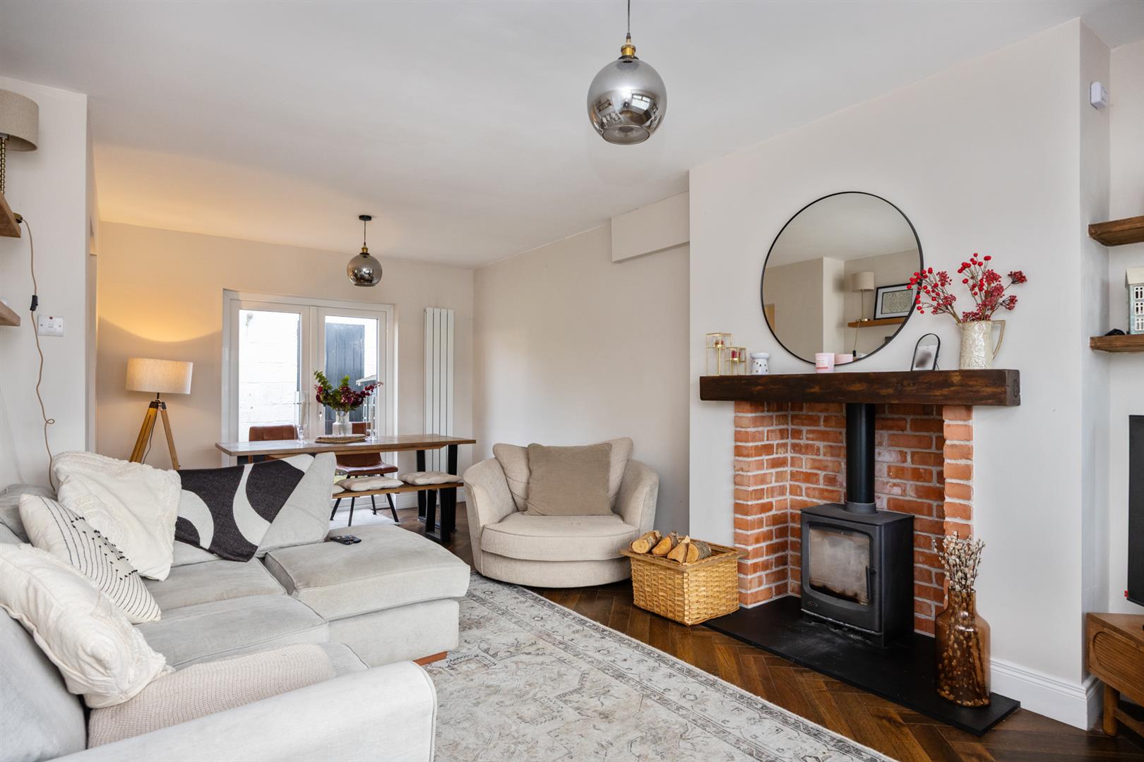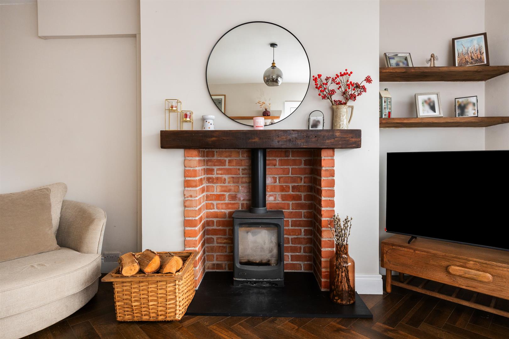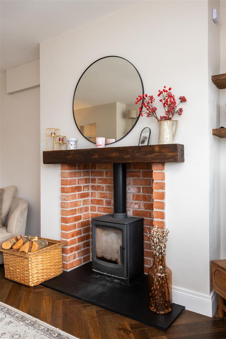 Parquet tiled floor. Brick fireplace with wood burning stove with wooden mantle and slate hearth. Window to front. double door, door to:
