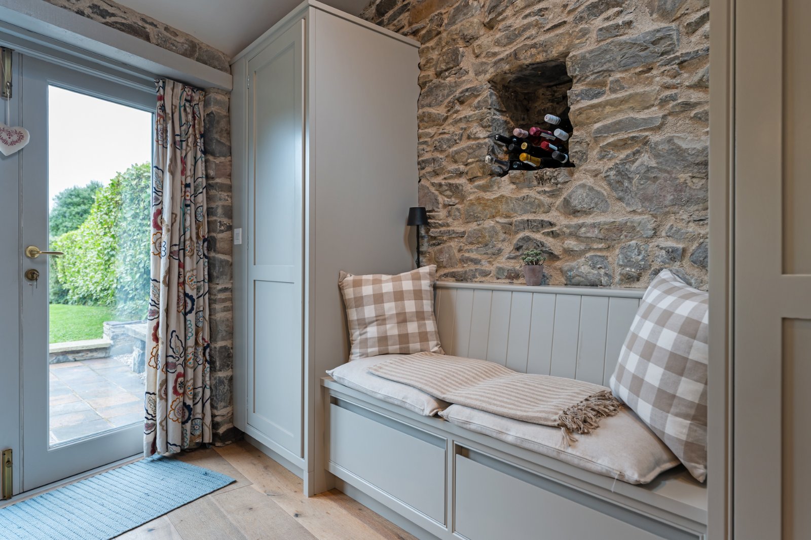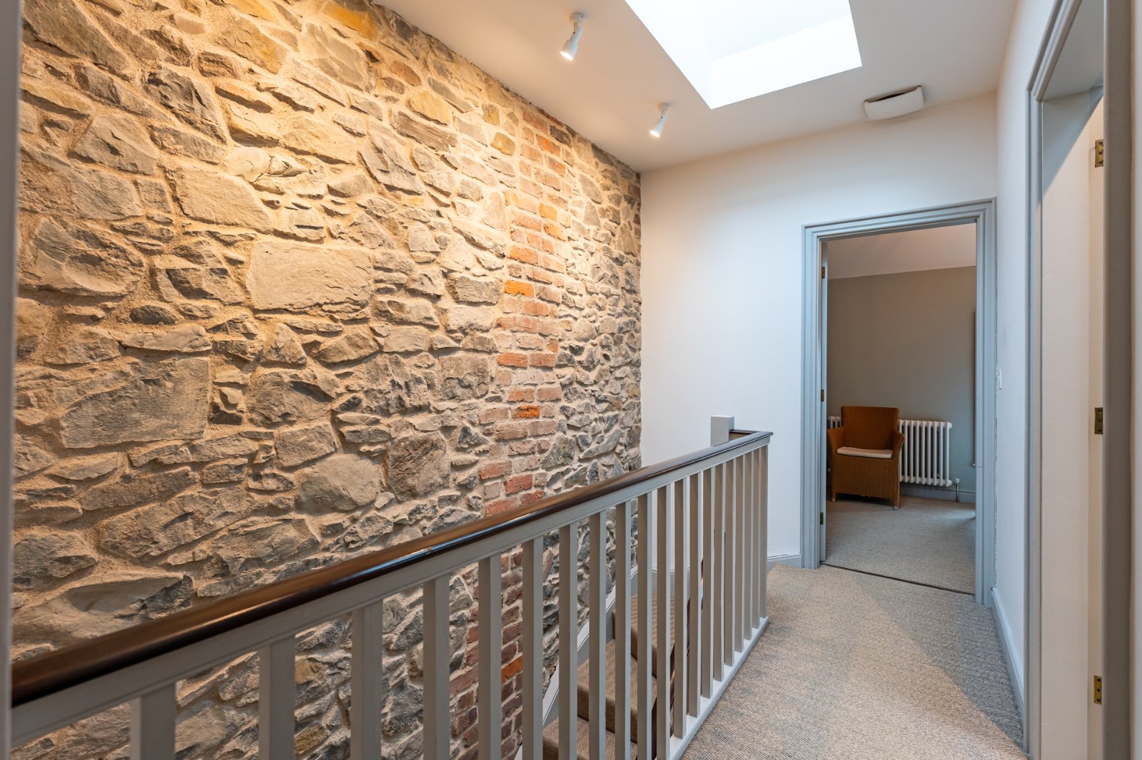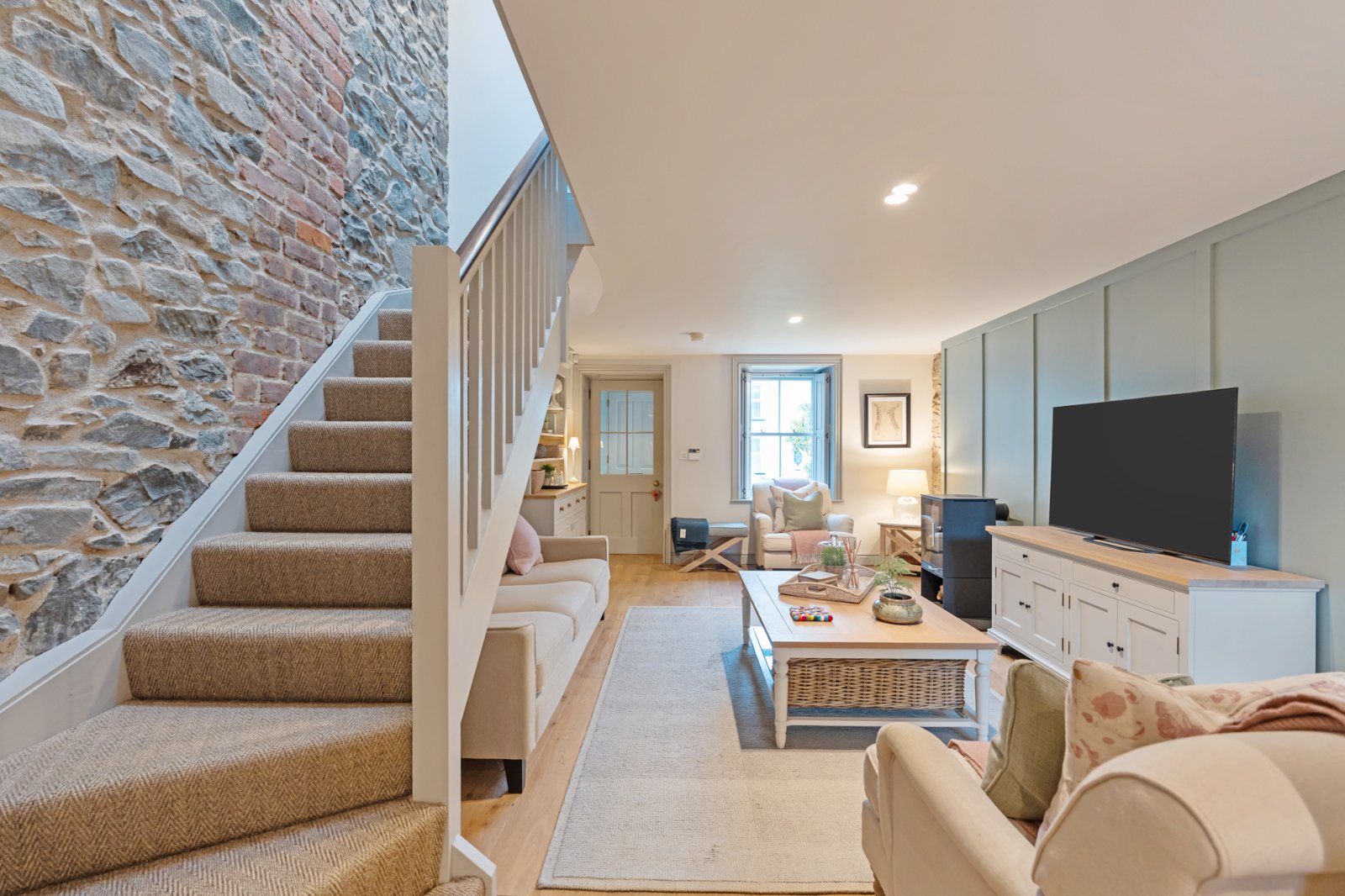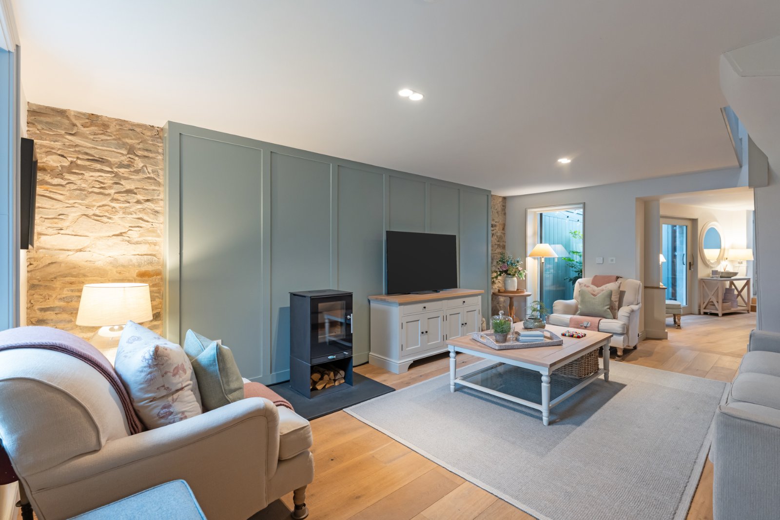 Contemporary Danish Rais Q-tee wood burning stove on slate hearth, panelled feature wall with stone wall to either side, hardwood painted sliding sash windows with panelling, solid style shutters, Weaver and Ducress inset spot lamps, painted timber stair with French polished handrail and Sisal Tread finish, Elka engineered Rural Oak flooring. Outlook to enclosed feature garden area.