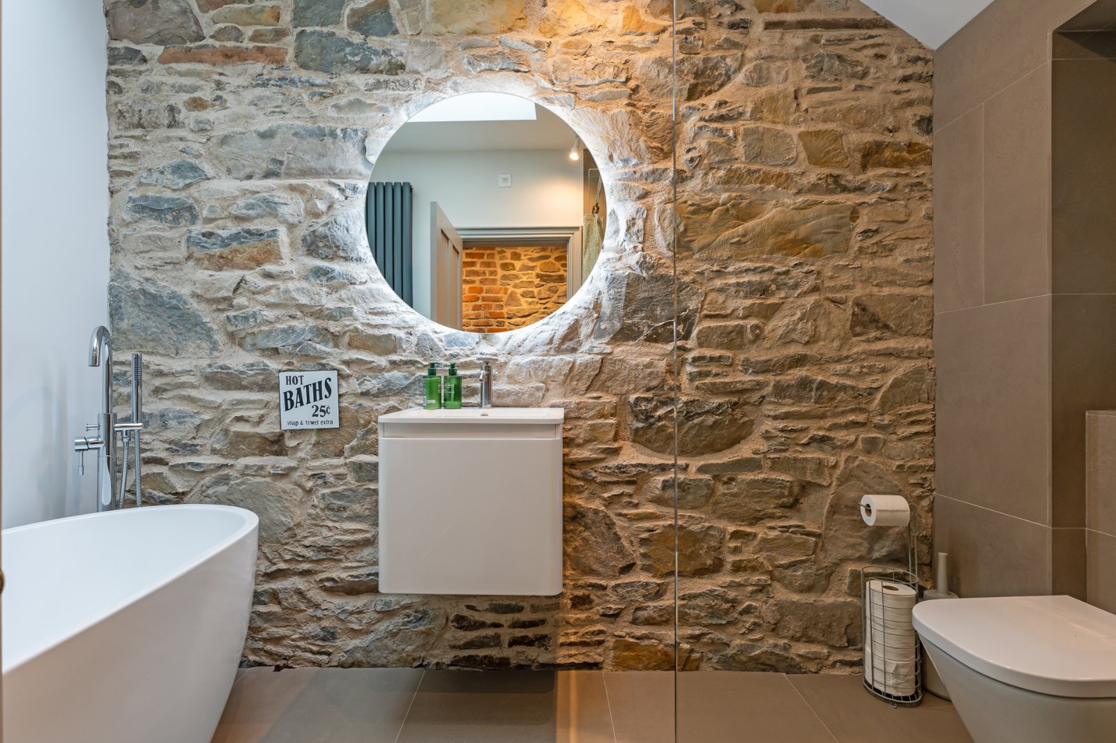 Back illuminated circular mirror, centrally heated towel rail Nev by Hilltop, wet room shower with Drench head and glass screen, wall mounted vanity/basin with porcelain handled mixer tap, free standing 'Belgravia by Charlotte Edwards' bath, sliding sash window and roof light, Ergon tiled finish to shower wall and floor, colour Concrete Taupe, natural stone feature wall, 4 panel traditional door.
