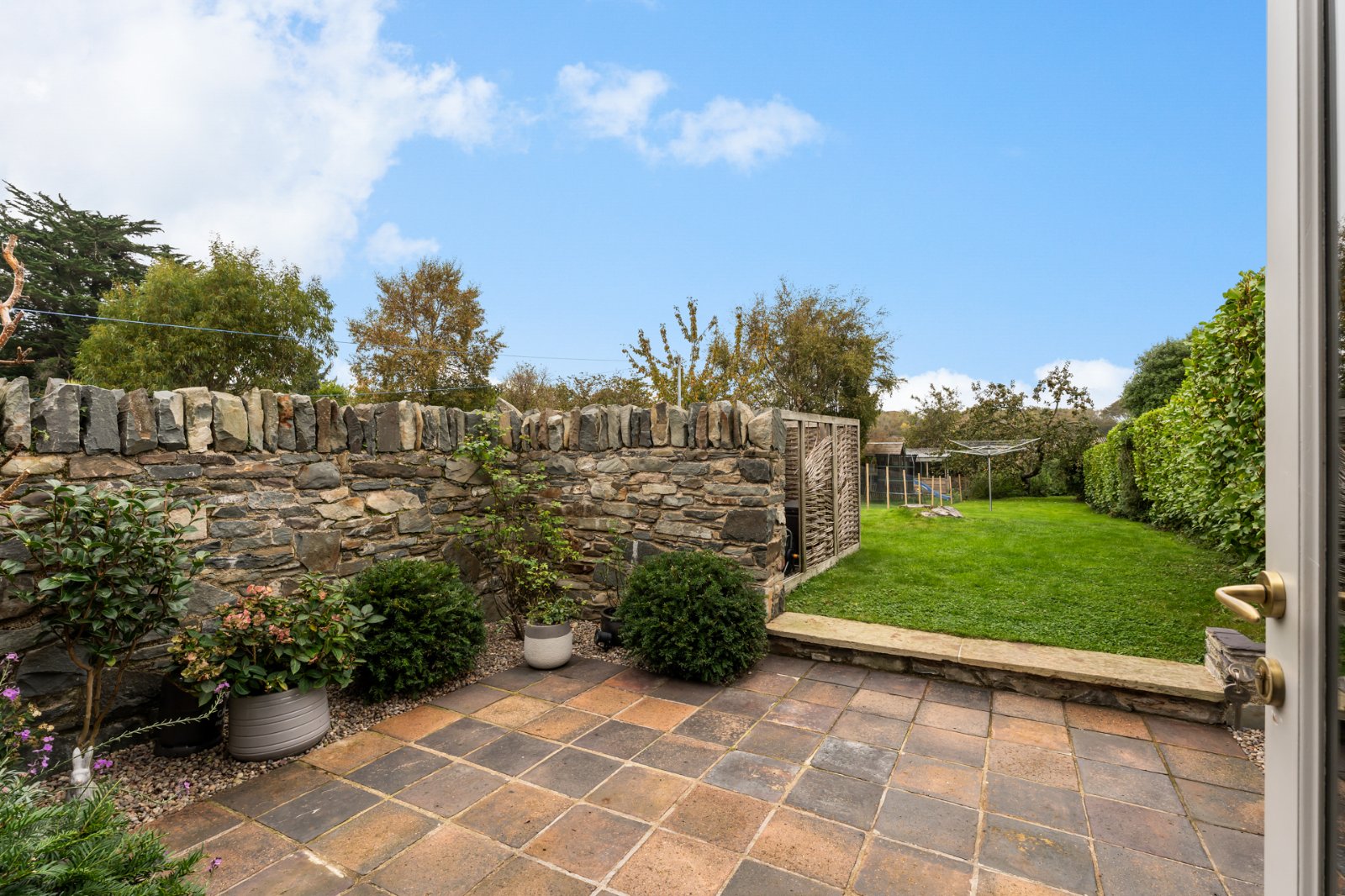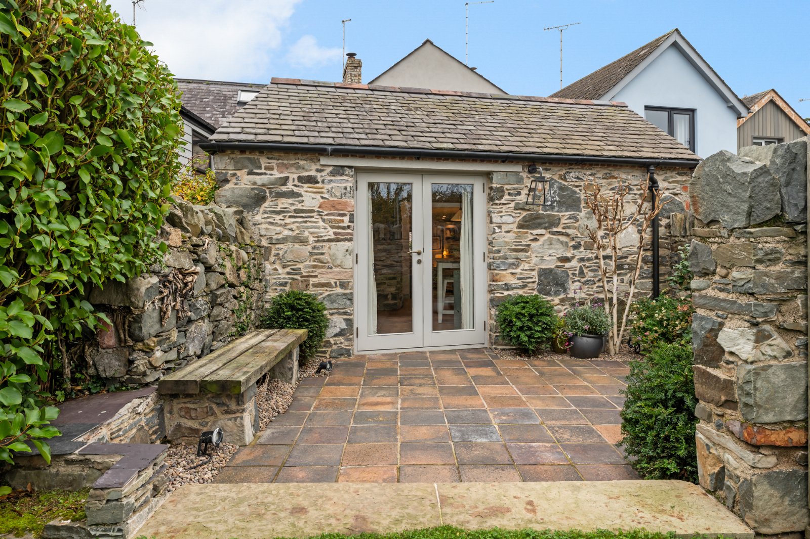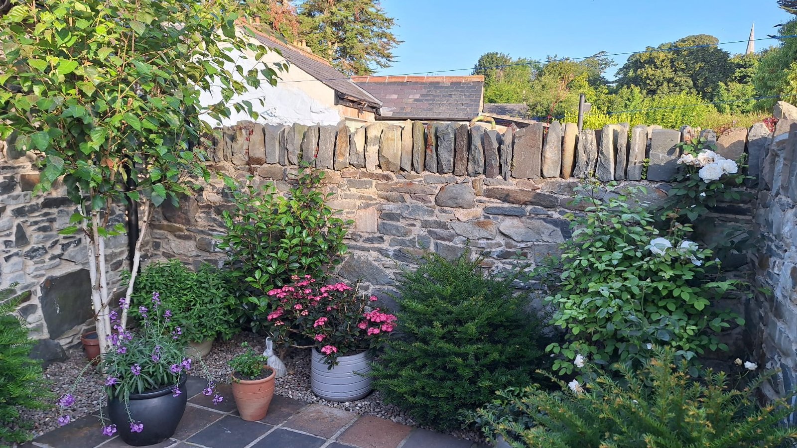 Quarry tiled patio salvaged from original scullery floor, low level spot lamps in perimeter planting beds, Roger Pradier lamp to French doors, built in bench, stone walls surround patio suntrap, salvaged from on site outbuilding, woven timber panels, oil tank with watchman wireless oil level indicator, external tap, 40m lawn.