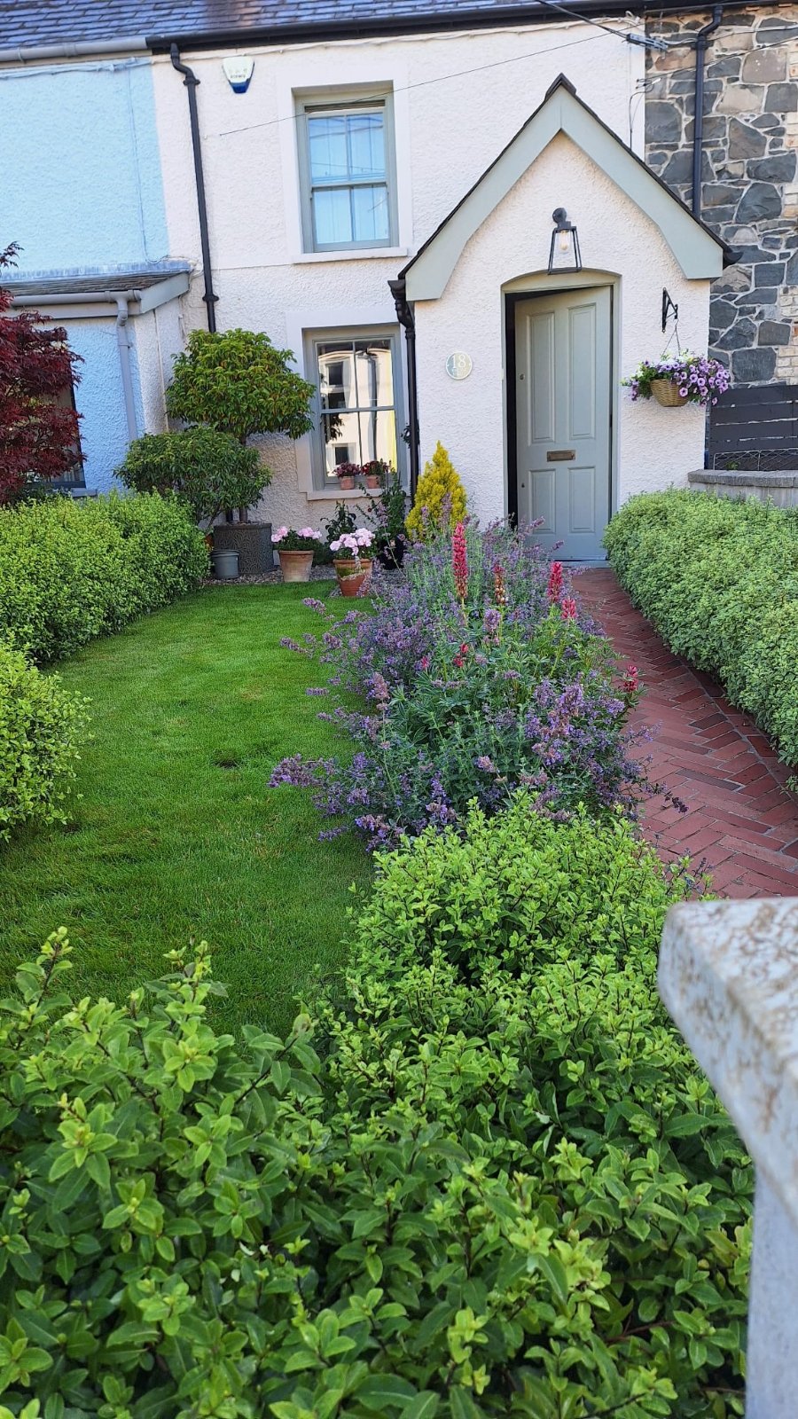 Terracotta path with Herringbone pattern, Roger Pradier light over front door and spot lamps to path, cottage planting and lawn, decorative metal gate, concealed bin store with tiled floor and metal gate, external tap.