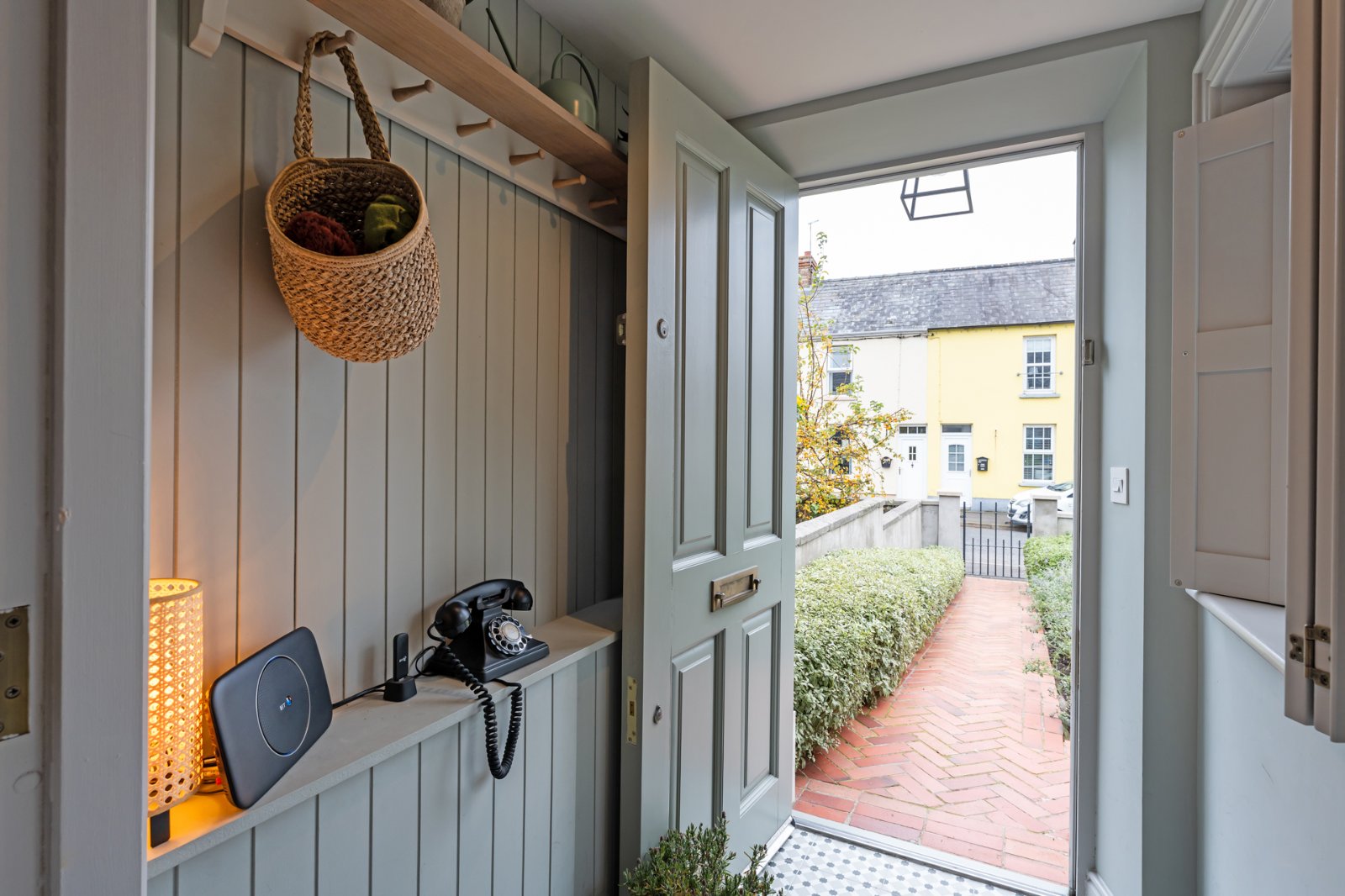 Hardwood panelled front door, tiled heated floor, hardwood painted sliding sash window with panelling, solid style shutters, Antique brass ironmongery, traditional panelled/glazed inner door, ultra fine glazing bars with putty pointing.