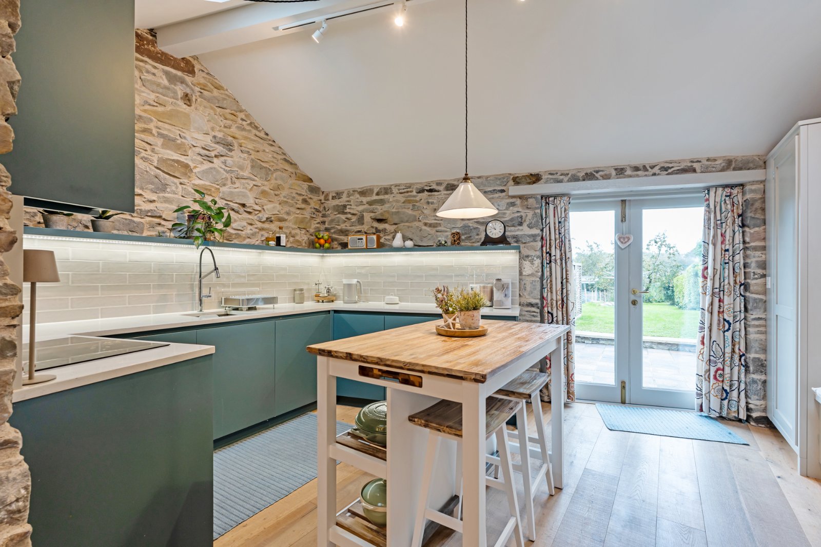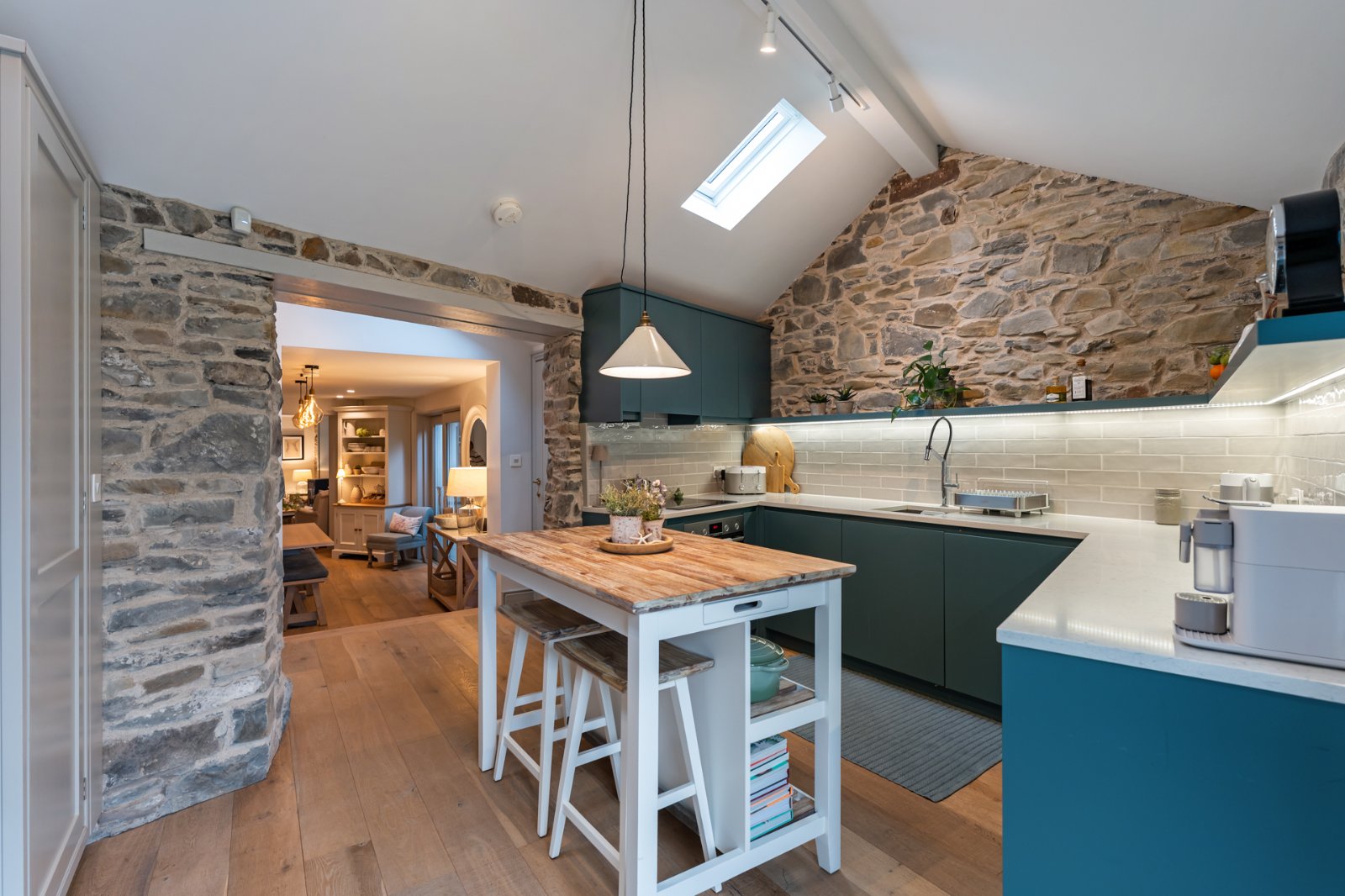 Architect designed kitchen made locally by Function Design, designed to suit this converted barn, contemporary Petrol Blue flush doors with concealed shark fin handles, Quartz worktop, inset stainless steel sink with Flanagan Oblique filter mixer tap, stainless steel built in electric oven and NEFF induction hob, under counter fridge, integrated dishwasher, integrated cooker extractor concealed in high level units, illuminated continuous shelf, glazed brick style continuous tiled splashback colour concrete taupe, 2 no high level storage units with fitted bench seat, including drawer storage, vaulted ceiling with Sara on track spot lights, Elka engineered Rurual Oak flooring, hardwood painted French doors to patio, 2 no roof lights.