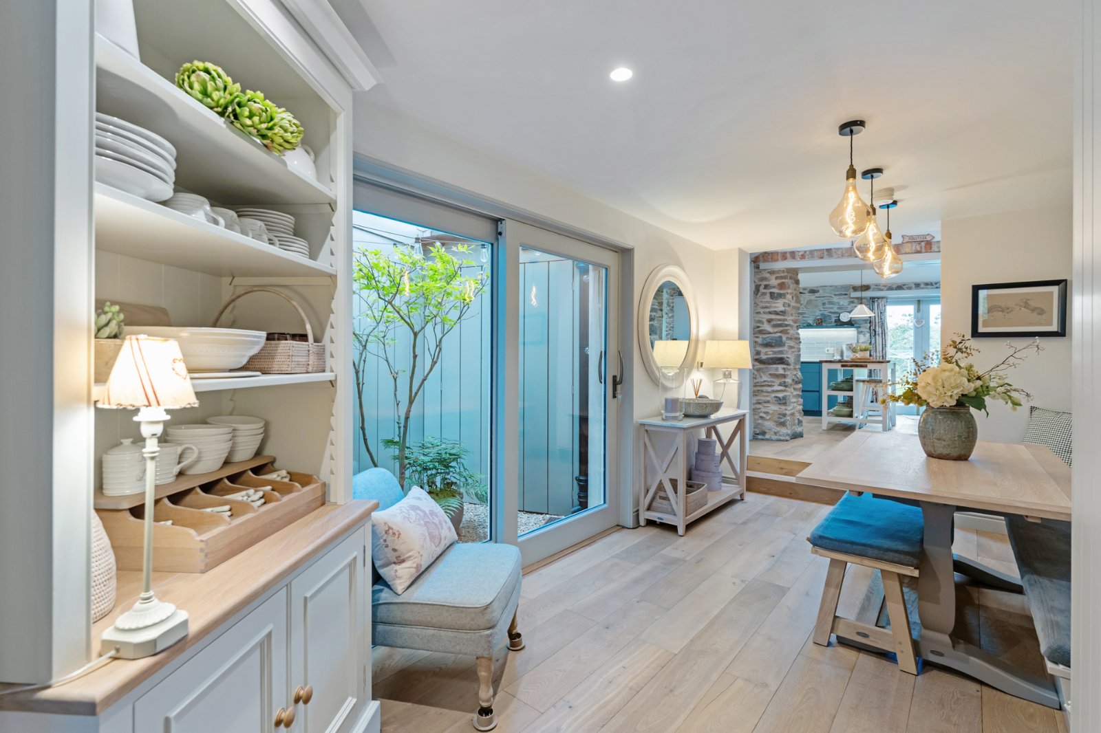 Built in bench seat with panelled wall over, full height built in storage, 3 no Tala Voronol Pendants over table location, sliding timber door to internal courtyard, Elka engineered Rural Oak flooring. Steps to: