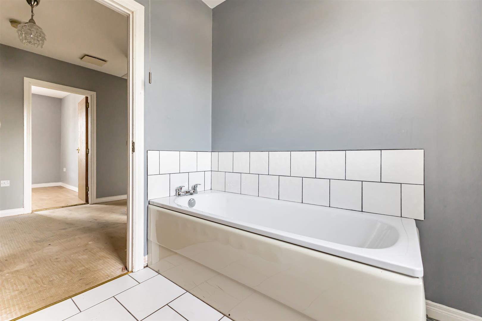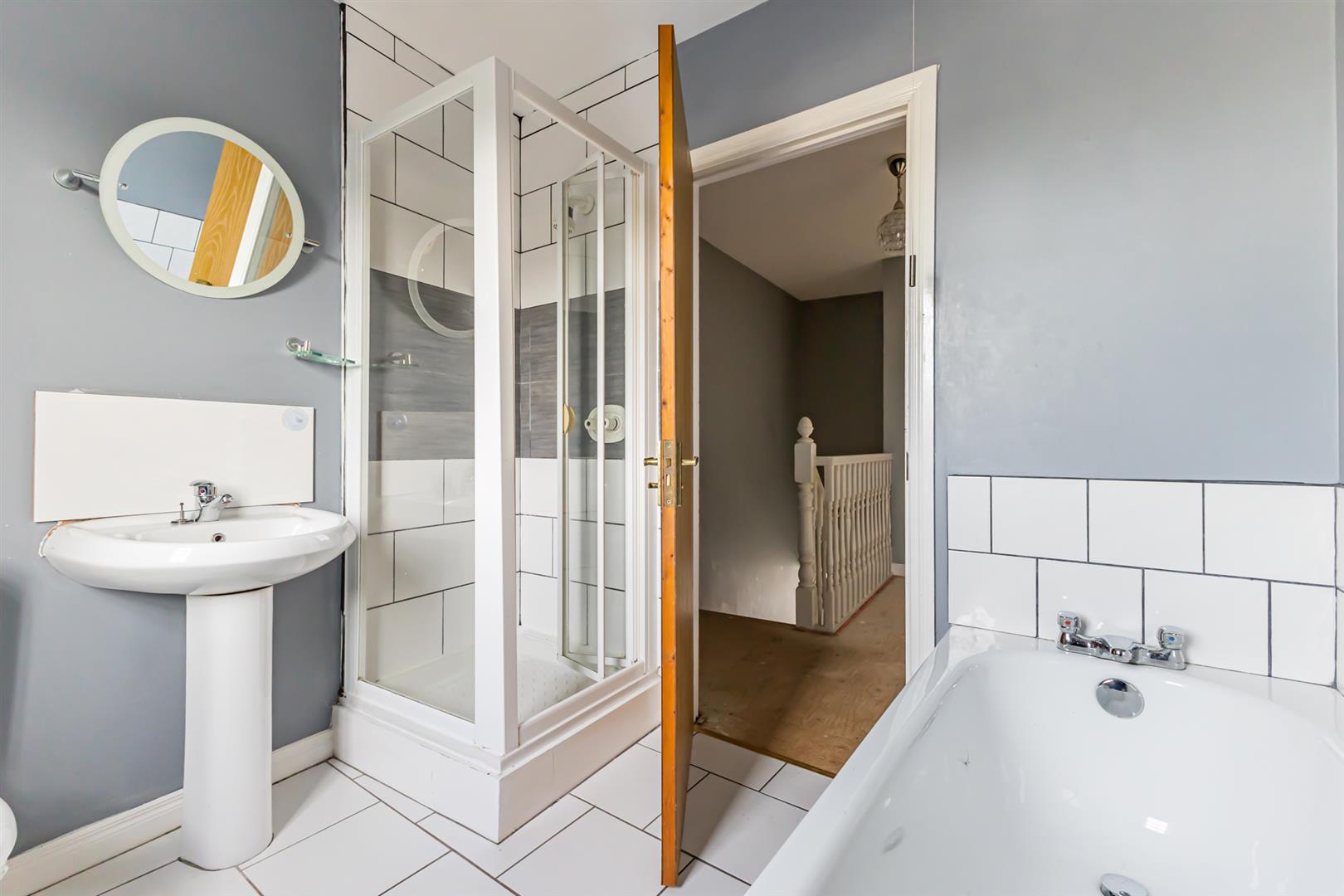 White suite comprising panelled bath with mixer tap; tiled shower cubicle with thermostatically controlled shower unit; pedestal wash hand basin with mono mixer tap; close coupled wc; part tiled walls; tiled floor; recessed spotlights.