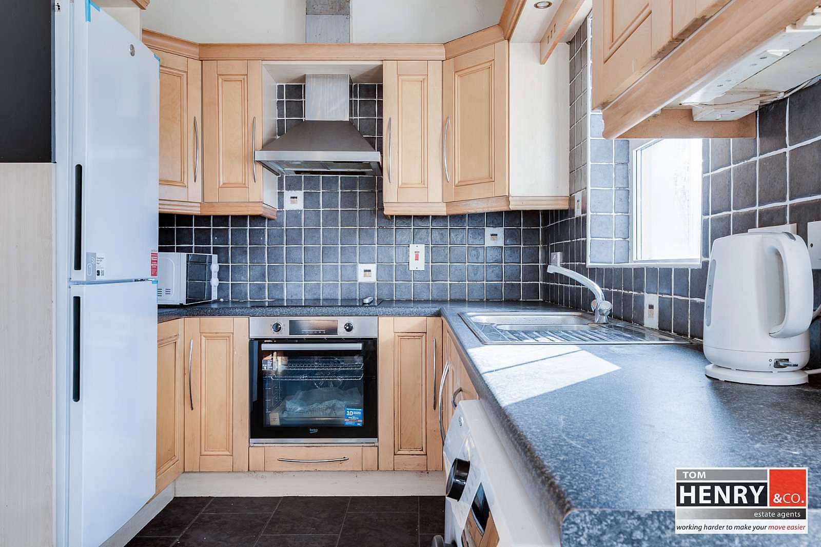 FITTED HIGH & LOW LEVEL UNITS. PELMET OVER S.S. SINK & DRAINER WITH MIXER TAP FITTING. INTEGRATED HOB & UNDER OVEN WITH X-FAN OVER IN S.S. CANOPY. SPACE FOR FRIDGE FREEZER. PLUMBED FOR WASHING MACHINE. TILED BETWEEN UNITS. TILED FLOOR. WOODEN EXTERNAL DOOR WITH GLAZED TOP PANELS TO REAR GARDEN.