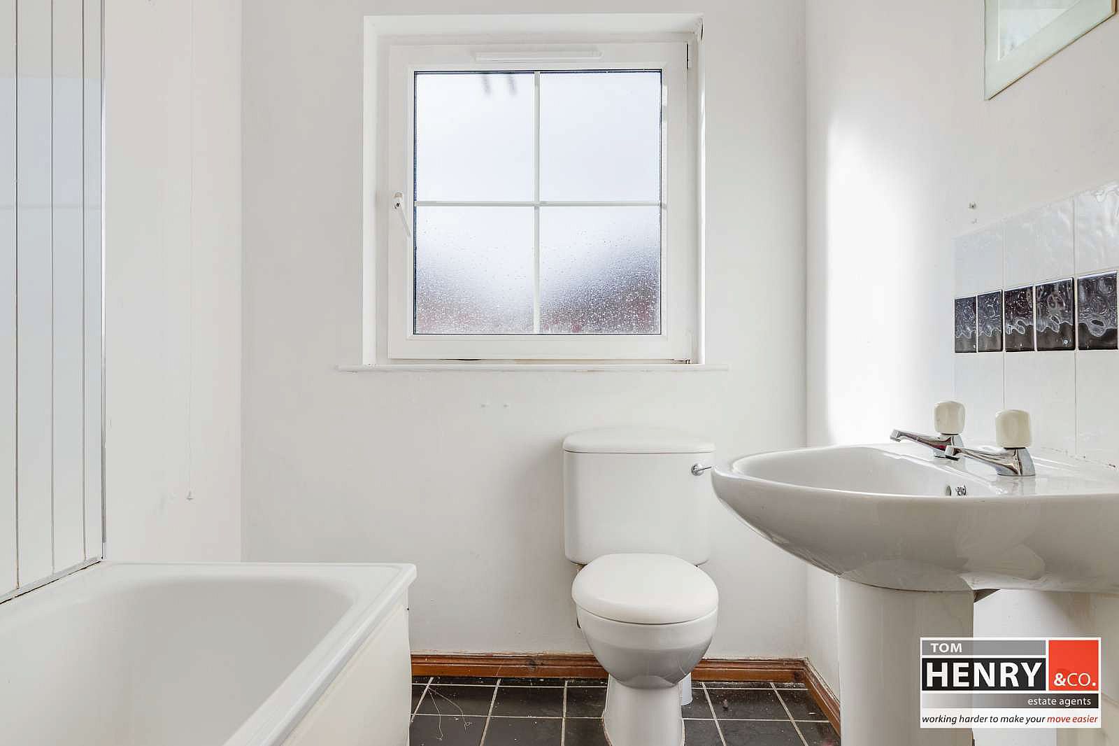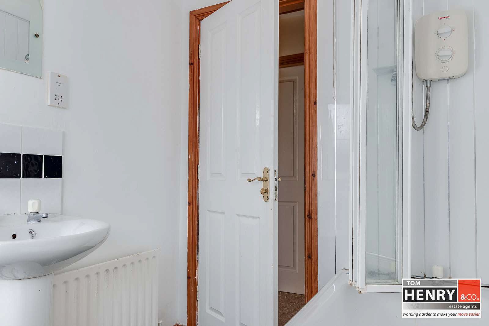 BATH WITH ELECTRIC SHOWER OVER. WASH HAND BASIN WITH TILED SPLASH BACK. TOILET. TILED FLOOR.