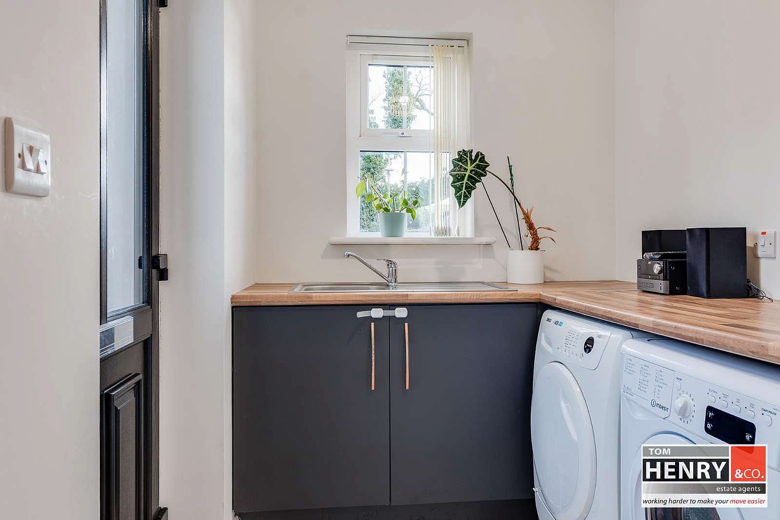 FITTED UNITS TO COMPLIMENT KITCHEN. S.S. SINK & DRAINER WITH MIXER TAP FITTING. PLUMBED FOR A.W.M.. SPACE FOR TUMBLE DRYER. TILED FLOOR. X-FAN. COMPOSITE EXTERNAL DOOR WITH GLAZED TOP PANEL.