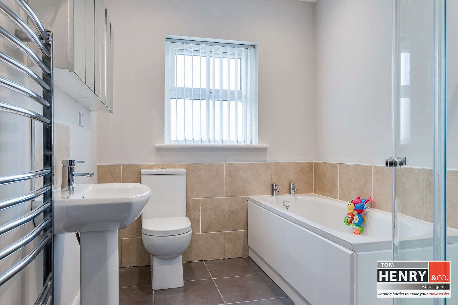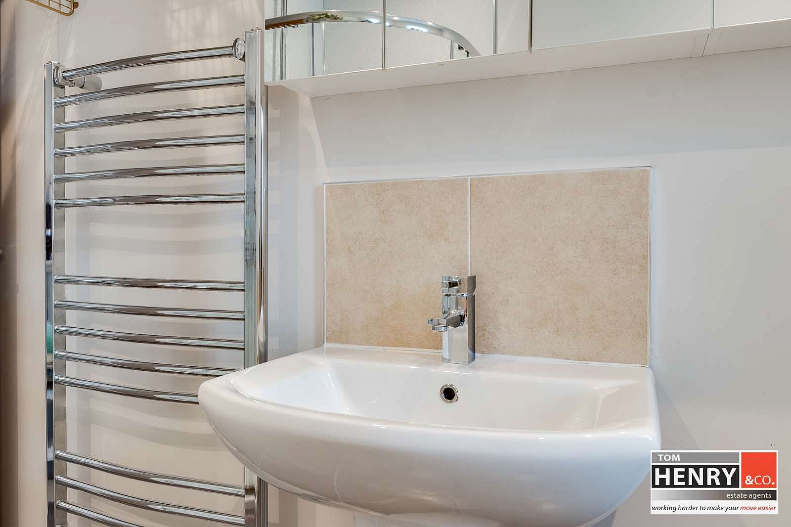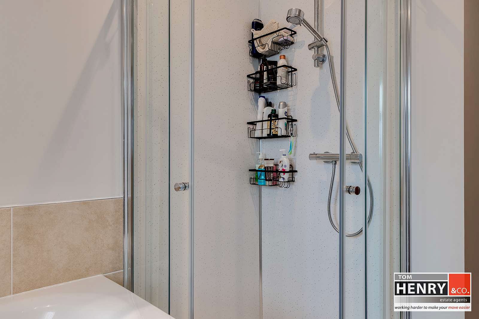BATH. P.V.C. CLAD SHOWER. WASH HAND BASIN WITH MIXER TAP FITTING & TILED SPLASH BACK. PROVISION FOR ILLUMINATED MIRROR. TOILET. HEATED TOWEL RAIL. SOME WALL TILING. TILED FLOOR. DOWNLIGHTING TO CEILING. X-FAN.