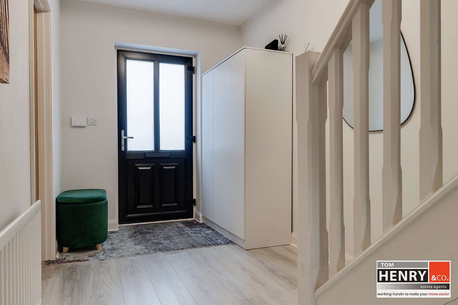 OUTSIDE LIGHT. COMPOSITE EXTERNAL DOOR WITH GLAZED TOP PANELS. PRE-FINISHED FLOOR. CARPET TO STAIRS TO FIRST FLOOR.