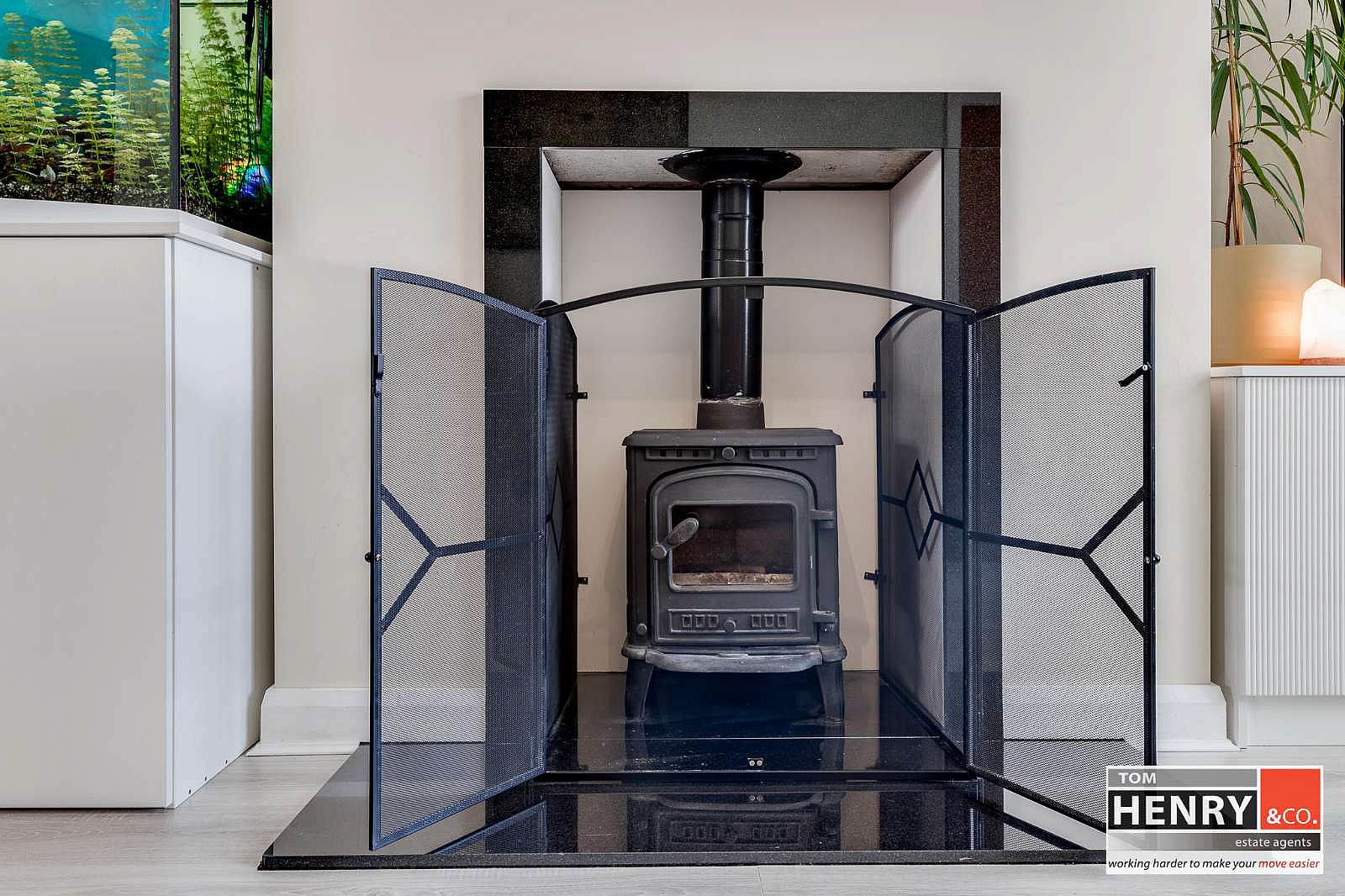 GLASS FRONTED STOVE IN INGLENOOK WITH GRANITE HEARTH & SURROUND. PRE-FINISHED FLOOR. PART OPEN TO KITCHEN / DINING AREA.