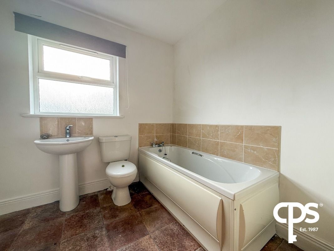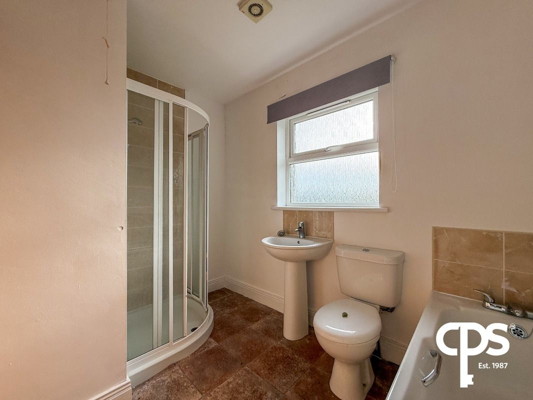 A generous four-piece family bathroom suite comprising W/C, wash hand basin, bath, and electric shower. Finished with tiled flooring.