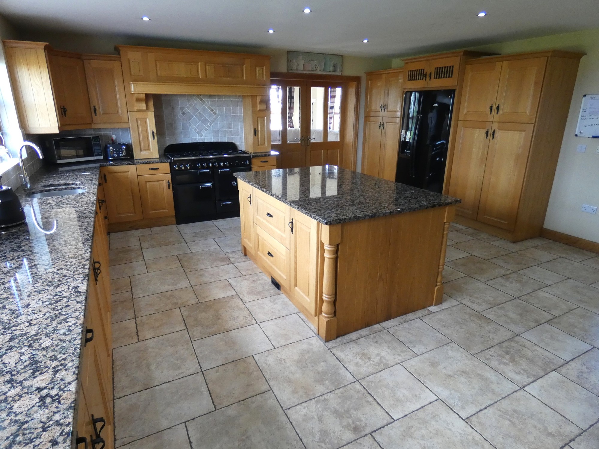 With an attractive range of eye and low level units, granite worktops, Inset bowl and a half stainless steel sink, Rangemaster Elan Stove with a feature surround and overmantle, tiled between the worktops and the eye and low level units, integrated dishwasher, space for an American style fridge/freezer, 2 double larder units, island unit with large pan drawers, recessed ceiling spotlights, tiled floor and partly glazed double doors to the sun room.