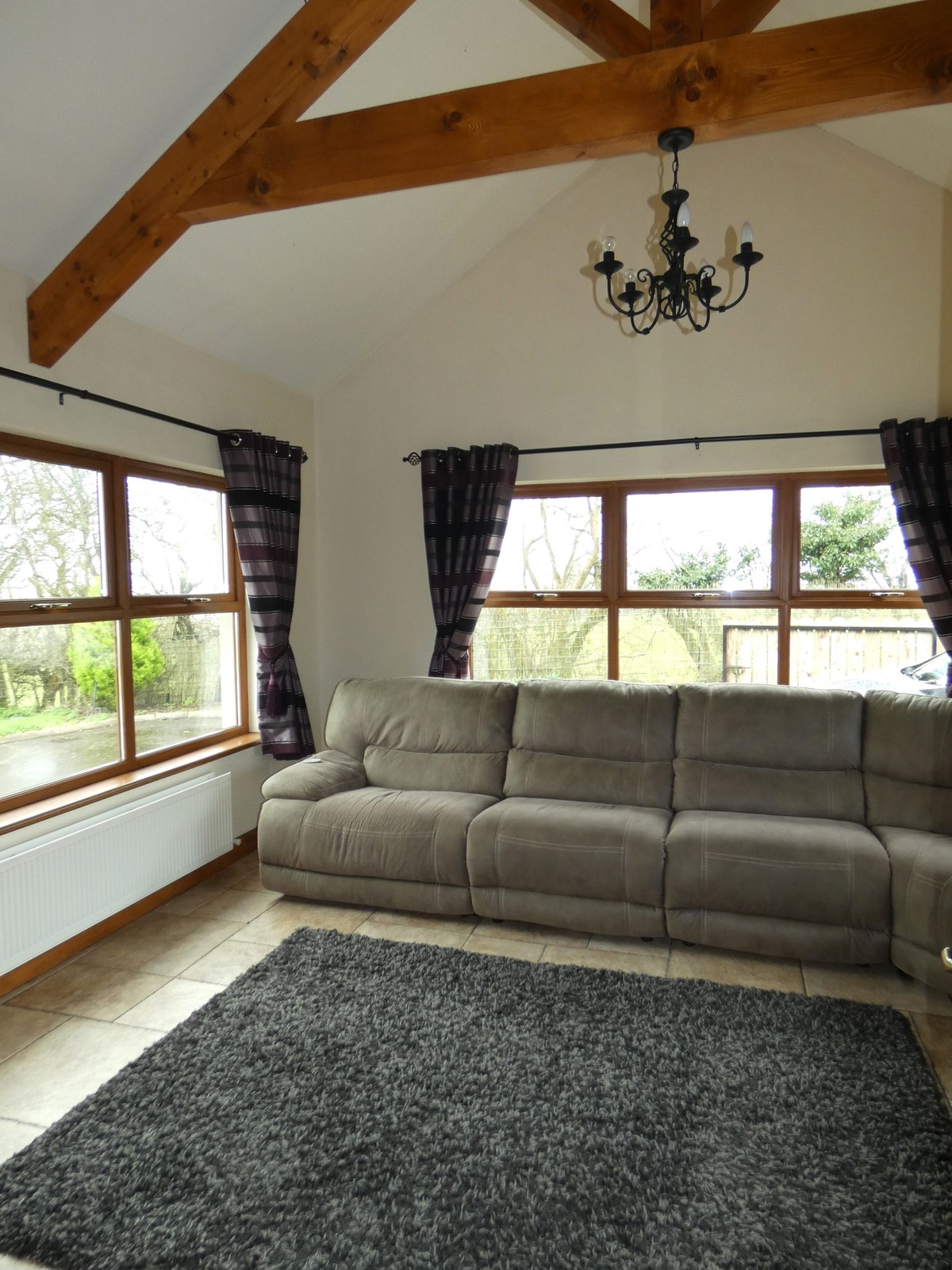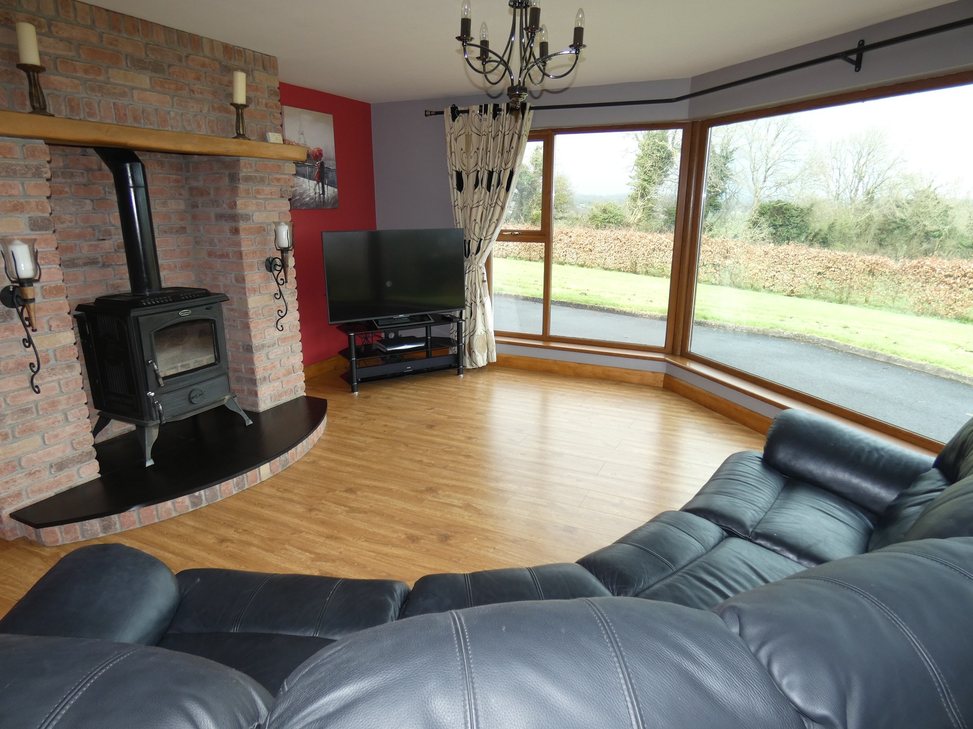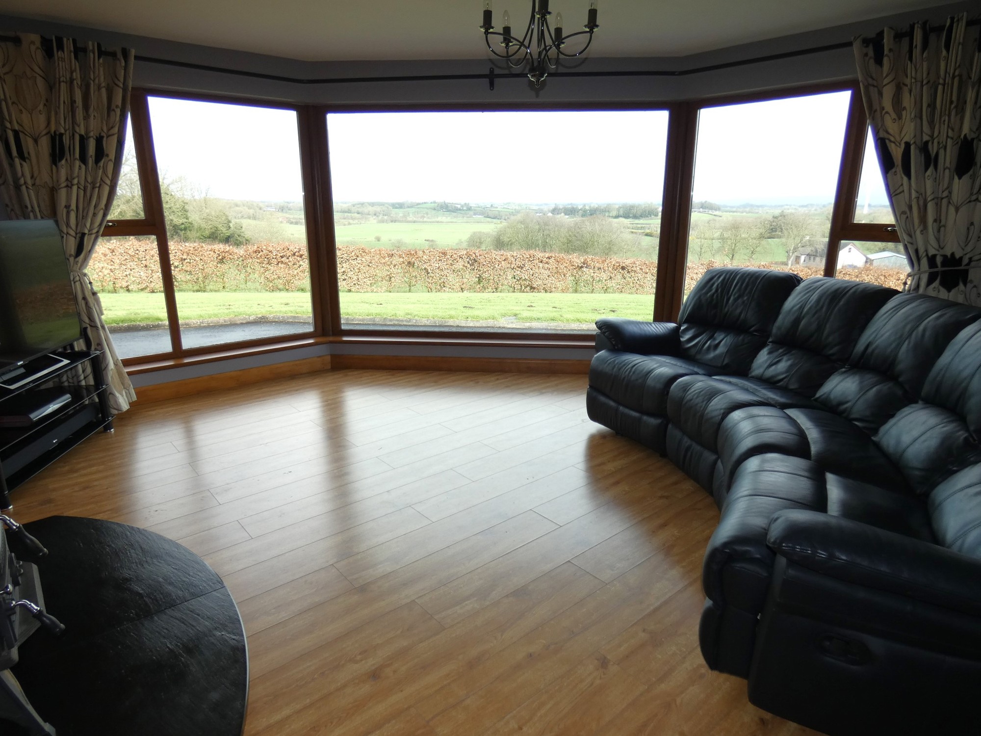 A superb room with the large glazing providing spectacular views over miles of the surrounding countryside, feature "horse flame" multi fuel stove (linked to the heating system) with an attractive brick surround and overmantle; wooden flooring and a media T.V. panel.