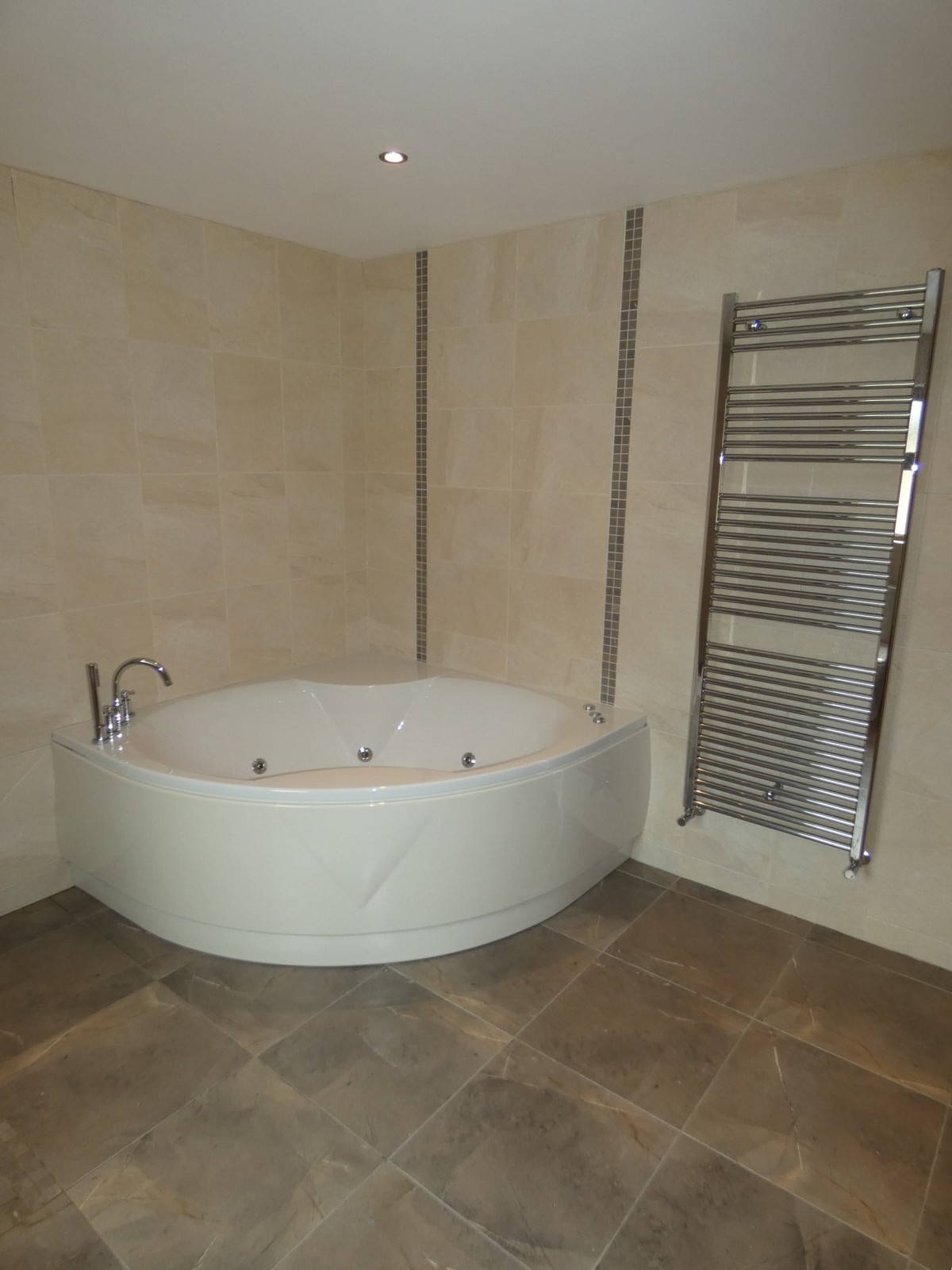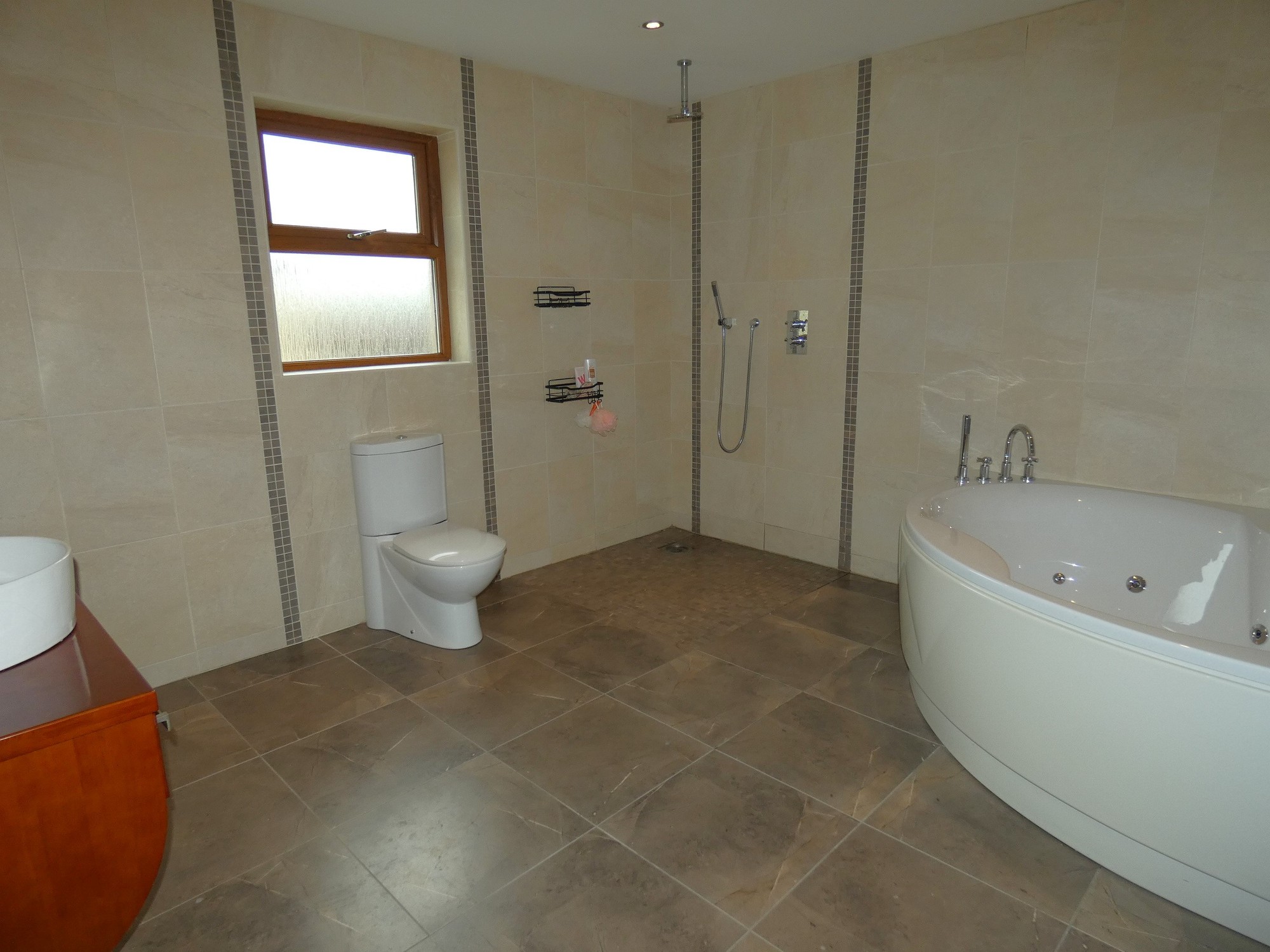 A luxurious family bathroom and wet room with a corner jacuzzi bath, tiled walls, tiled floor, wc, feature sink/vanity unit, heated chrome towel rail, recessed ceiling spotlights and the open shower area - mains mixer shower with a dench head over and a flexible hand shower attachment.