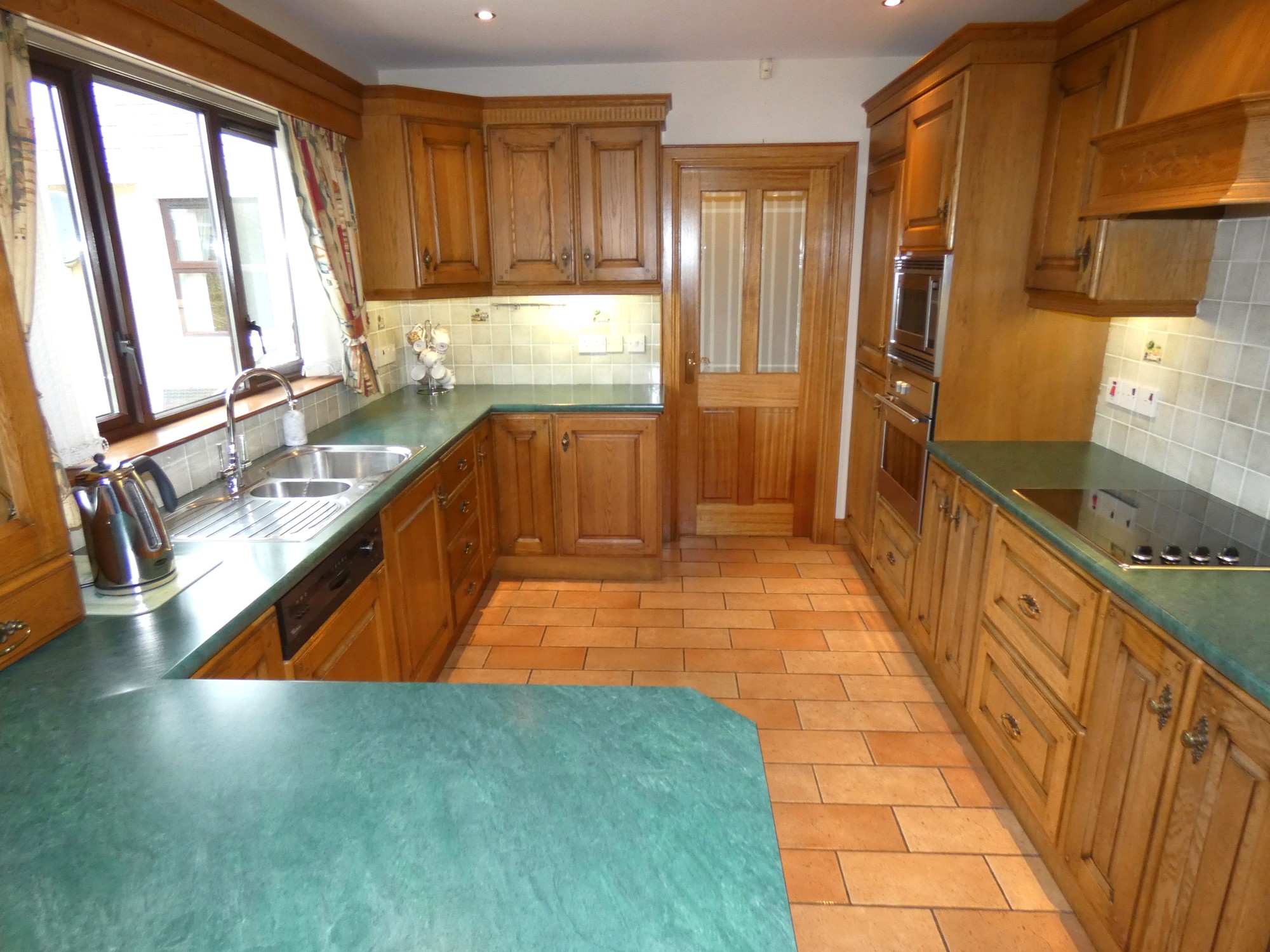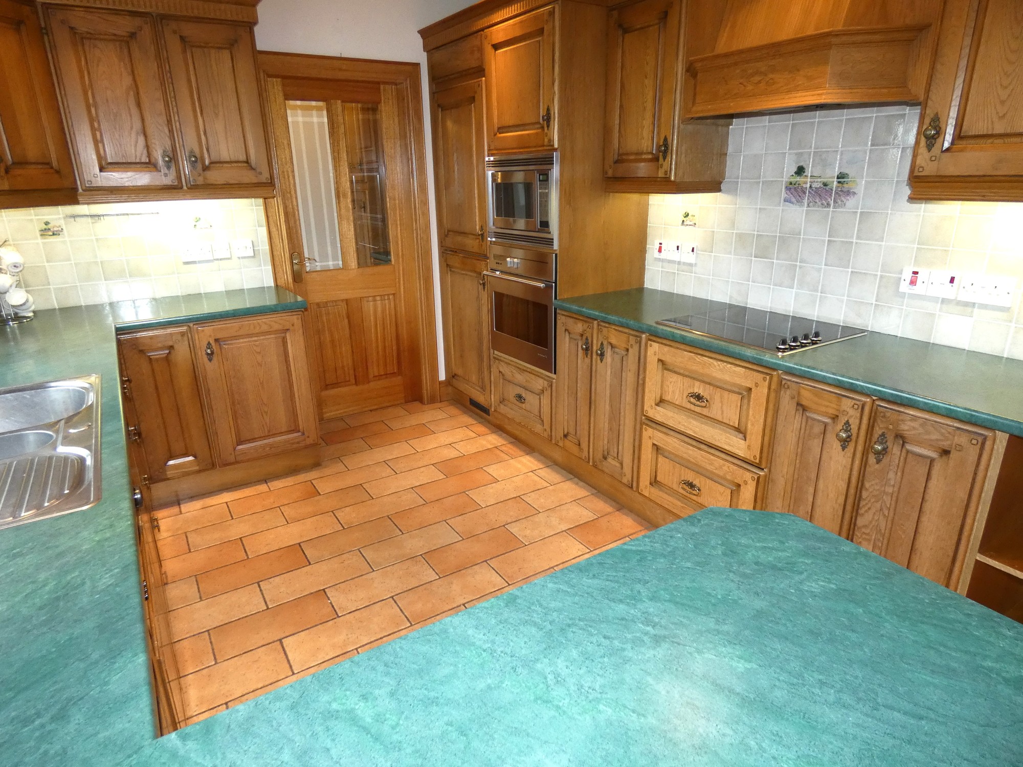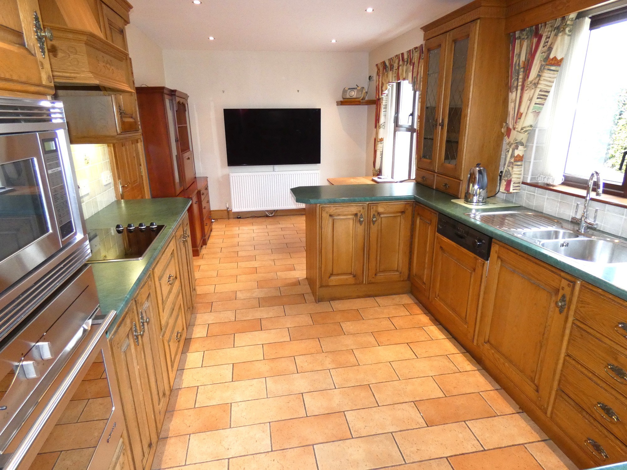 With an extensive range fitted eye and low level units, bowl and a half stainless steel sink, tiled between the worktops and eye level units, ceramic hob with an extractor canopy over, eye level oven and microwave, integrated fridge freezer, integrated dishwasher, pan drawers, leaded glass display units, window pelmet, recessed ceiling spotlights, tiled floor, a high level tv point, and a door to the utility room.