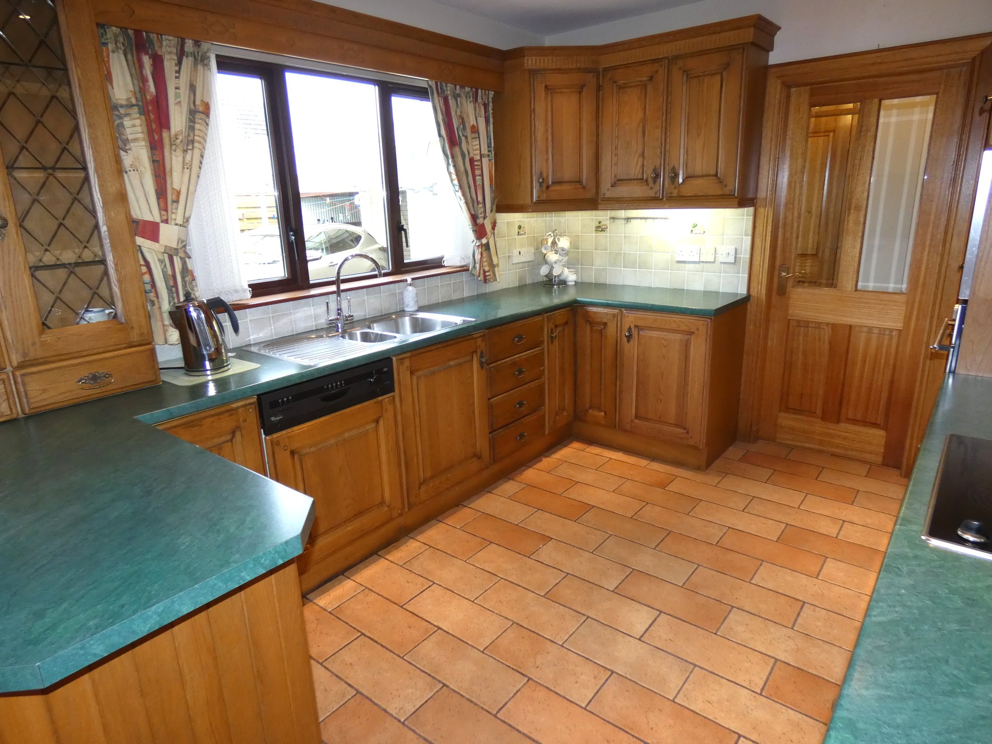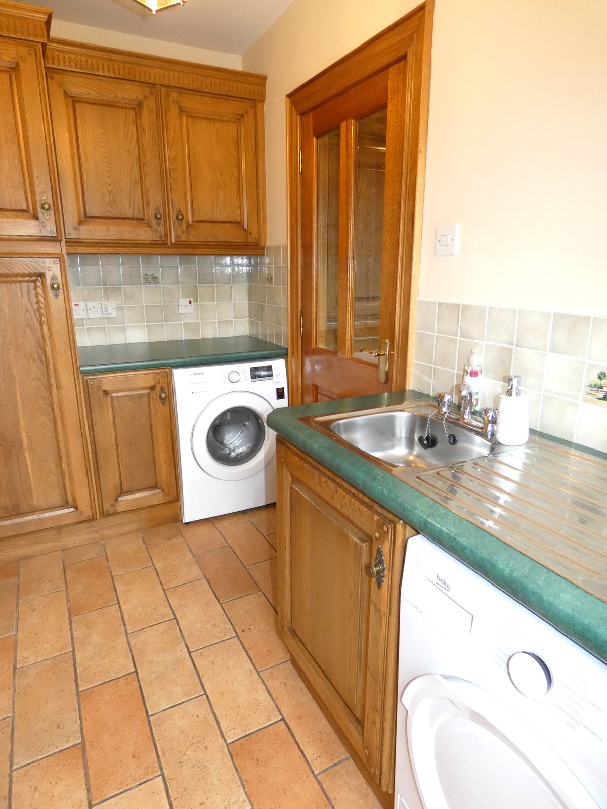 With a range fitted units, stainless steel sink unit, tiled between the eye and low level units, larder cupboard, plumbed for an automatic washing machine, space for a tumble dryer, tiled floor, a door to the rear and a separate cloakroom.