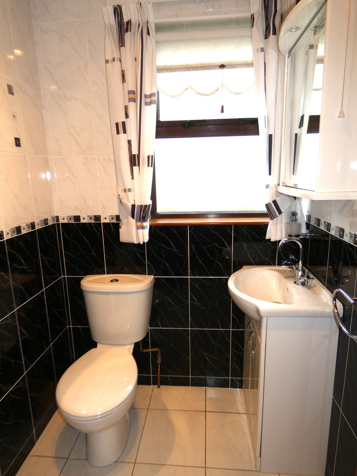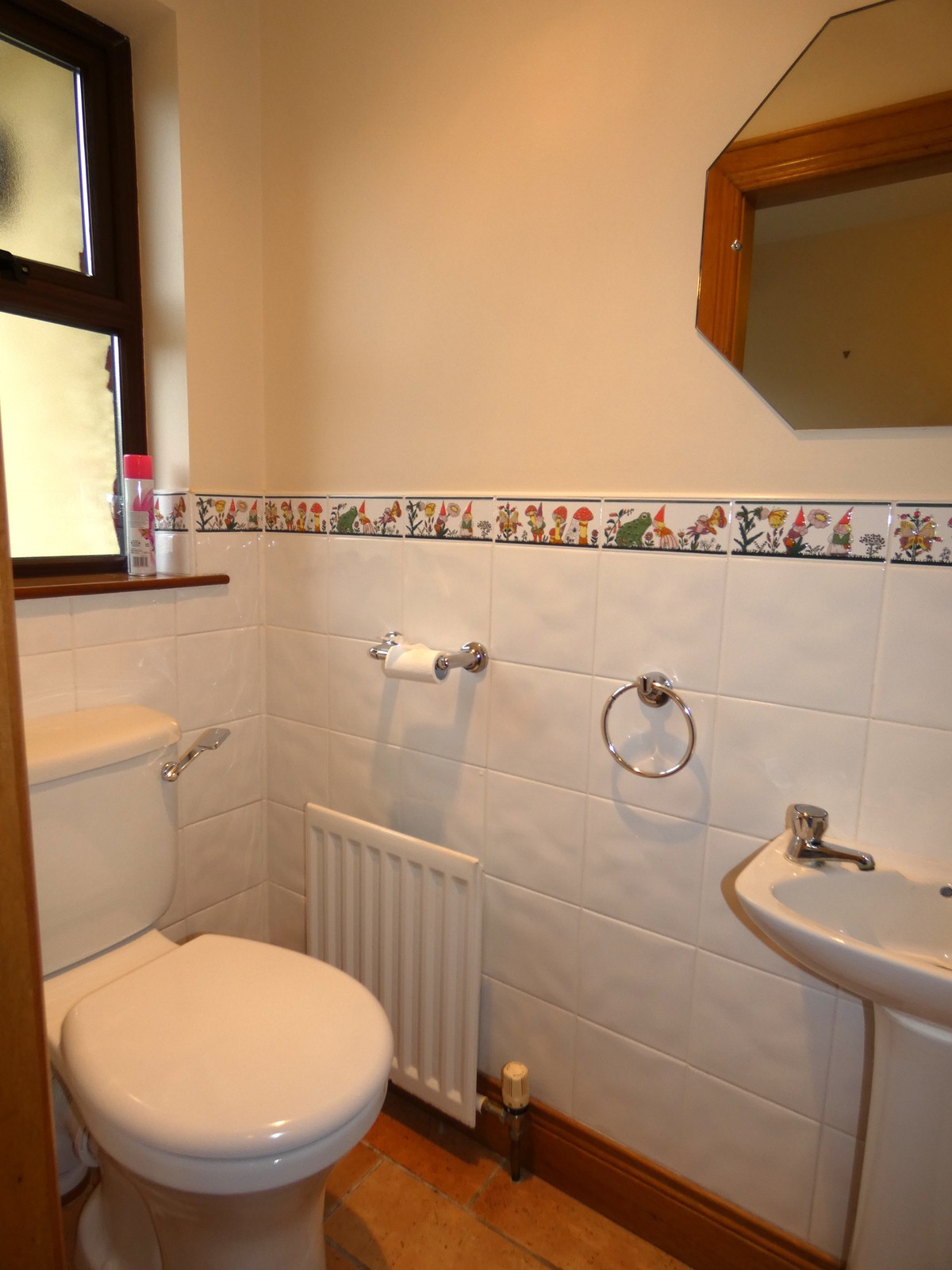 with a w.c, a pedestal wash hand basin, partly tiled walls extractor fan and a tiled floor.