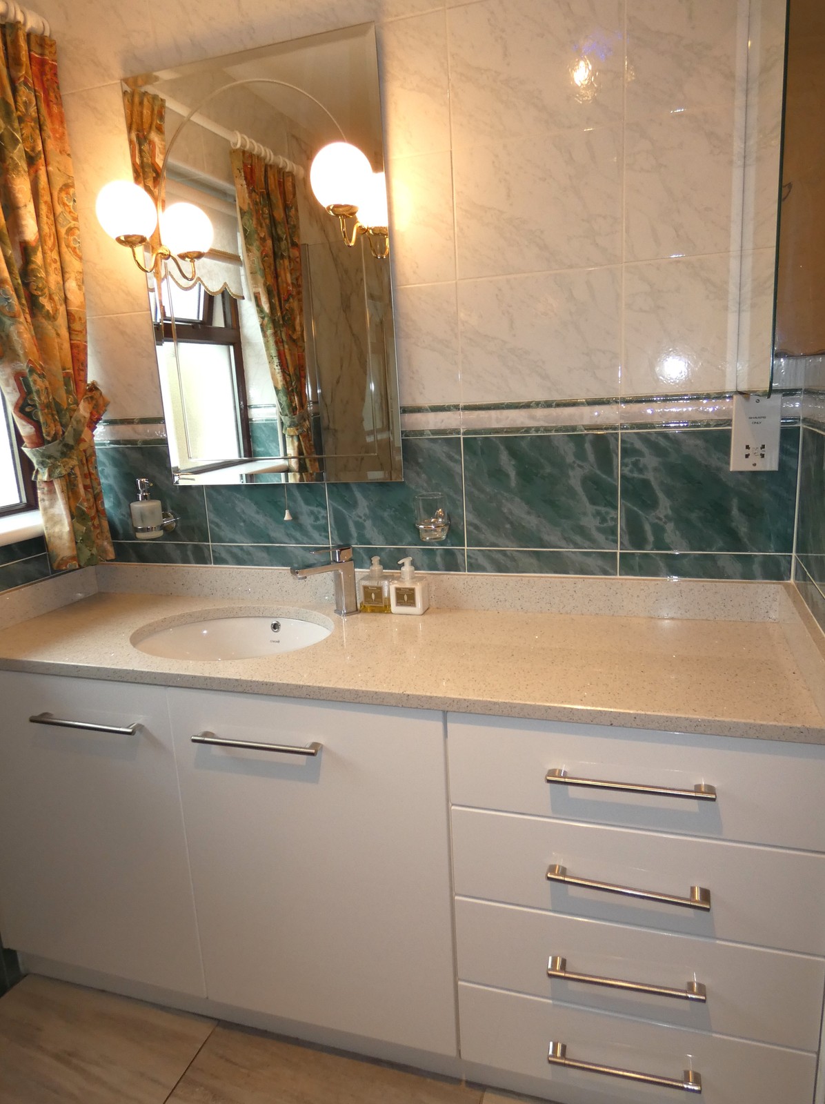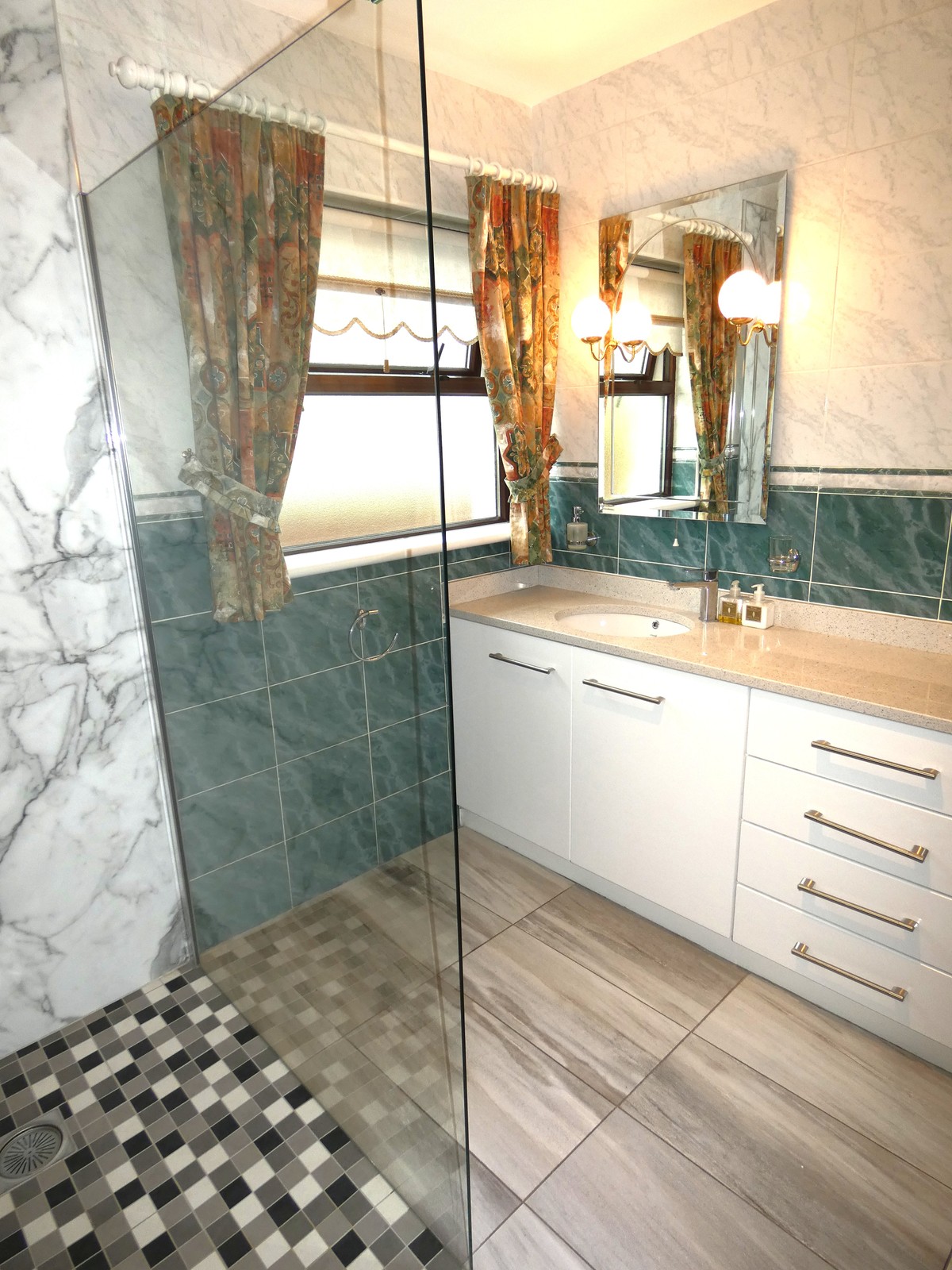 (Average size and partially excluding the second shower cubicle) A luxurious family shower room including a large vanity area with a composite type work top and an inset sink with generous storage including drawers below and a fitted mirror over; shaver point, tiled floor, tiled walls, extractor fan; w.c; and TWO shower cubicles - the first the large open shower area with a glazed splash back screen including a marble panelled surround with a drench head over and a flexible hand shower attachment; the second shower cubicle finished again in an attractive panelling with a drench head over and a flexible hand shower attachment.