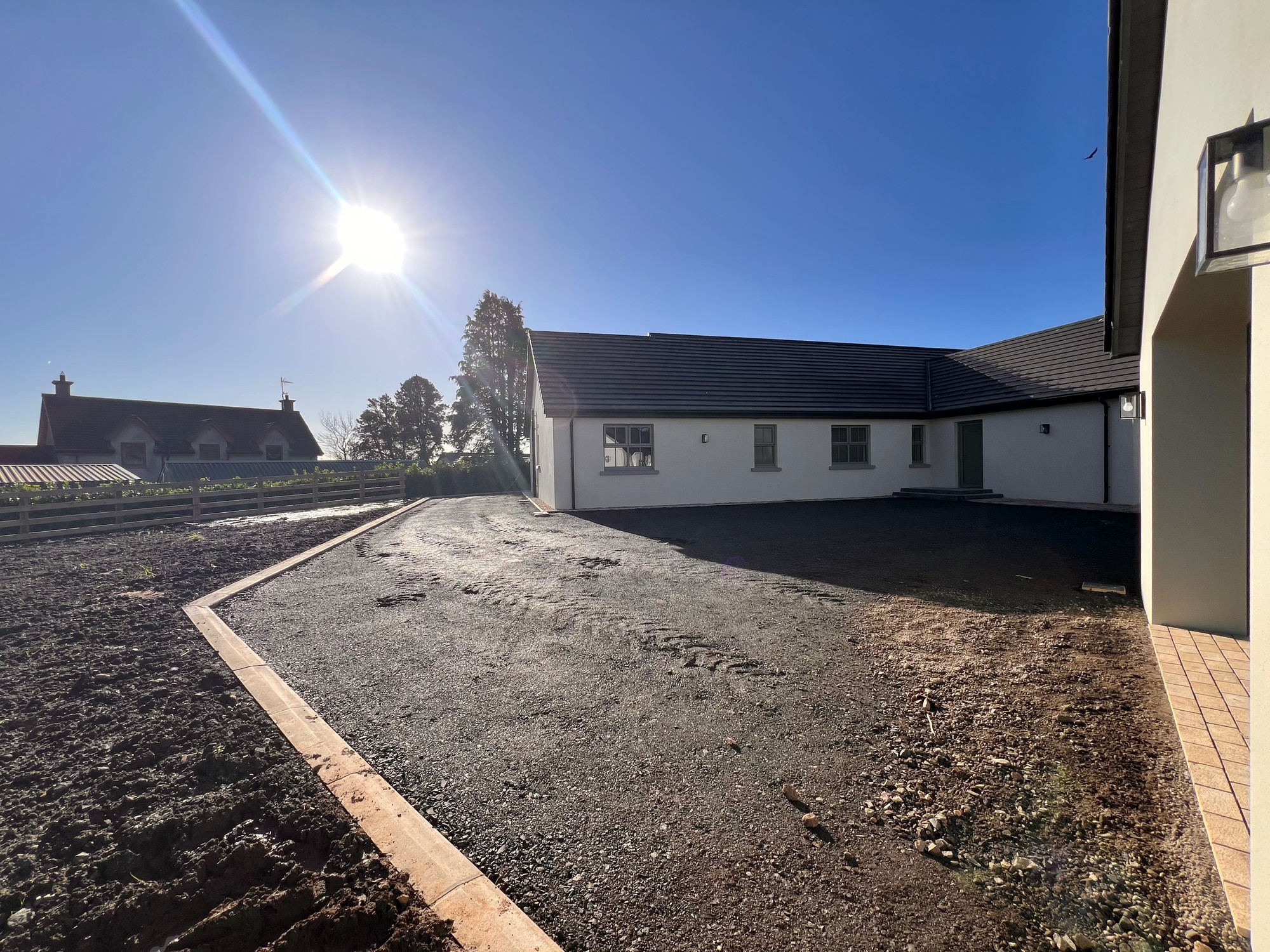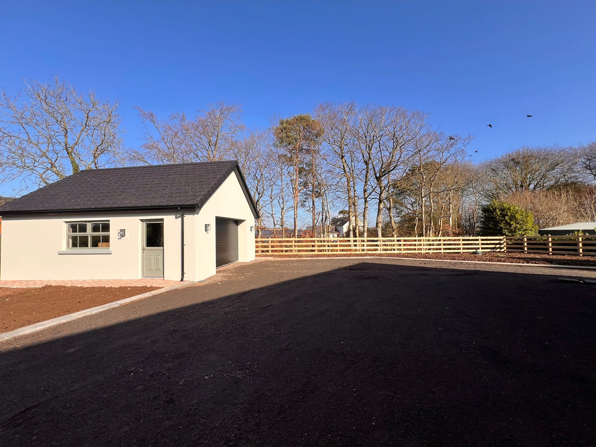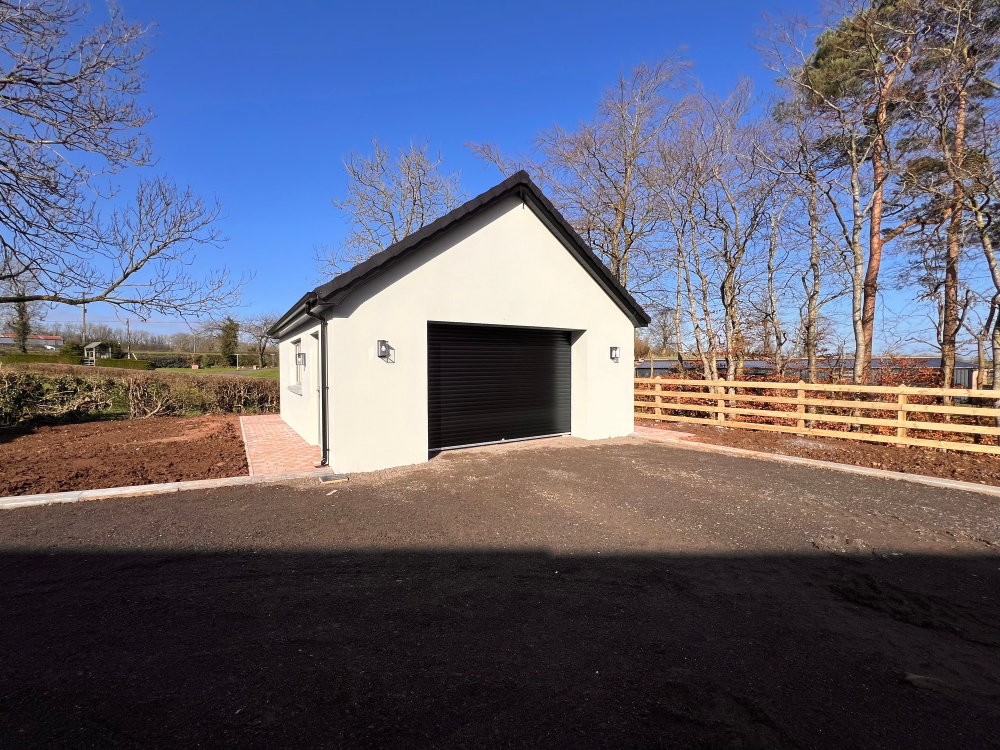 Externally, the property is approached by a gravel driveway with feature entrance pillars with gardens sown out in Spring. The boundary of the property is enclosed with wood fencing, with a large detached garage located to the rear of the property.
