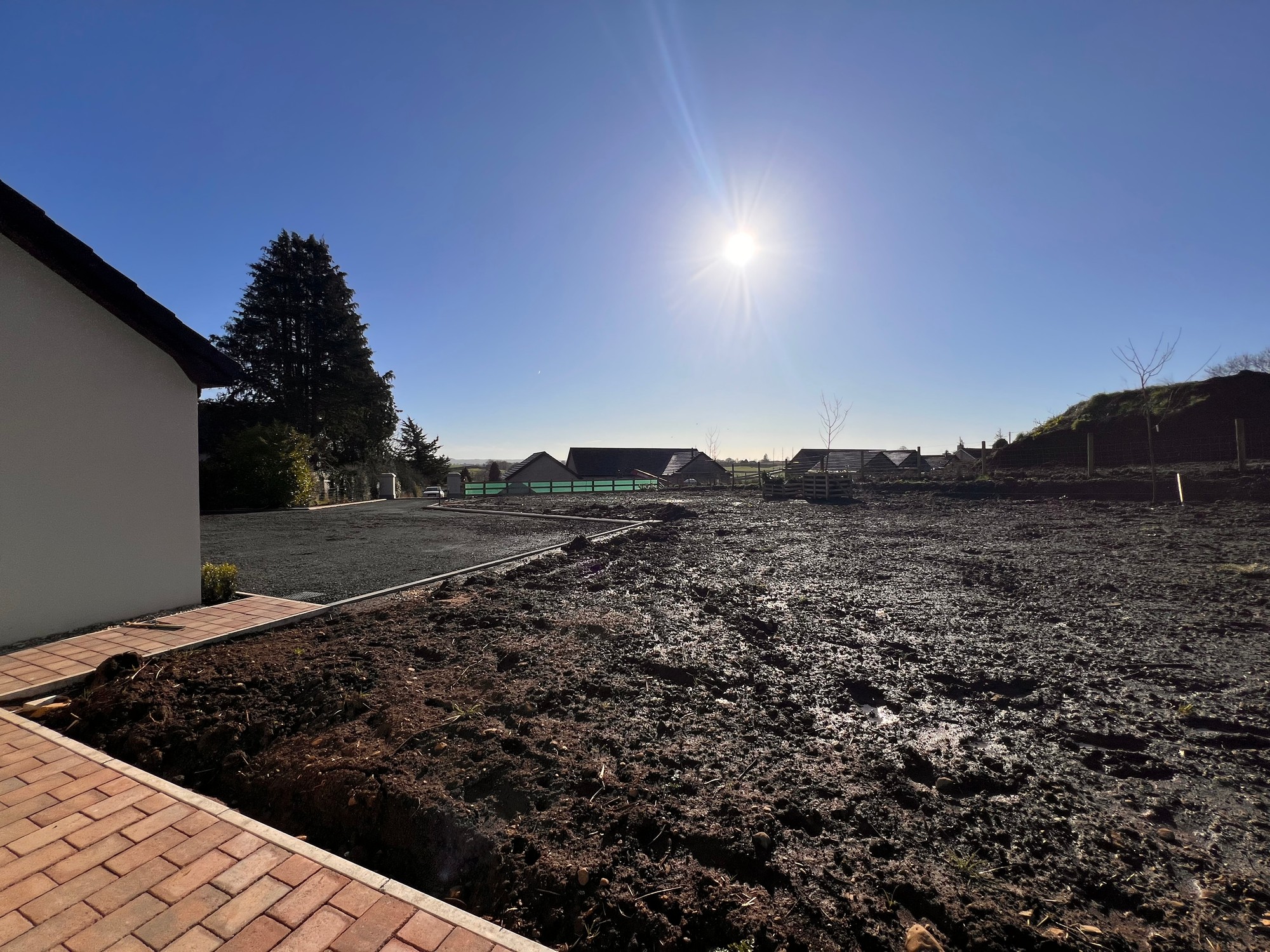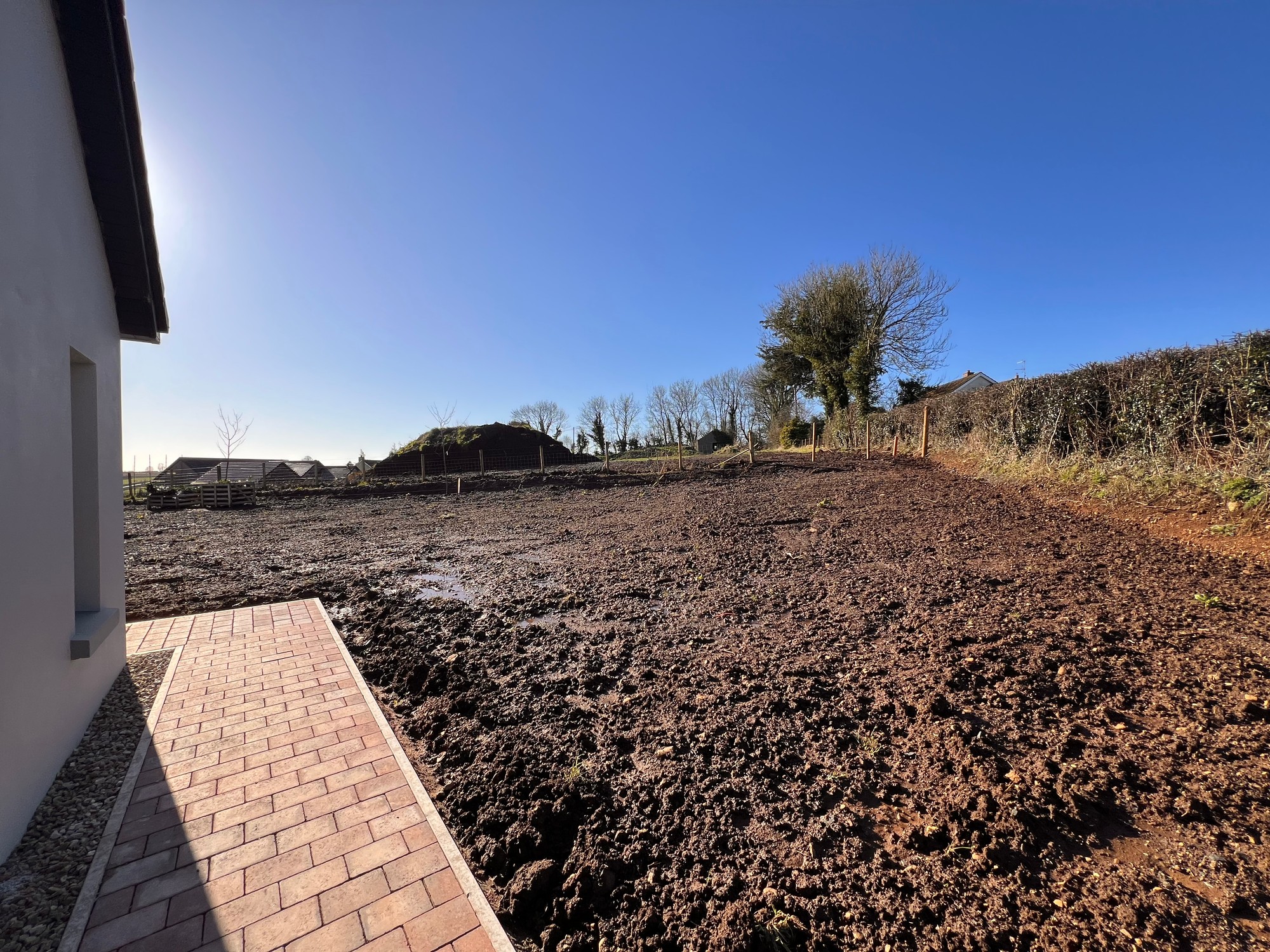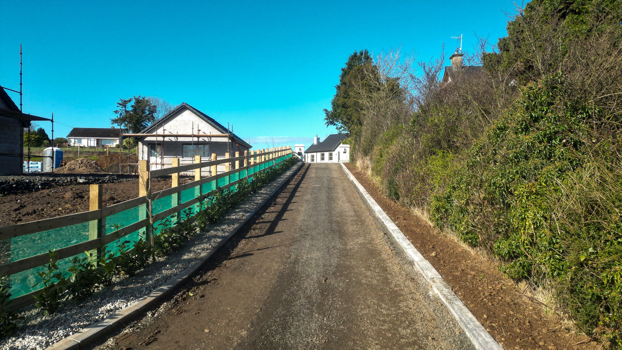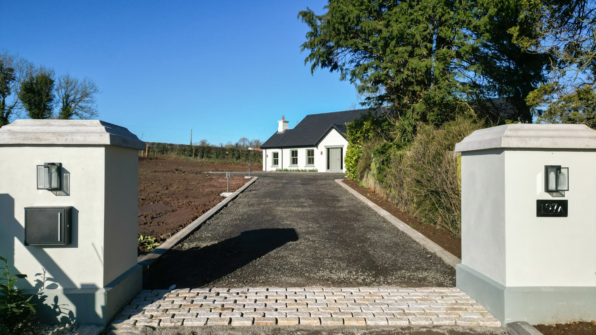 Externally, the property is approached by a gravel driveway with feature entrance pillars with gardens sown out in Spring. The boundary of the property is enclosed with wood fencing, with a large detached garage located to the rear of the property.