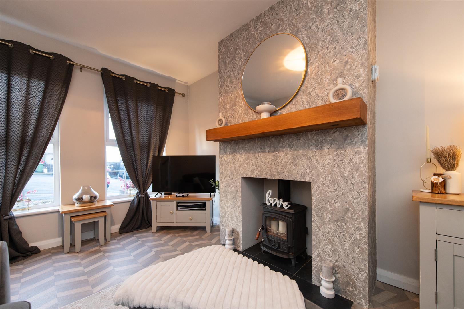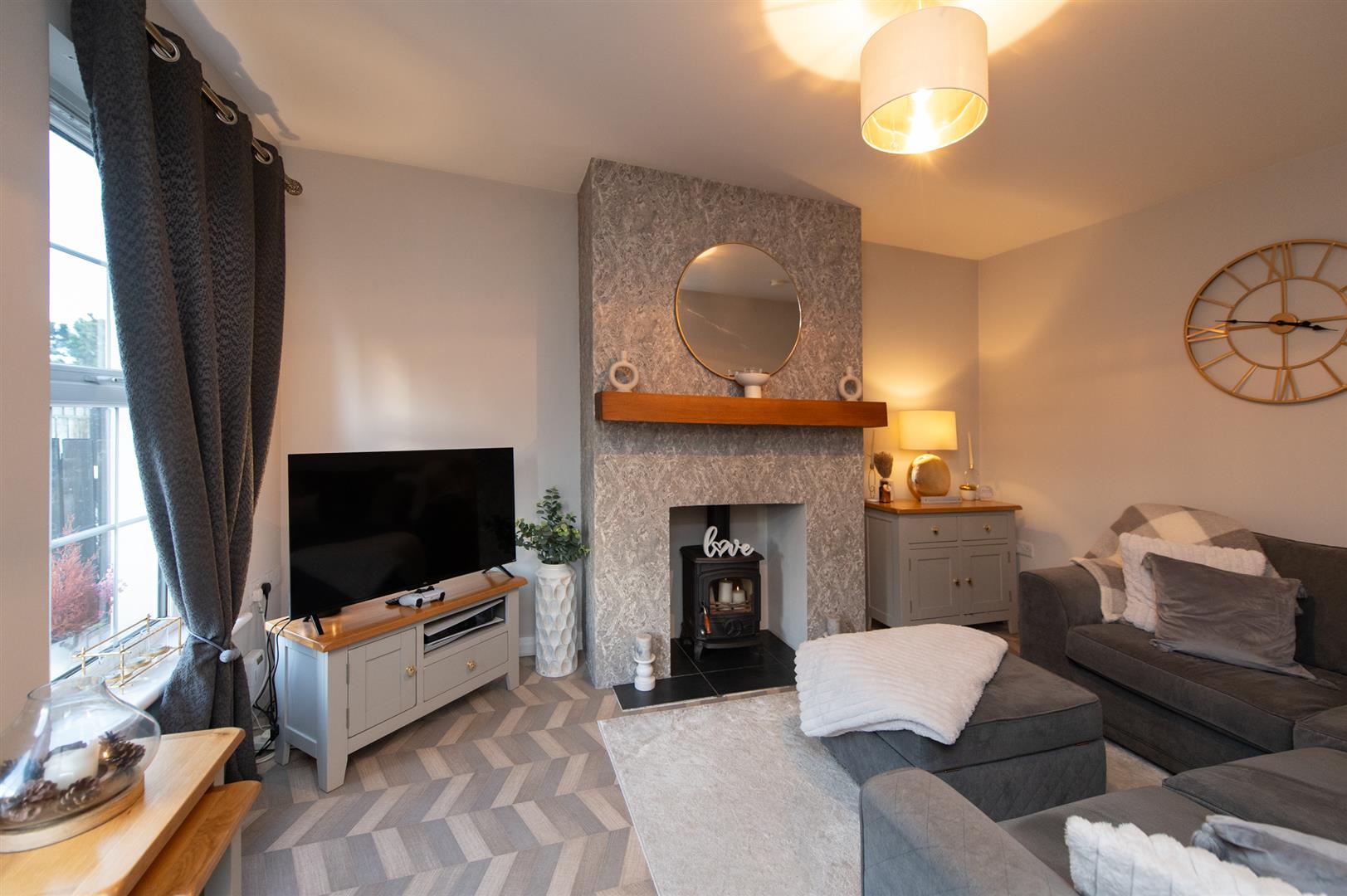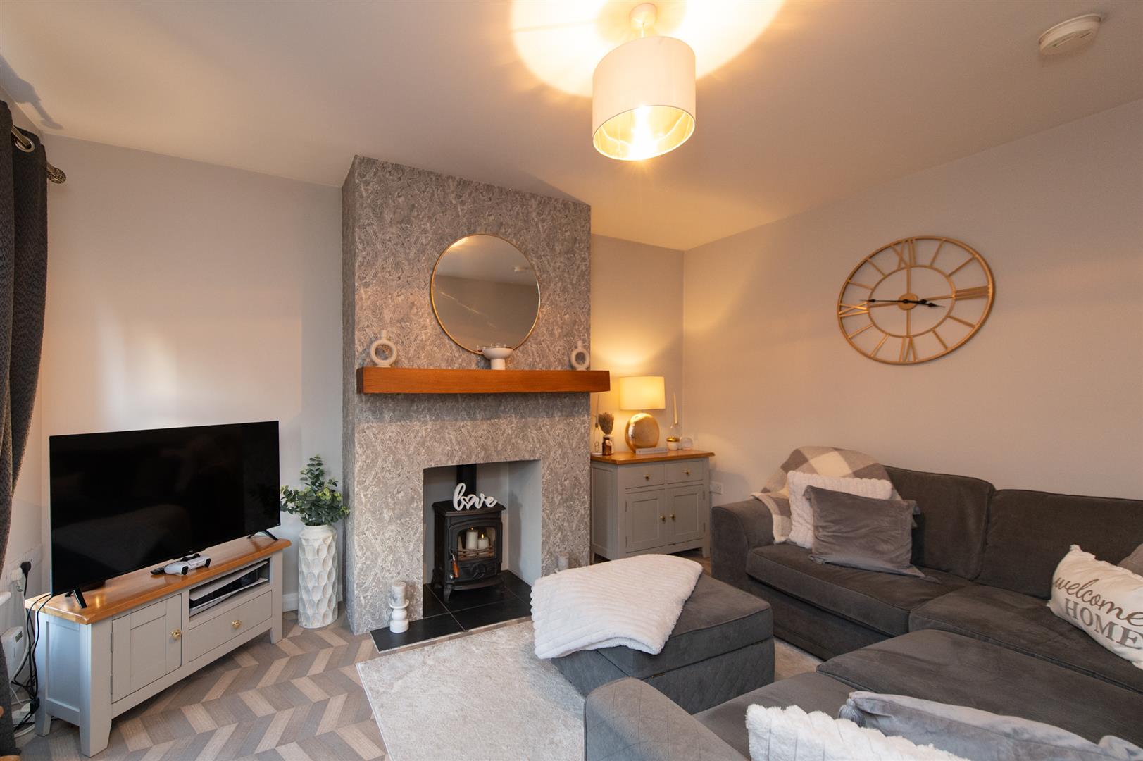 Entering you have a beautiful bright hallway with vinyl flooring and a decorative alcove offering storage. The lounge benefits from two front facing windows allowing the most of natural daylight in and a woodburning stove, perfect for all round family living. The kitchen is complete with a fitted modern kitchen, free standing fridge/freezer, free standing cooker and an integrated dishwasher. Downstairs also has a utility room with vinyl flooring and plumbed with space for a washing machine and drying machine along with a ground floor WC.