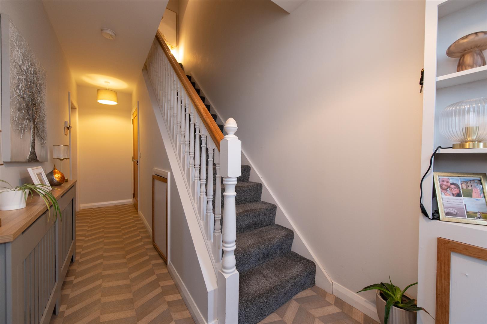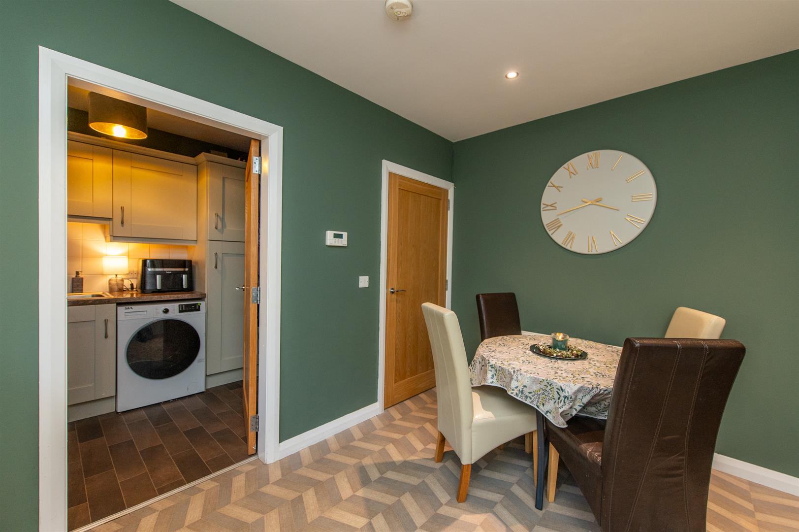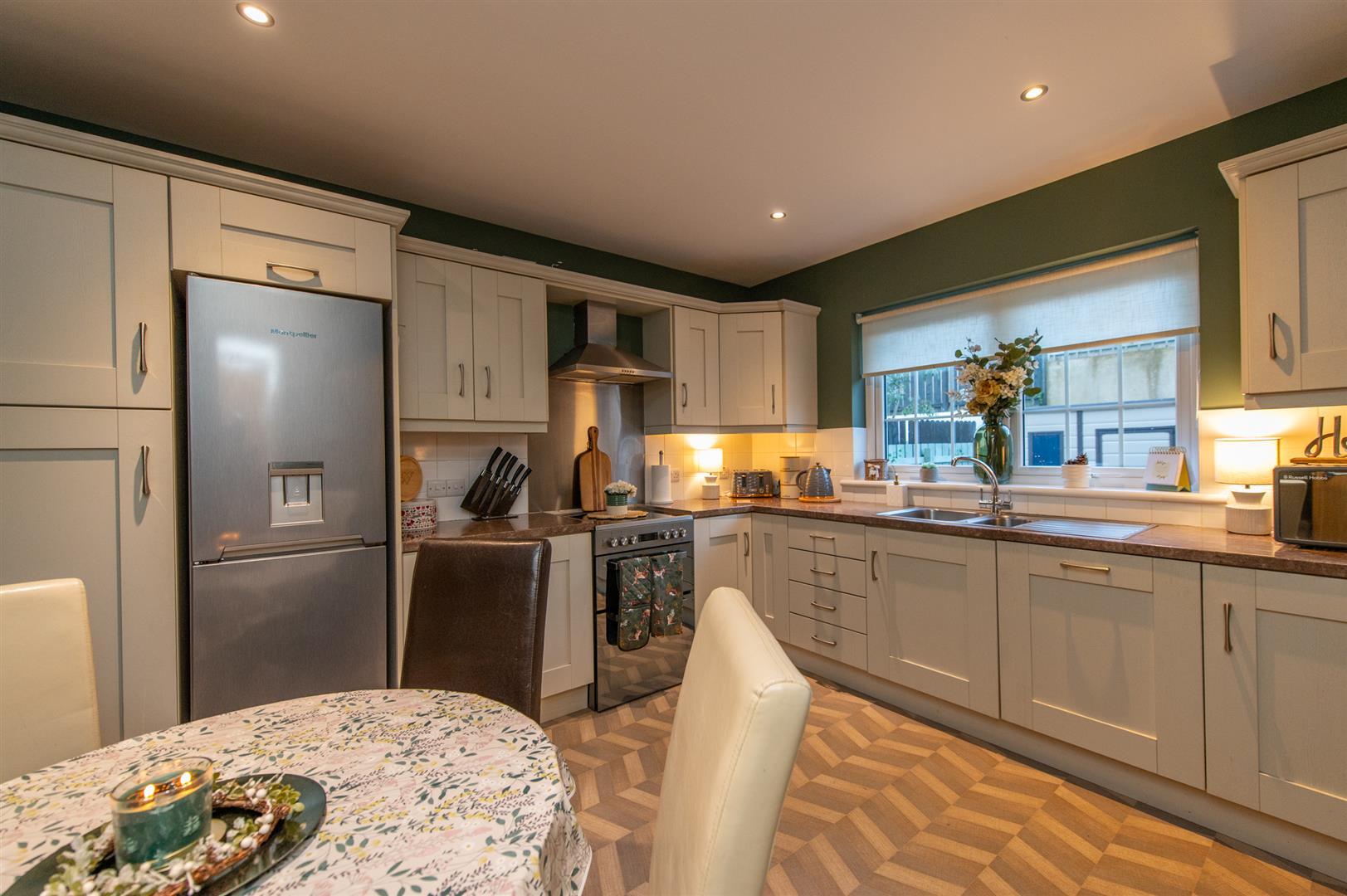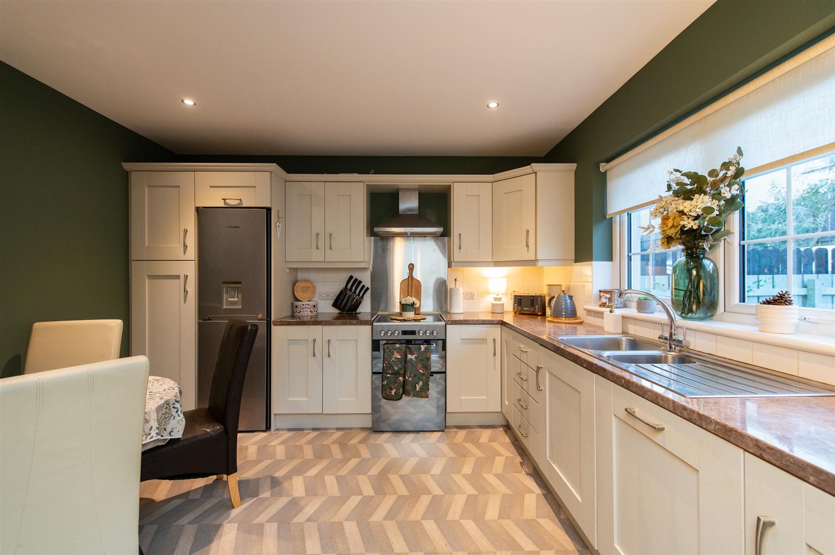 Entering you have a beautiful bright hallway with vinyl flooring and a decorative alcove offering storage. The lounge benefits from two front facing windows allowing the most of natural daylight in and a woodburning stove, perfect for all round family living. The kitchen is complete with a fitted modern kitchen, free standing fridge/freezer, free standing cooker and an integrated dishwasher. Downstairs also has a utility room with vinyl flooring and plumbed with space for a washing machine and drying machine along with a ground floor WC.