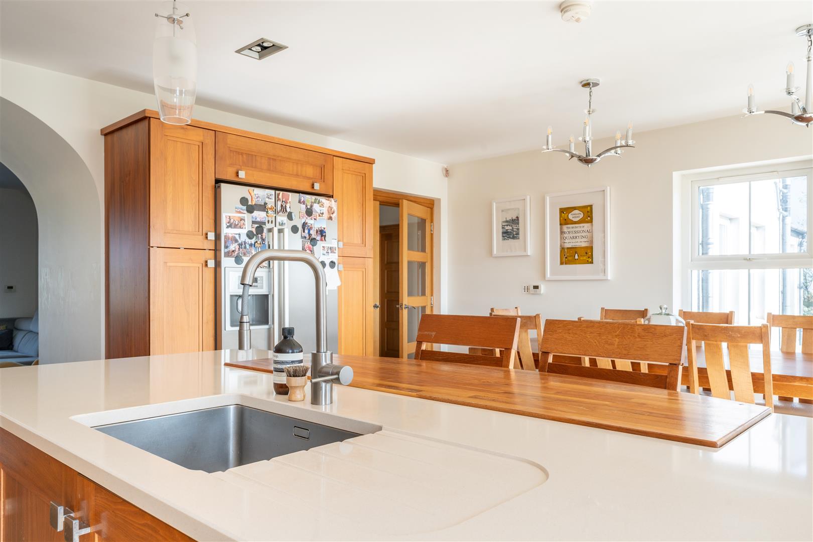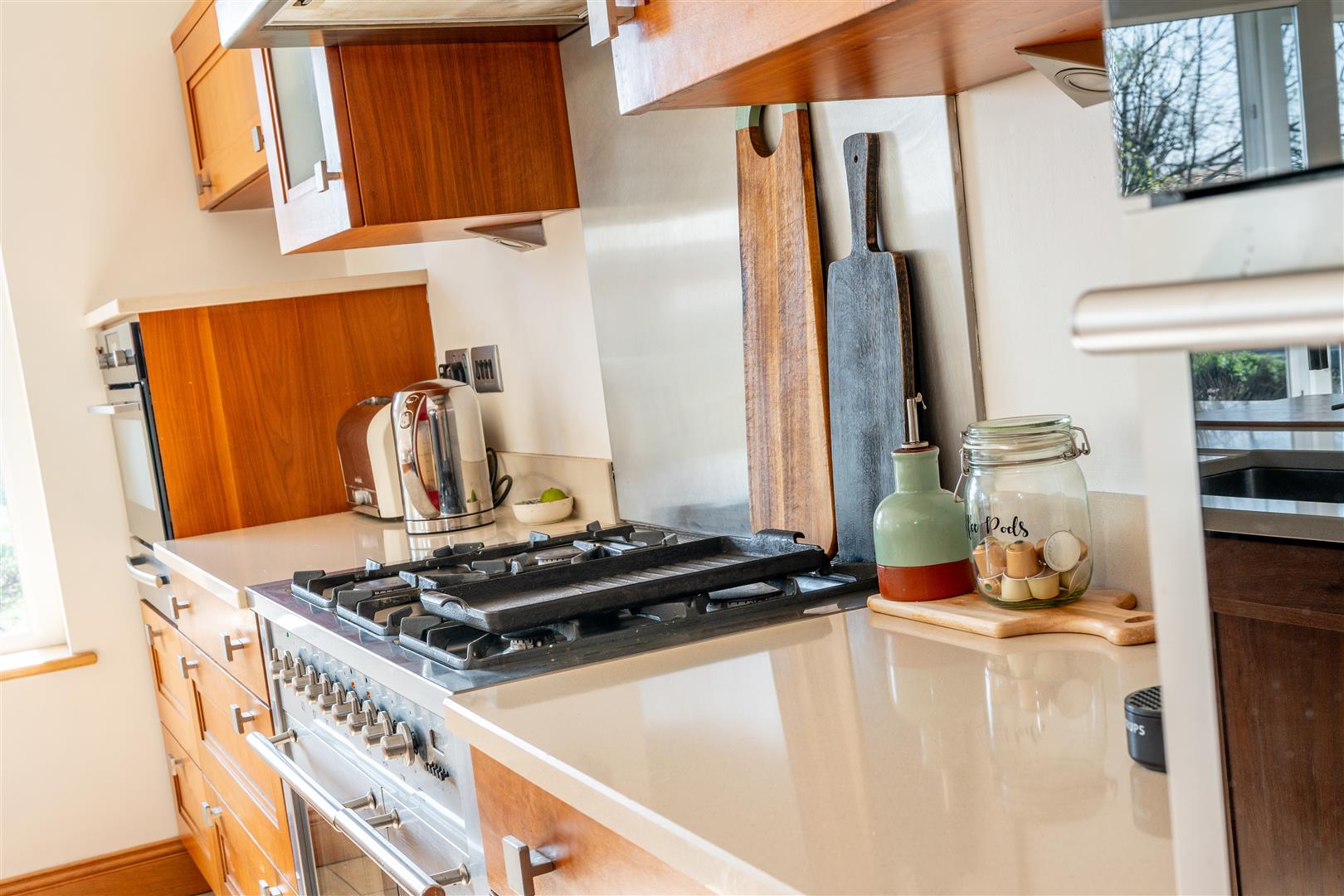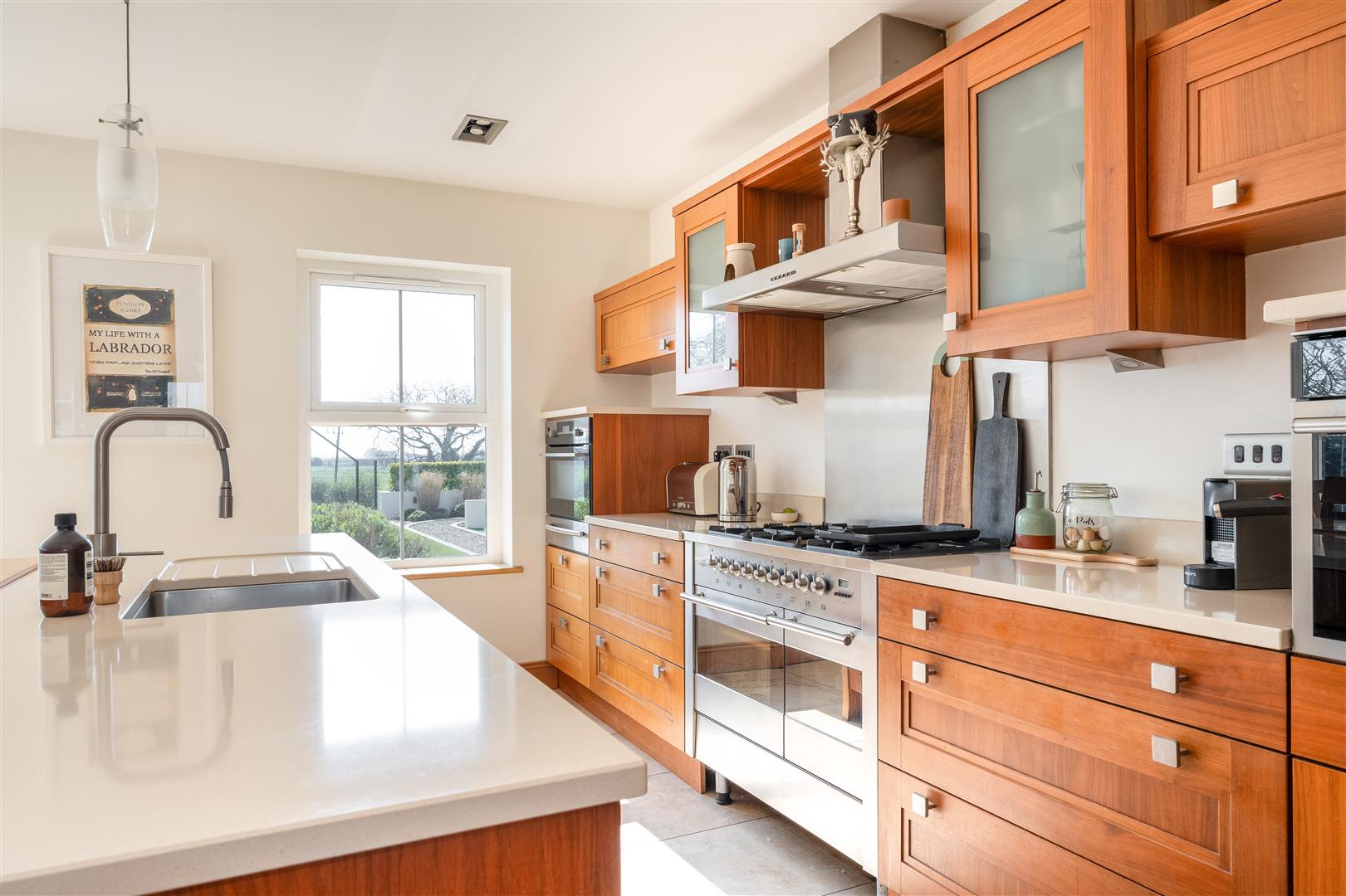 Excellent range of walnut high and low level cupboards and drawers with matching island unit incorporating a single drainer stainless steel sink with swan-neck mixer tap, Quartz worktops, space for range cooker, stainless steel extractor fan and light with stainless steel splashback, integrated appliances to include; AEG electric oven with Neff warming drawer, Hotpoint microwave and Bosch dishwasher. LED spotlighting, porcelain tiled floor, solid wood breakfast bar with feature lighting, Bosch American-style fridge/freezer in matching housing, double patio doors to rear patio and storage cupboard with shelving.