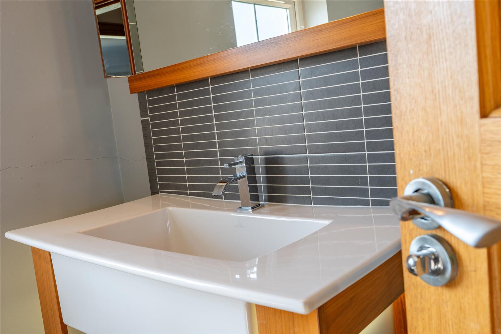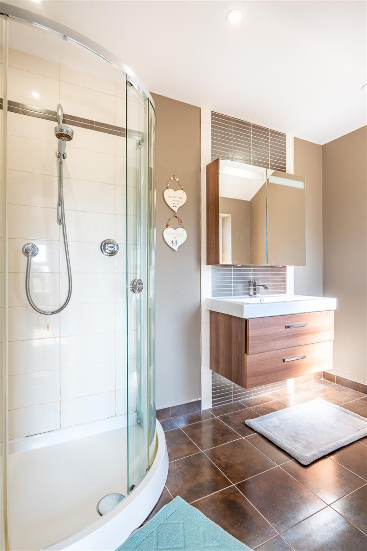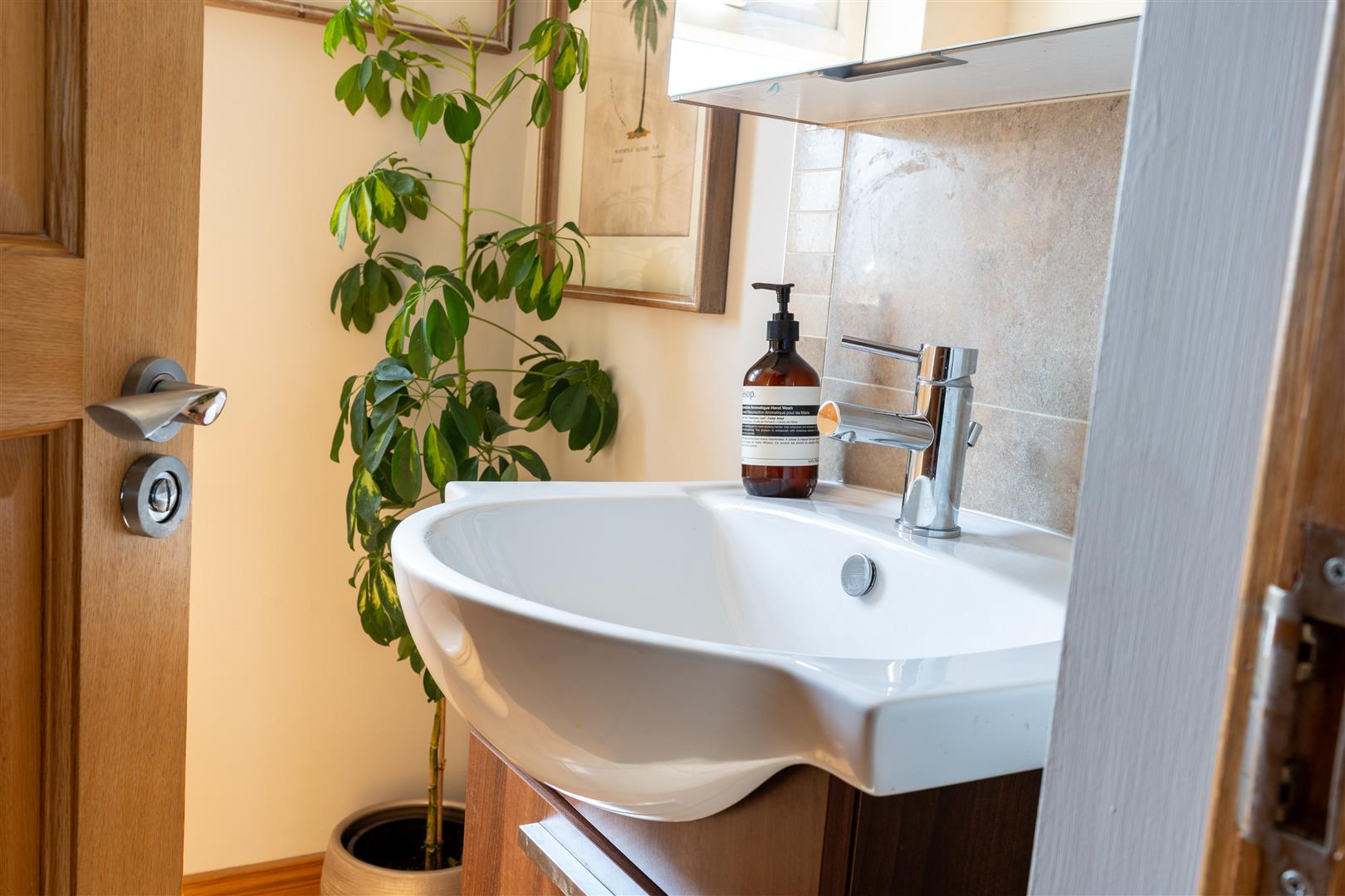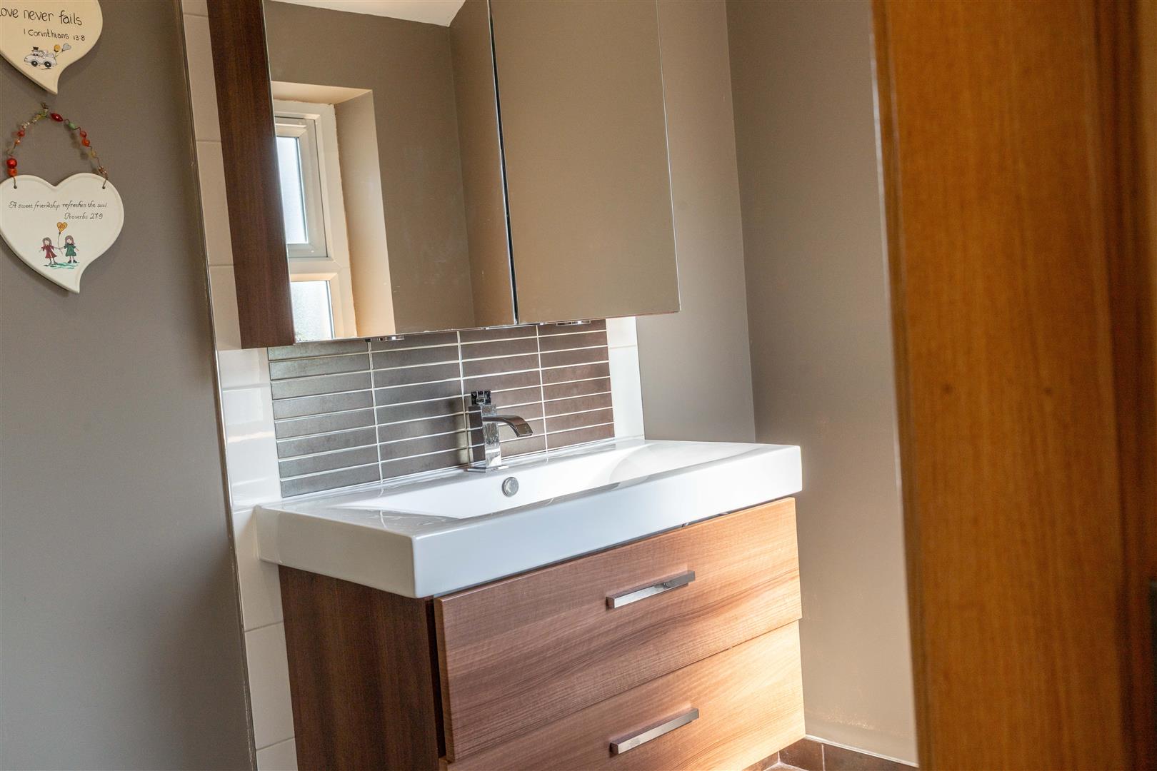 Modern white suite, large built in shower cubicle with built in shower, tiled walls and sliding shower door, wash hand basin with mixer tap, modern vanity cabinet , tile splash back, low flush w/c, chrome feature radiator, ceramic tiled floor, recessed spotlights, extractor fan.