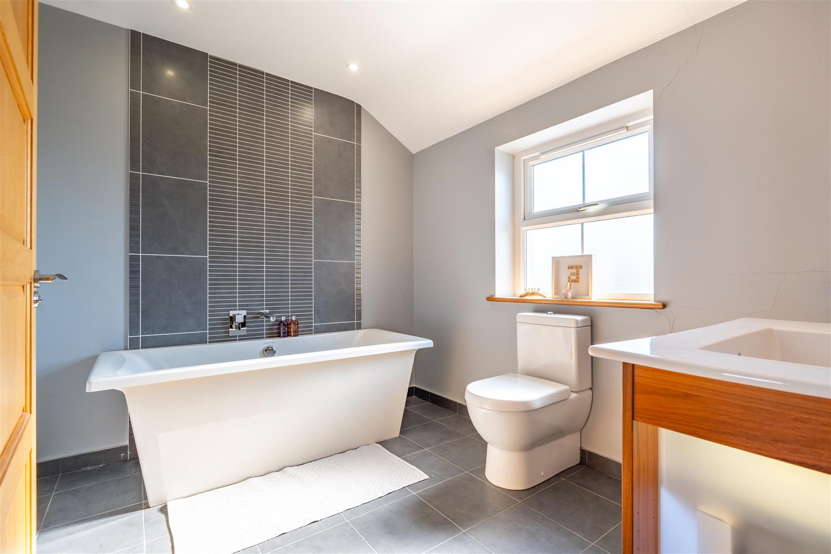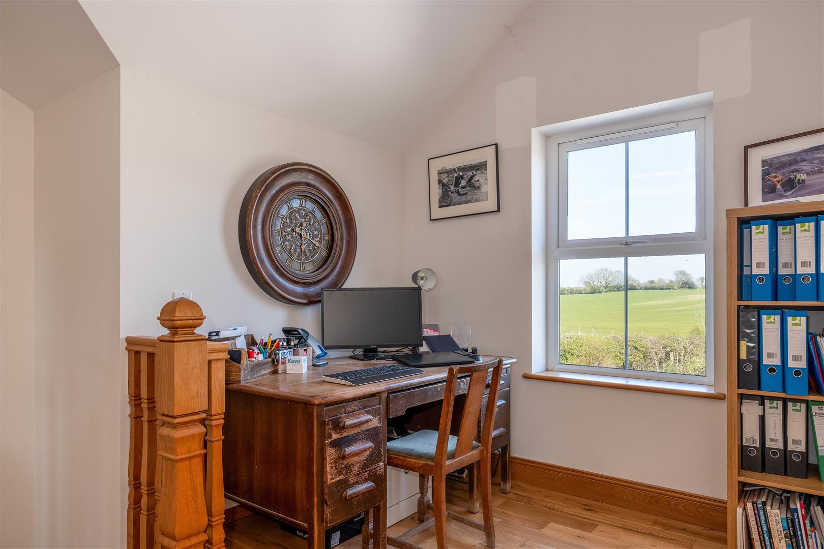 Upstairs, a striking galleried landing incorporates a dedicated study area and leads to four generous bedrooms. The principal suite enjoys countryside views, a fitted dressing room and a modern ensuite, while another bedroom also benefits from its own ensuite. A luxurious family bathroom with freestanding bath completes the first-floor accommodation.