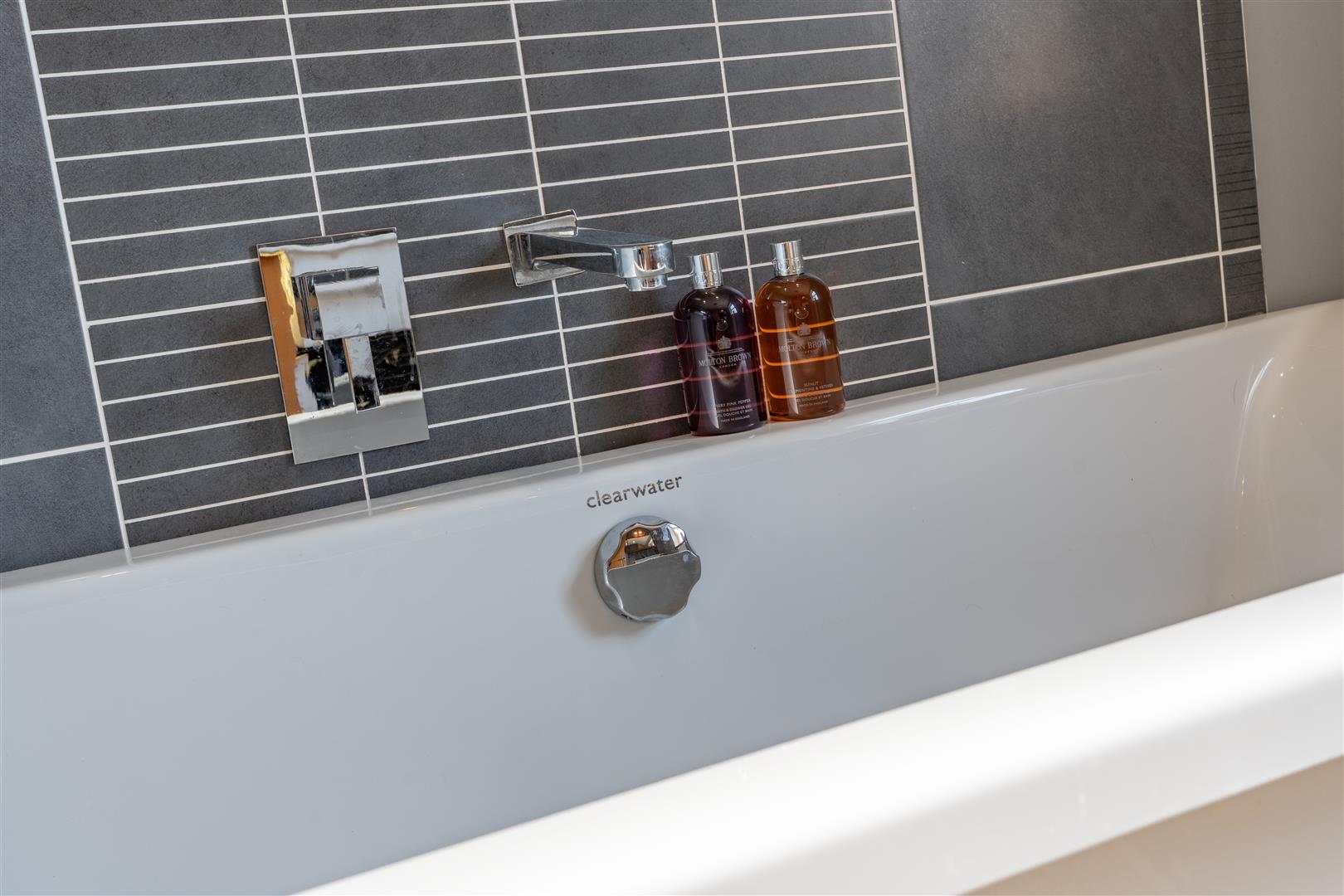 White suite comprising Clearwater freestanding bath with wall mounted chrome mixer taps, low flush WC, vanity unit with Villeroy and Bosch wash hand basin with mixer taps, shelf and cupboard under, matching illuminated mirror over, partly tiled walls, ceramic tiled floor, feature chrome wall mounted radiator, LED spotlighting and extractor fan.